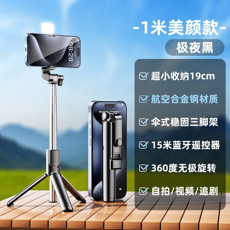 • [다크나이트블랙] 일체형 접이식 여행 필수품 - [클래식 0.70m개 + 필라이트] 블루투스 리모컨 + 플로어 스탠딩 삼각대