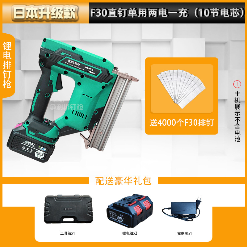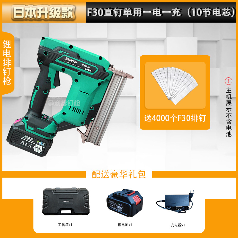 • 일본의 업그레이드된 모델 F30 직선 못은 배터리 2개와 충전기 1개(배터리 10개)만 사용하며 F30 행 못 4,000개가 무료로 제공됩니다.