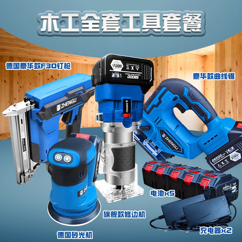 • 목공 도구 전체 세트: 독일 고급 F30 네일 건(무료 F30 못 12,000개) + 고급 직소 + 플래그십 엣지 트리머 + 배터리 2개