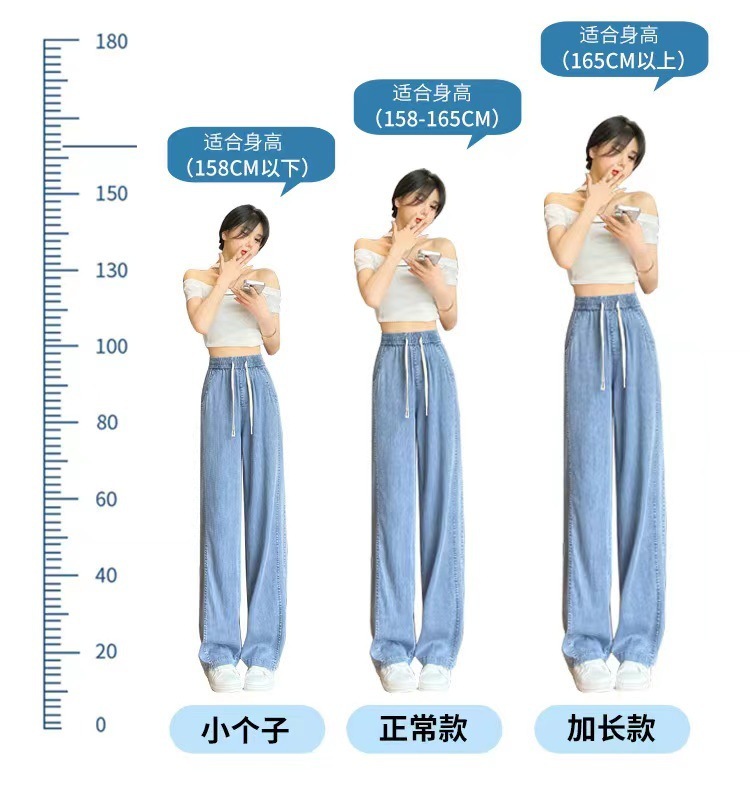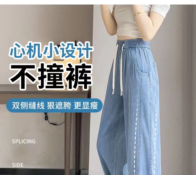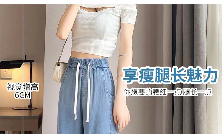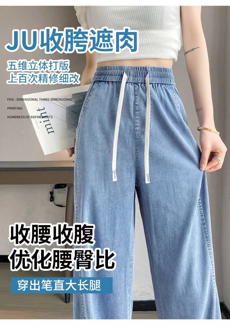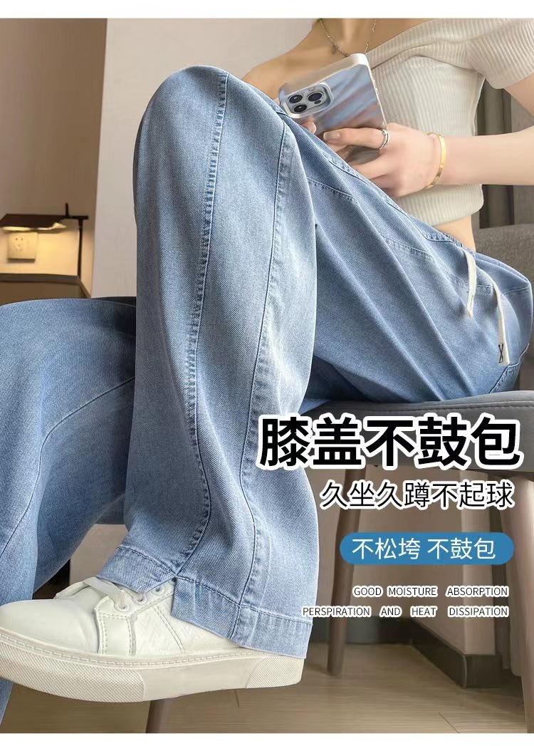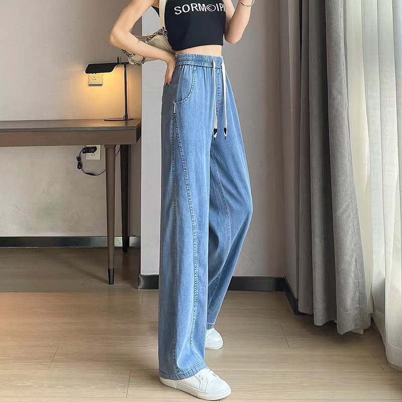 여름 2025 얇은 팔꿈치 허리 텐셀 청바지 여성용 높은 허리 디핑 슬리밍 라이트 컬러 드로우 스트링 슈퍼 소프트 와이드 다리 바지스토어 가기