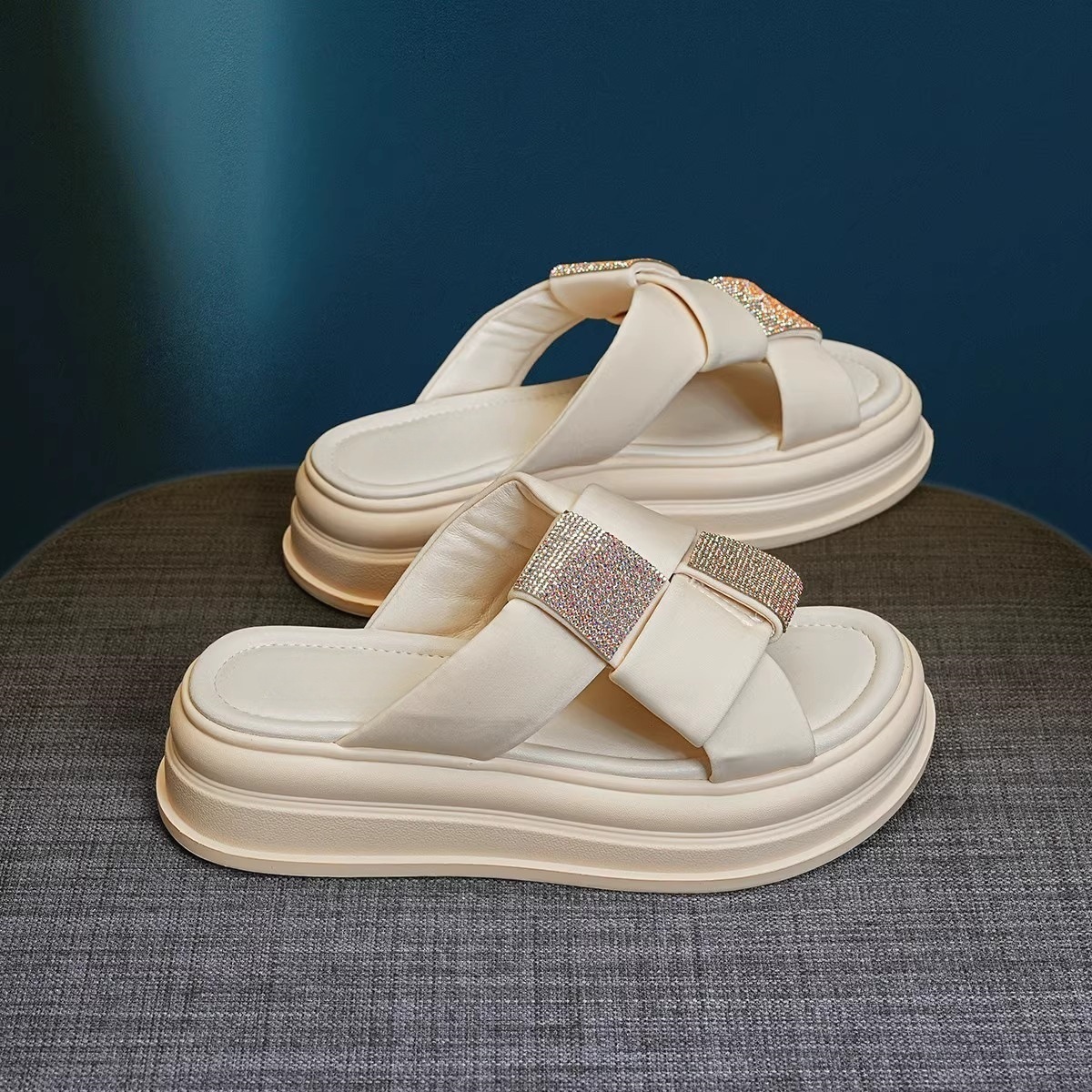 여성을위한 캐주얼 두꺼운 밑창 샌들과 슬리퍼 2025 새로운 여름 하이 엔드 센스 로마 라인 스톤 슬리퍼 우아한 요정 스타일