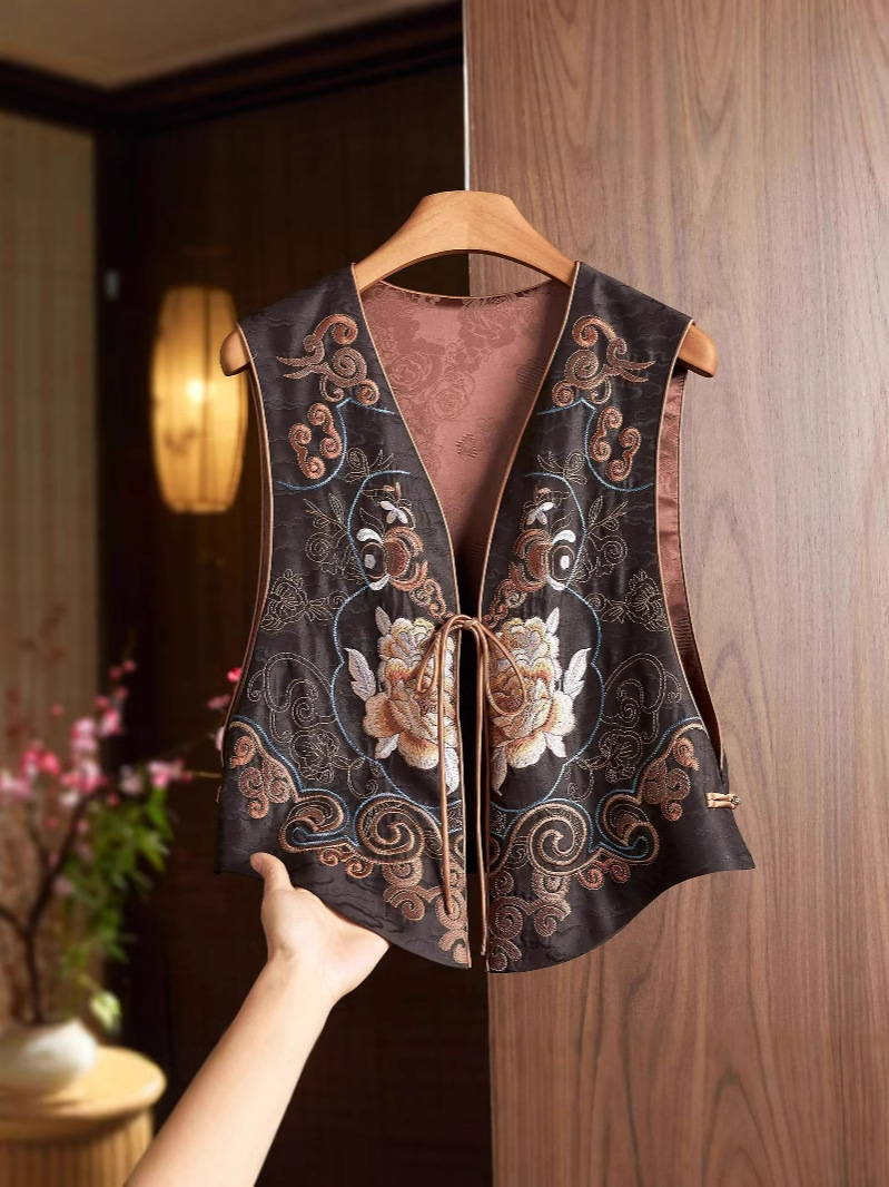 2025 빈티지 새로운 중국 스타일 국가 스타일 개선 된 민족 스타일 자수 양면 V 넥 버클 조끼 탑 여성