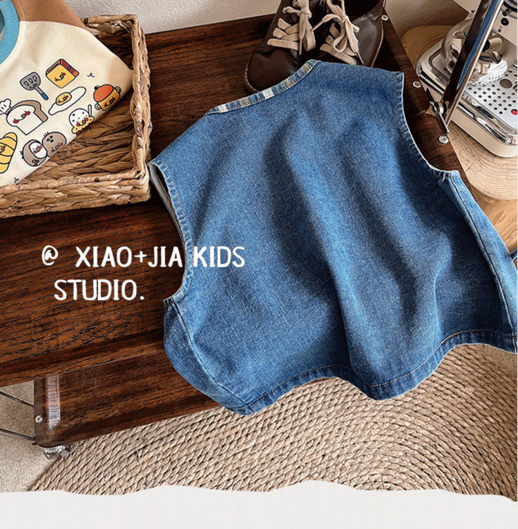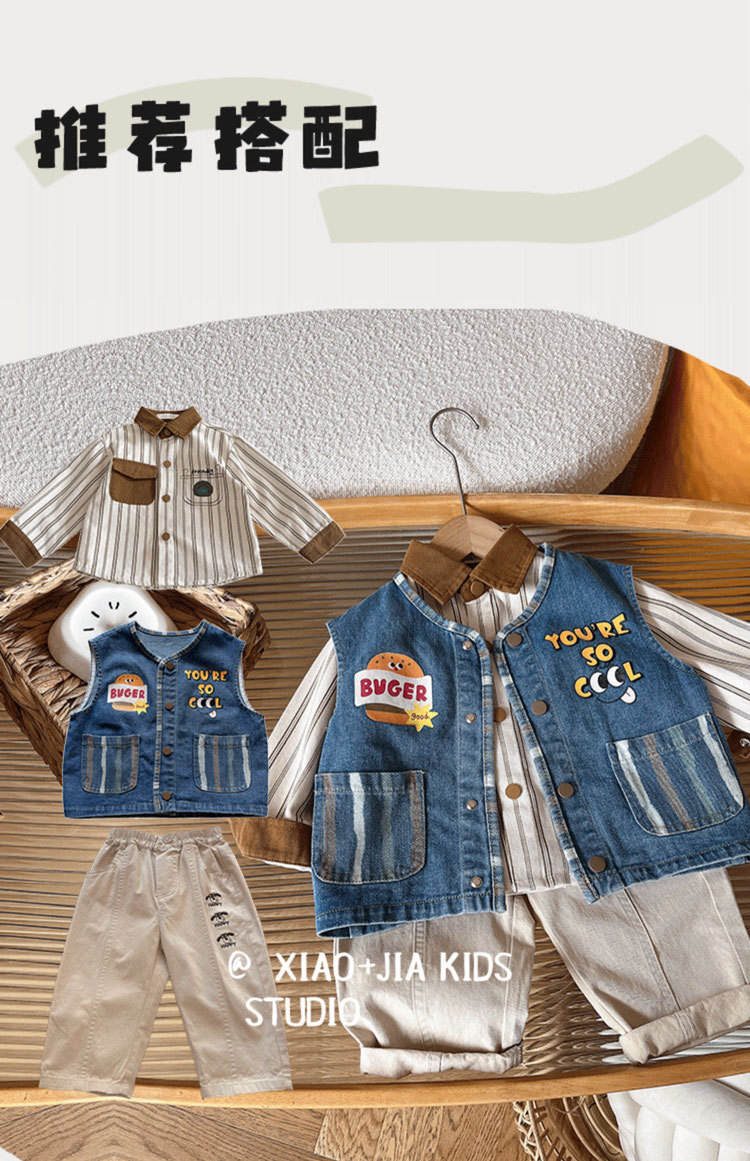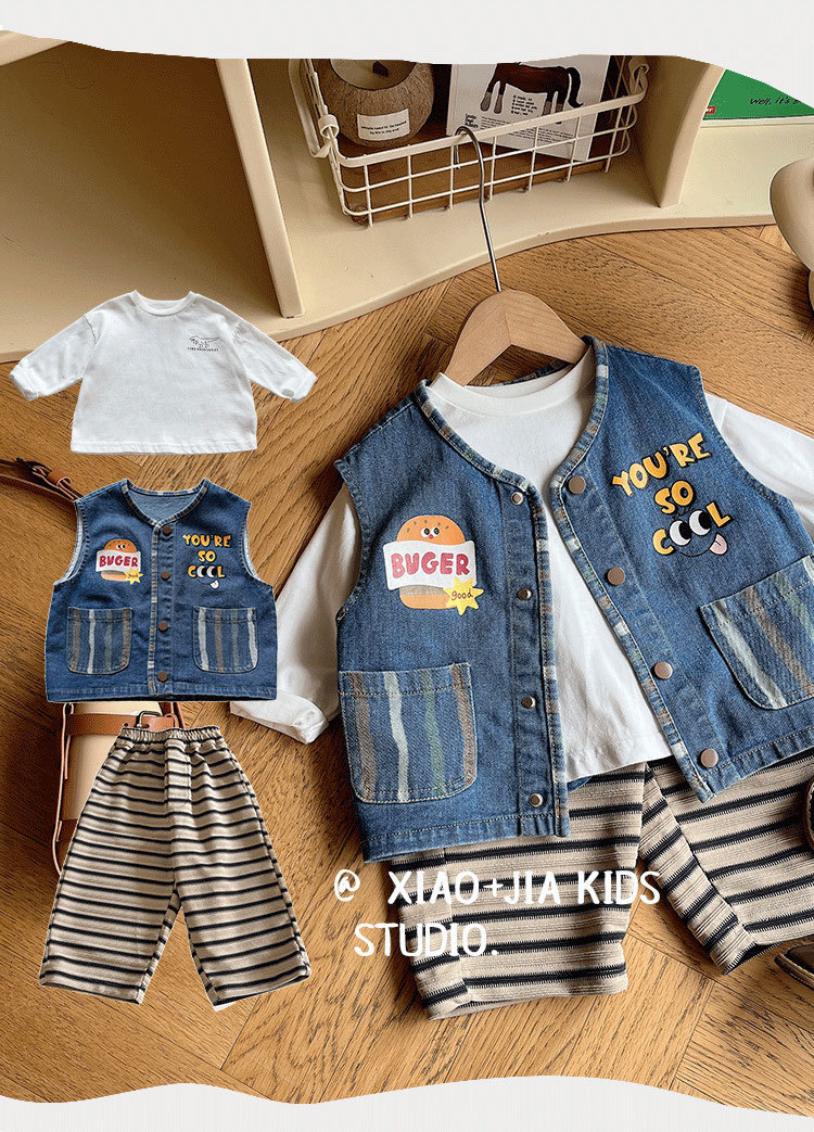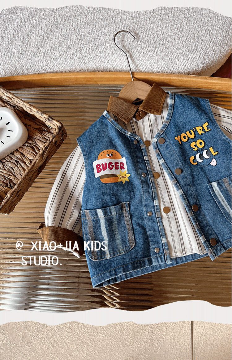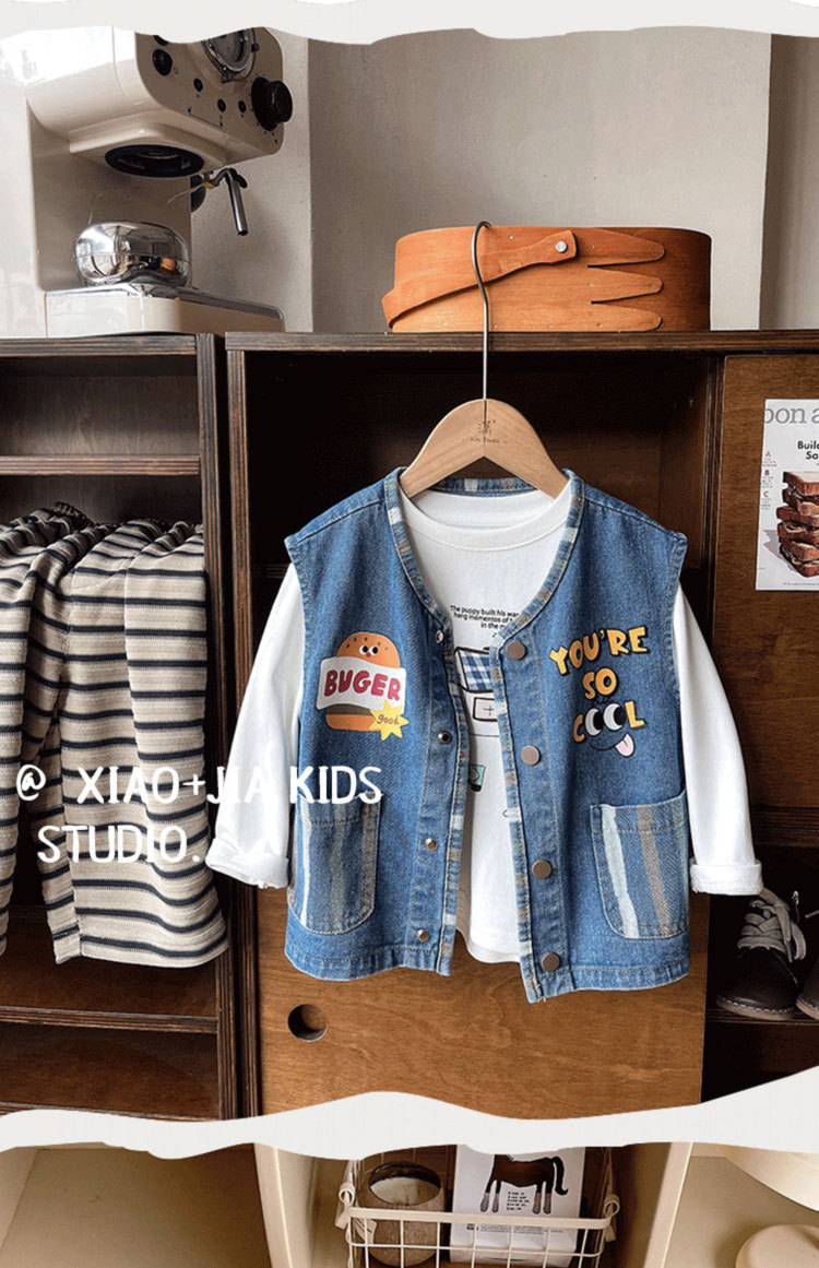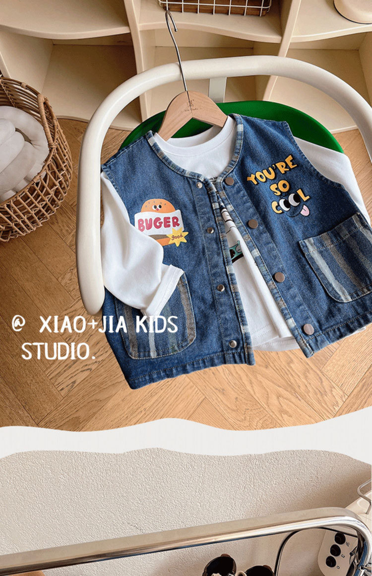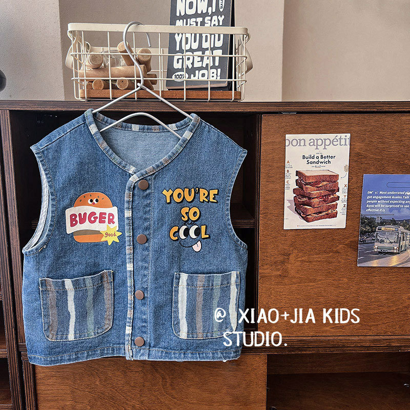 너무 귀여워요~ 버거 프린트 데님 조끼, 남아, 여아 모두 활용도 높고 멋스러운 민소매