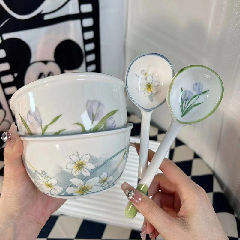 작은 신선한 수선화 튤립 유약 컬러 긴 손잡이 도자기 숟가락 세라믹 그릇 가정용 두꺼운 가장자리 먹는 그릇 2 그릇 2 스푼