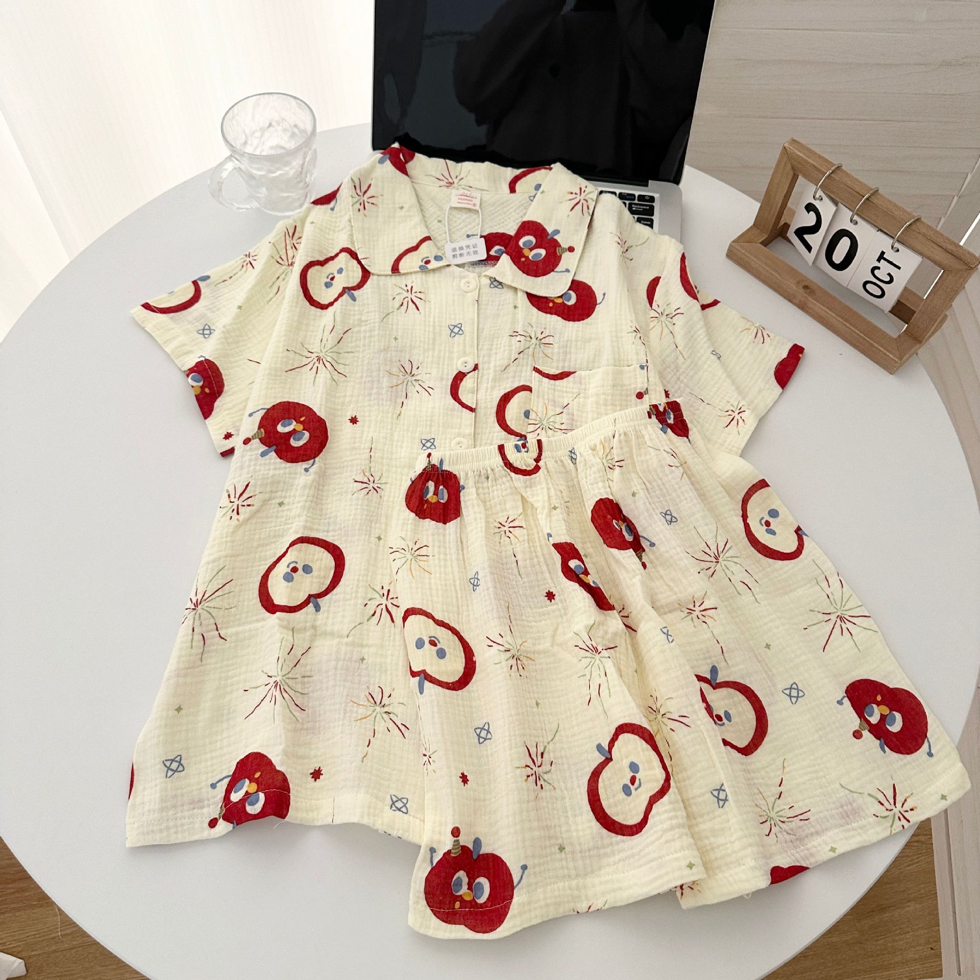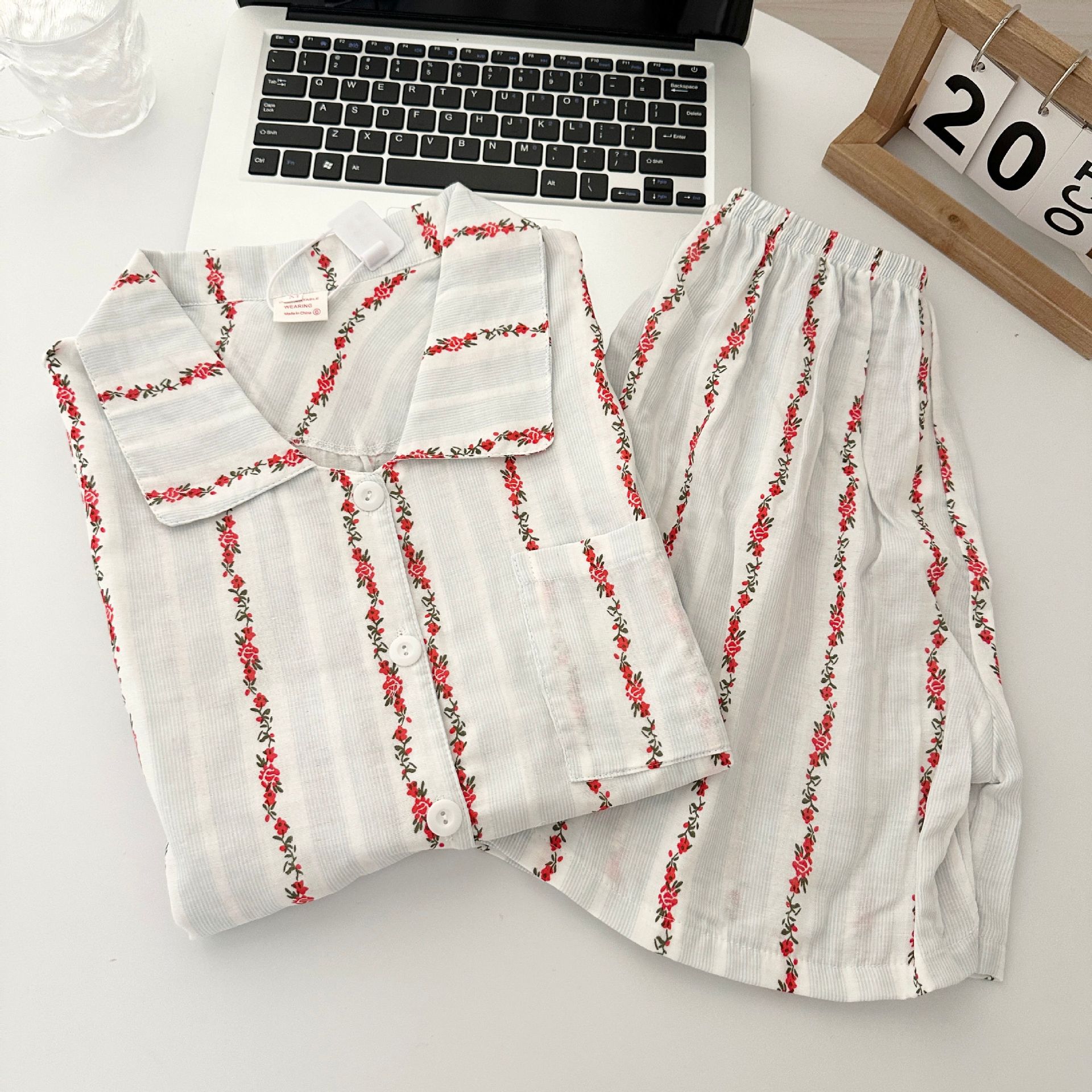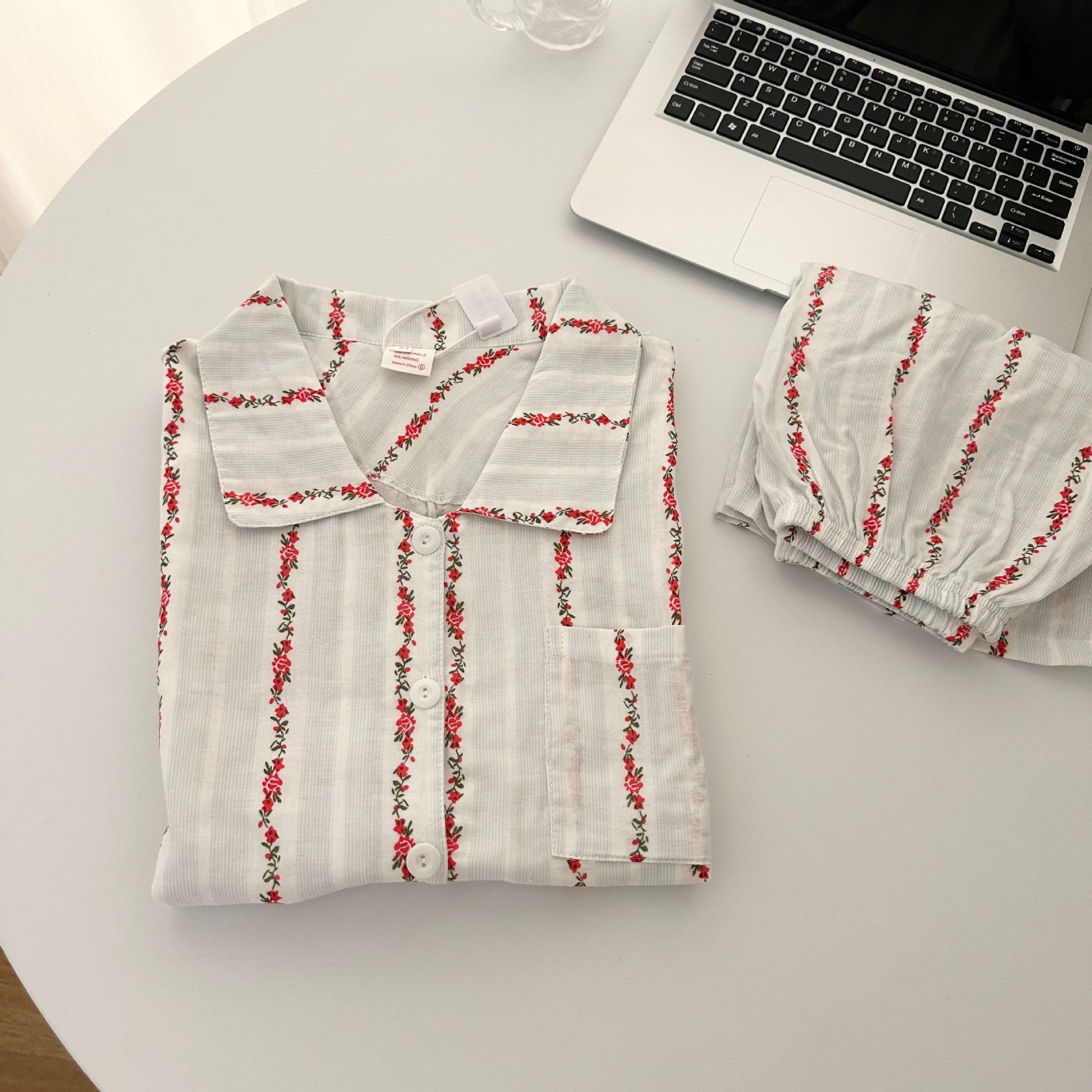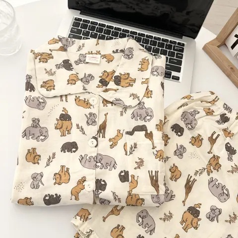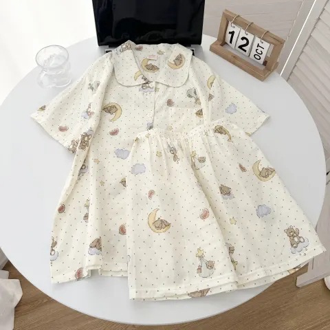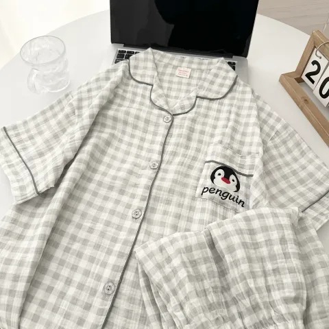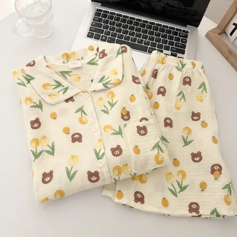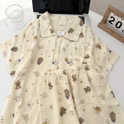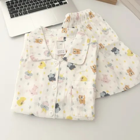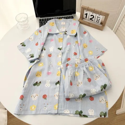 빈티지 줄무늬 꽃 잠옷 여성의 여름 새로운 반팔 더블 레이어 순수 코튼 원사 얇은 학생 홈 의류 세트스토어 가기