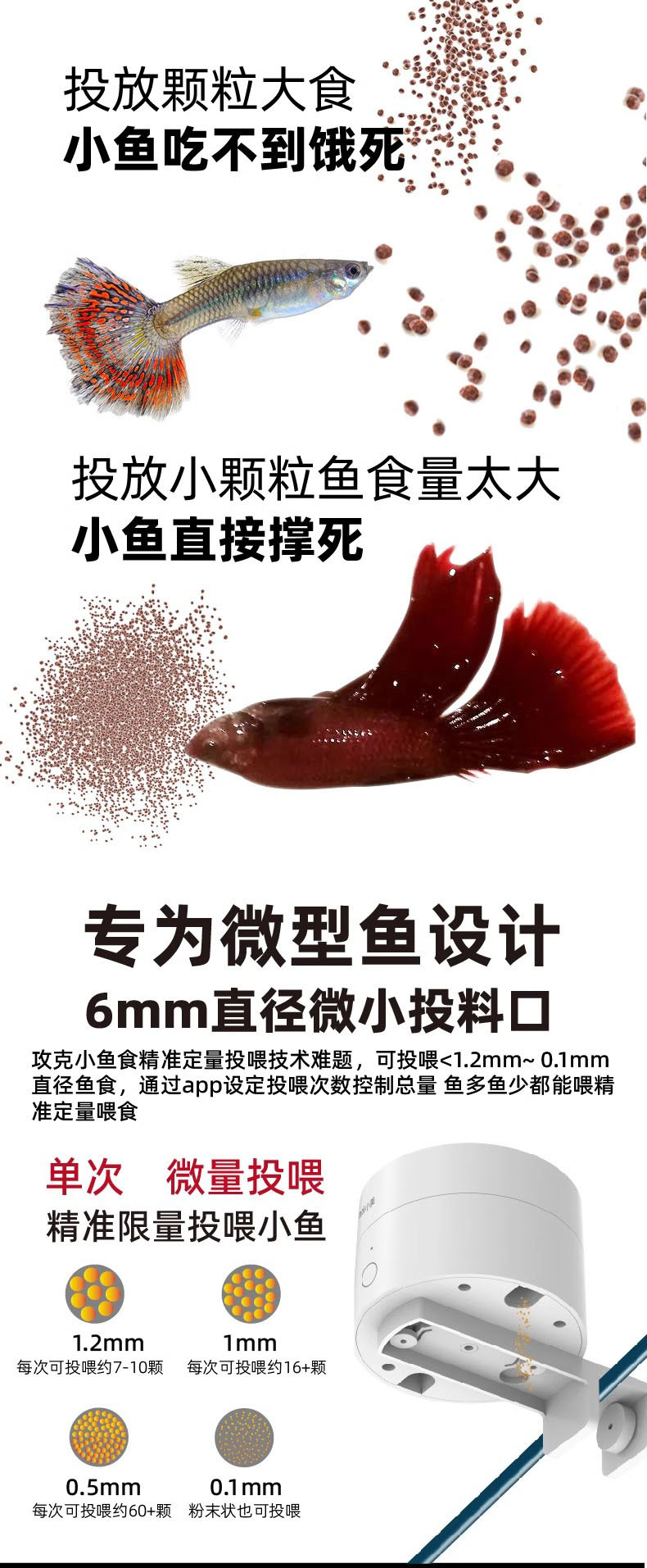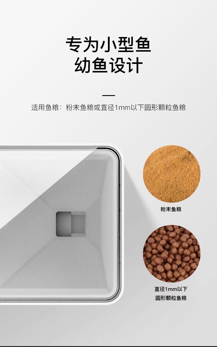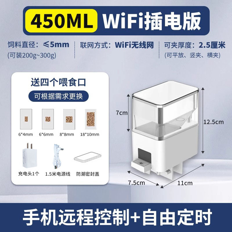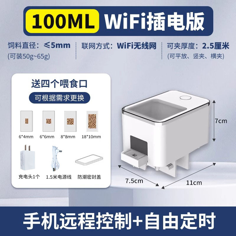 • Wi-Fi 플러그인 모델, 단일 배출구, 1mm 이내의 물고기 먹이 공급 가능
