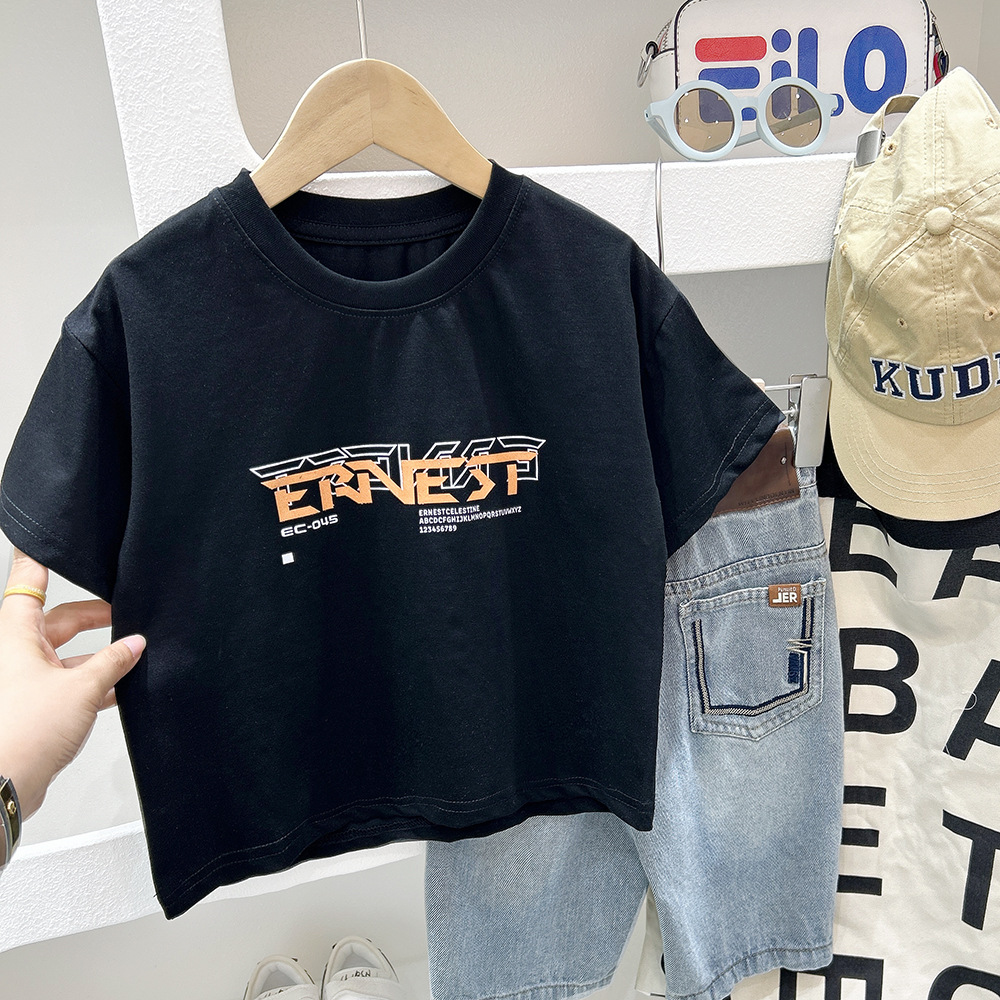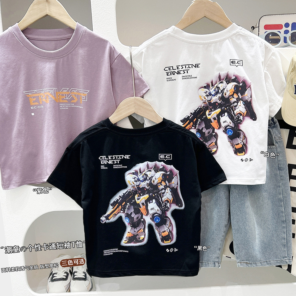 2025 여름 한국 아동복 큰 소년 만화 둥근 목 반팔 티셔츠 어린이의 얇은 느슨한베이스 셔츠