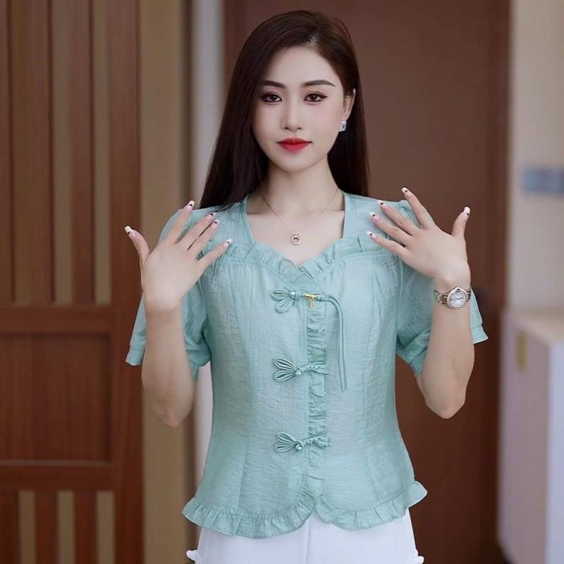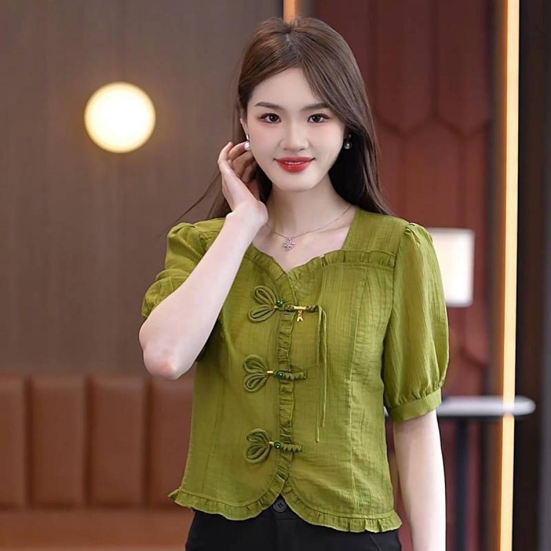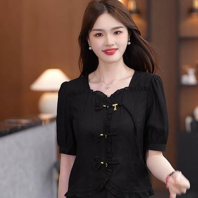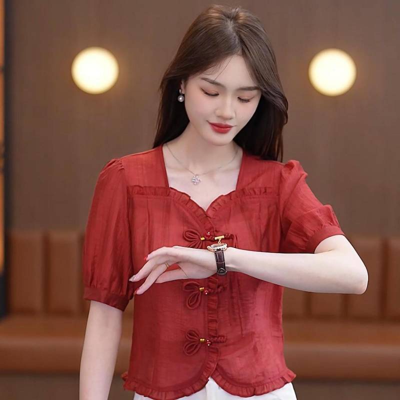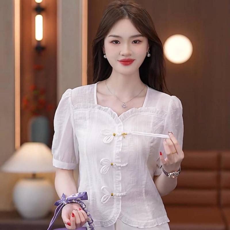 빈티지 반팔 쉬폰 셔츠 여성의 2025 여름 새로운 스타일 디자인 센스 중국 스타일 나이 감소 니치 탑 웨스턴 스타일 작은 셔츠스토어 가기