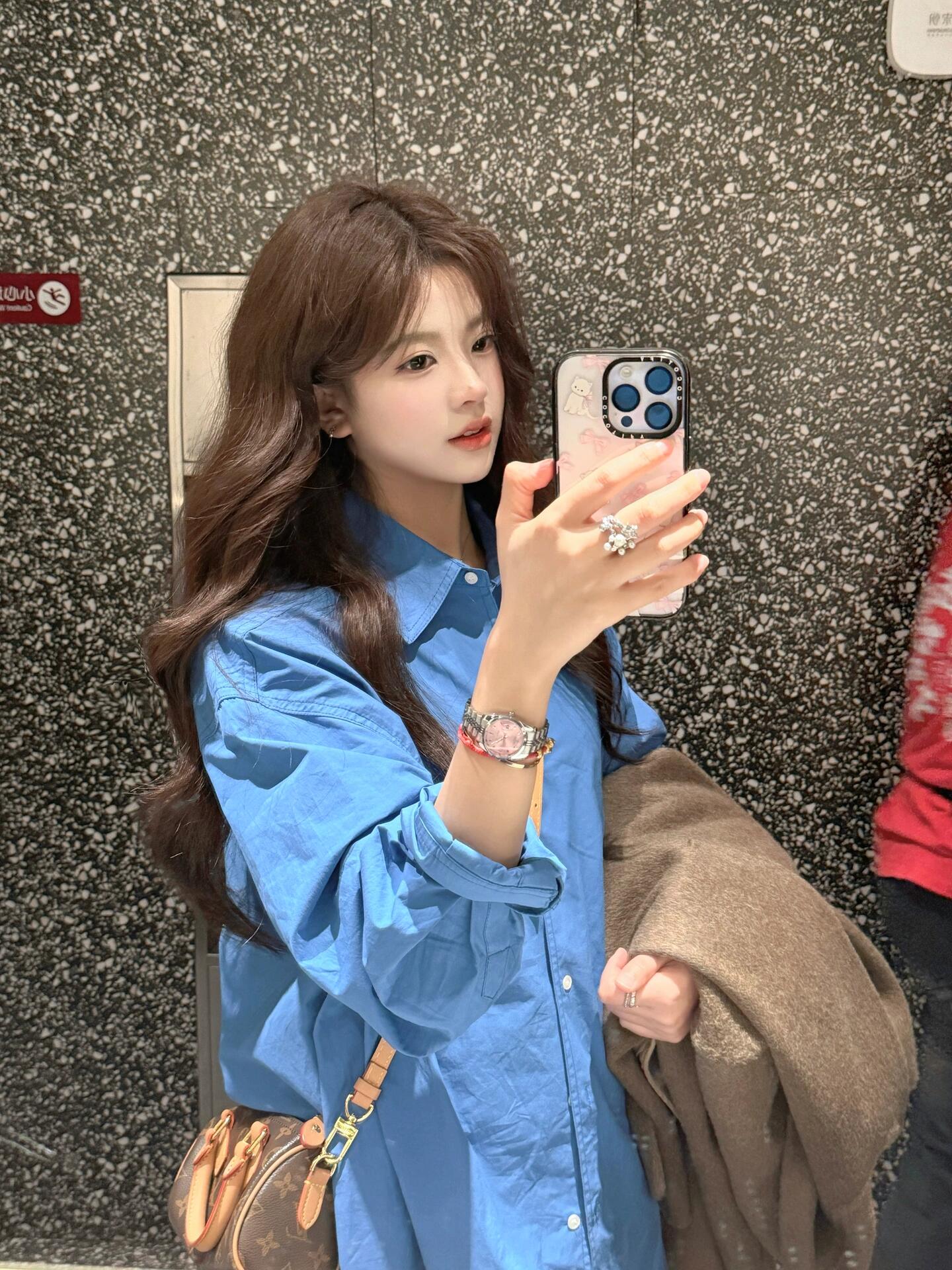 한국 스타일 2025 블루 셔츠 코트 여성의 봄 느슨한 긴팔 우아한 슈퍼 잘 생긴 게으른 스타일 셔츠 탑스토어 가기