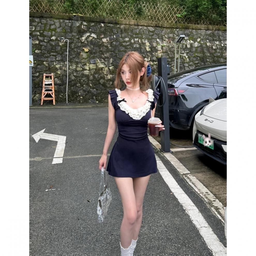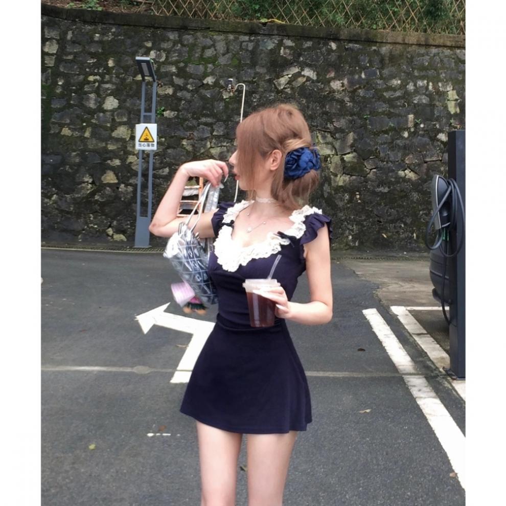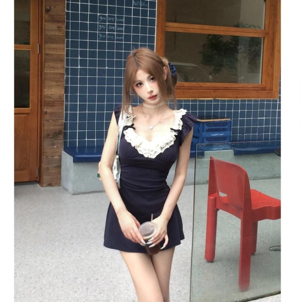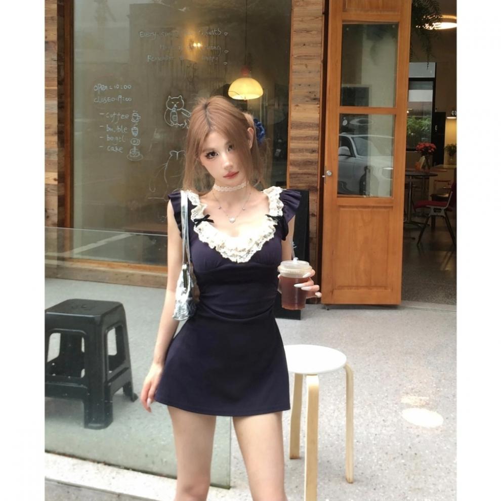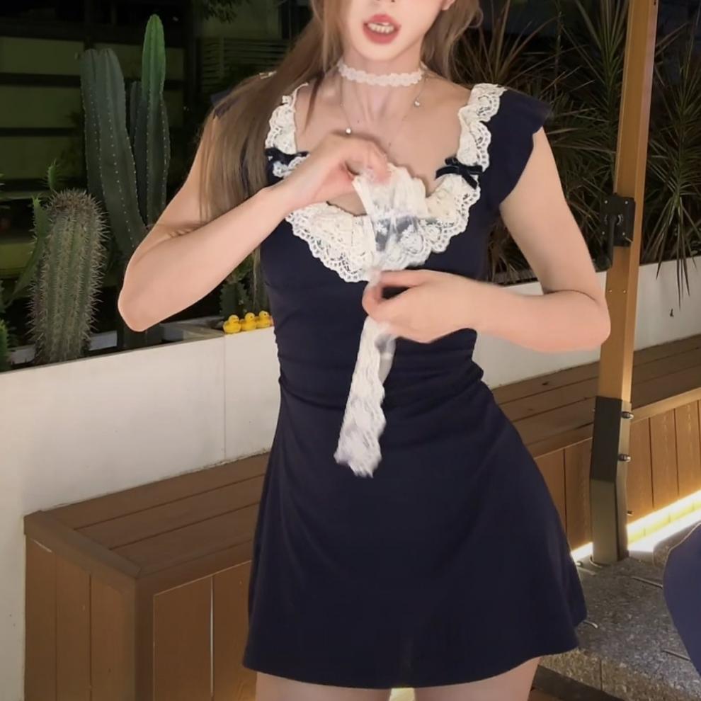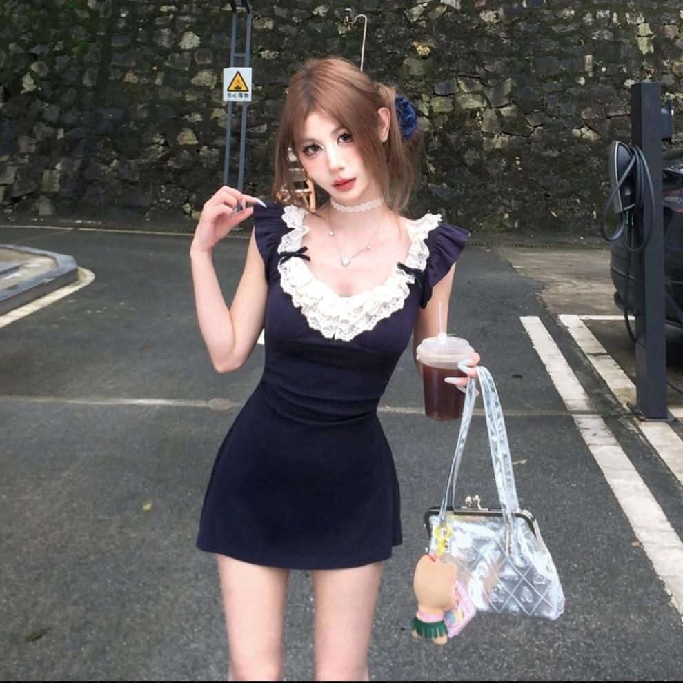 레이스 스티칭 스파이스 소녀 원피스 디자인 센스 페이 페이 슬리브 원피스 여성 여름 연예인 욕망 바람 허리스토어 가기