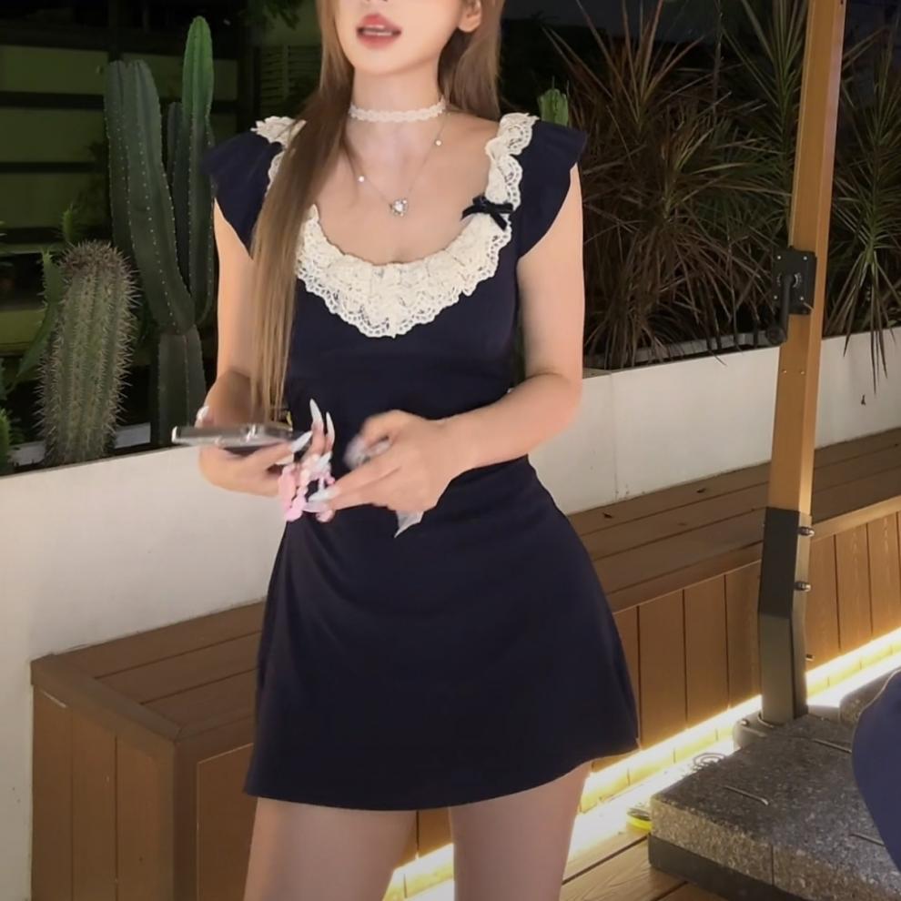 레이스 스티칭 스파이스 소녀 원피스 디자인 센스 페이 페이 슬리브 원피스 여성 여름 연예인 욕망 바람 허리