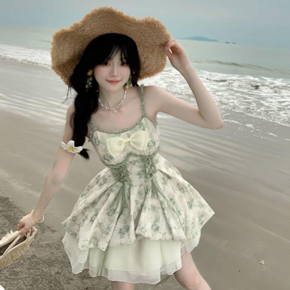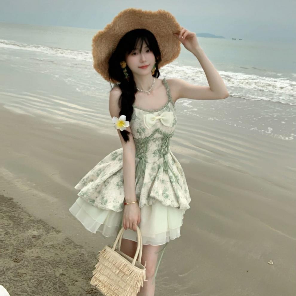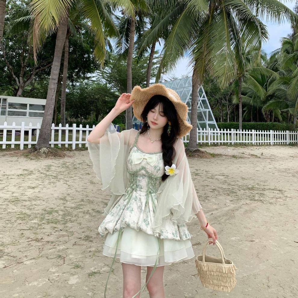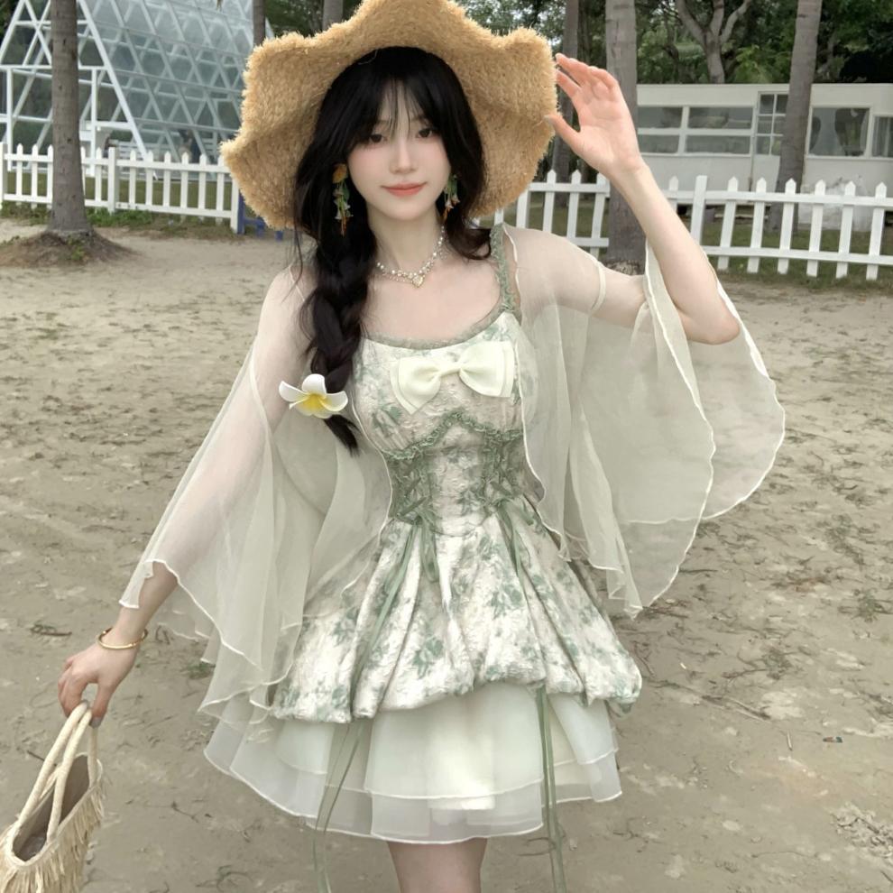 [] 봄 새로운 엘프 숲 허리 공주 고삐 스커트 썬 스크린 슬림 카디건 투피스 세트스토어 가기