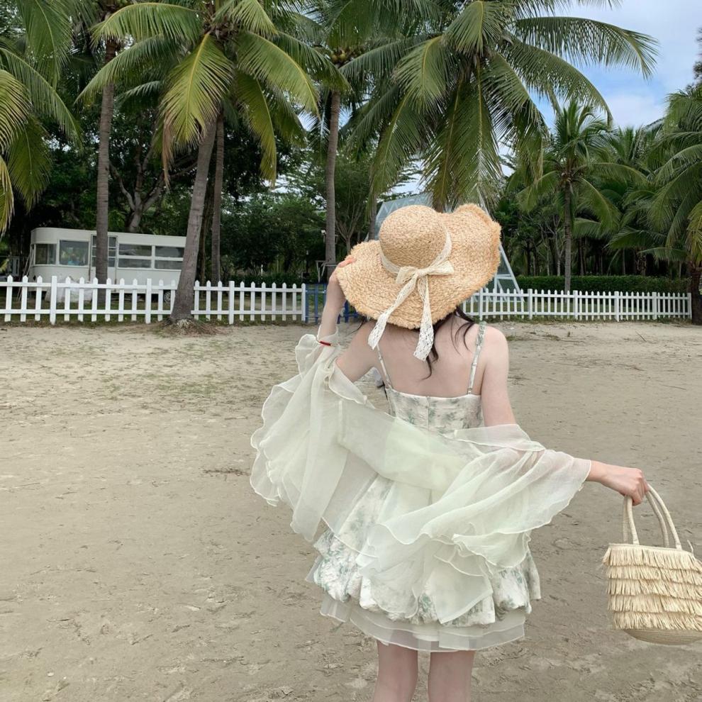 [] 봄 새로운 엘프 숲 허리 공주 고삐 스커트 썬 스크린 슬림 카디건 투피스 세트