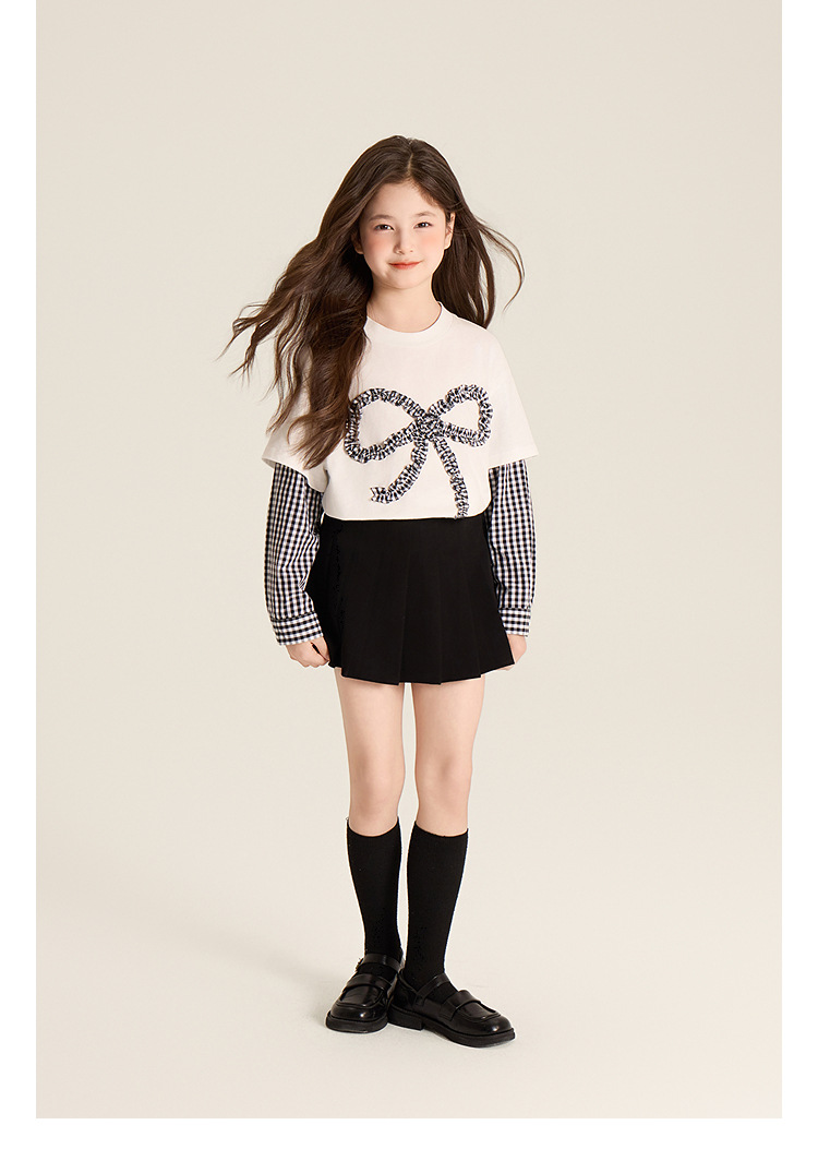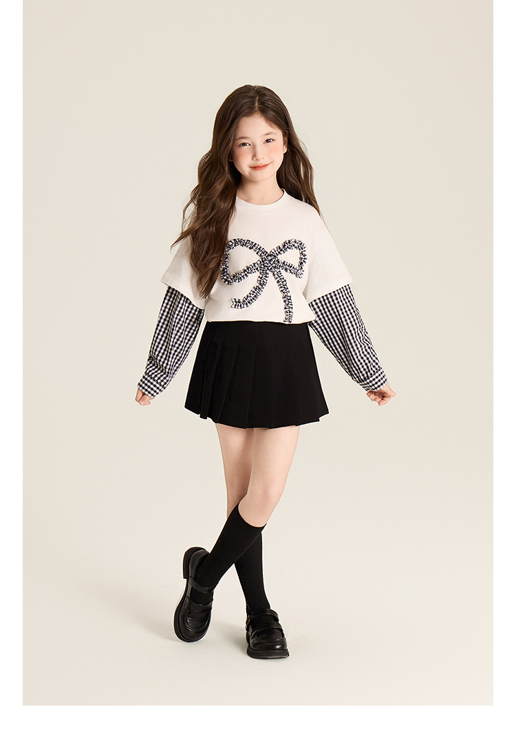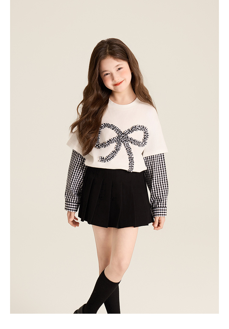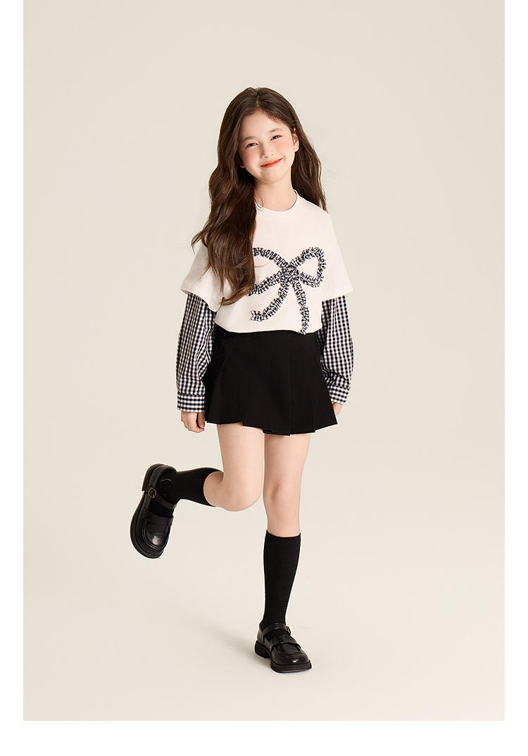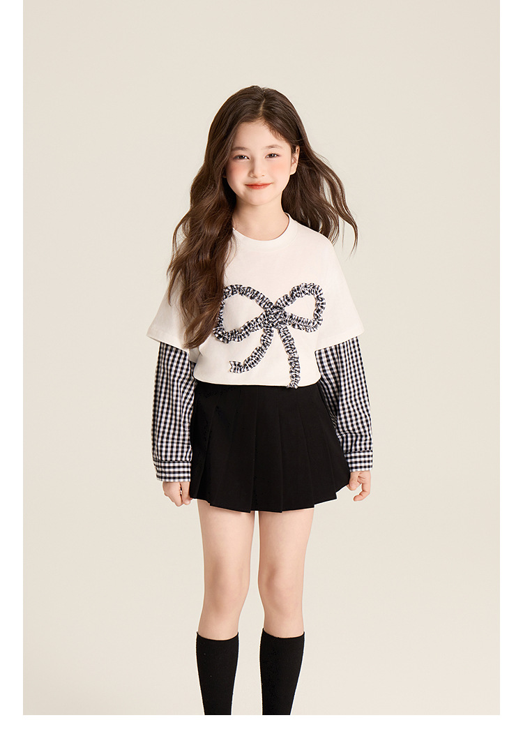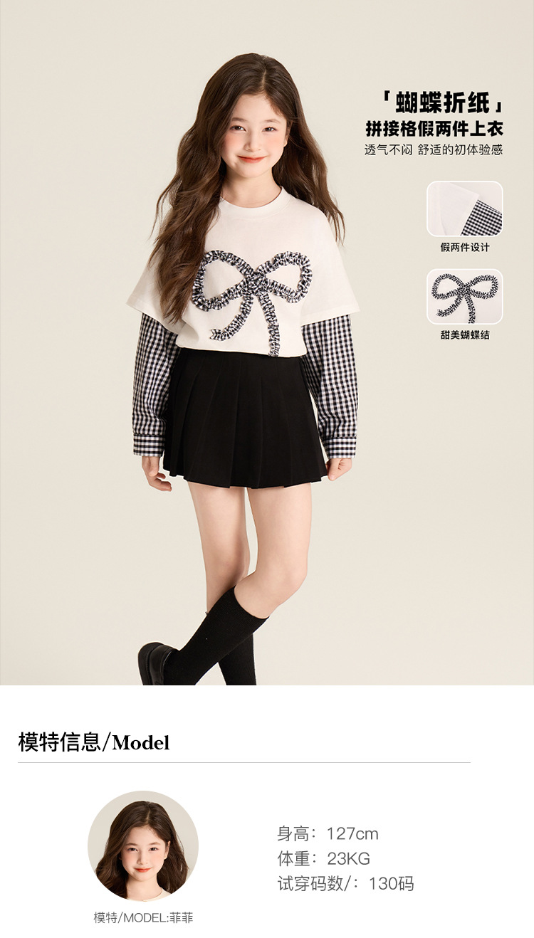 Amybaby Girls 'Top Spring 2025 새로운 디자인 활 격자 무늬 바느질 가짜 투피스 긴팔 T스토어 가기