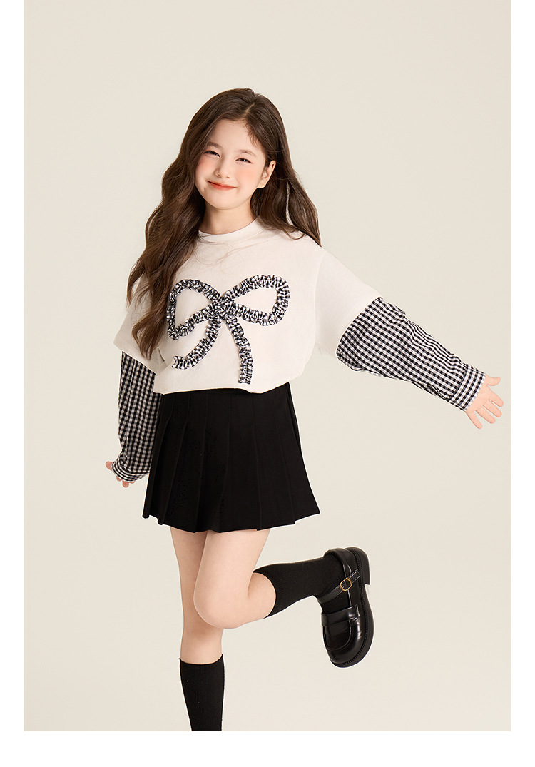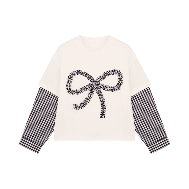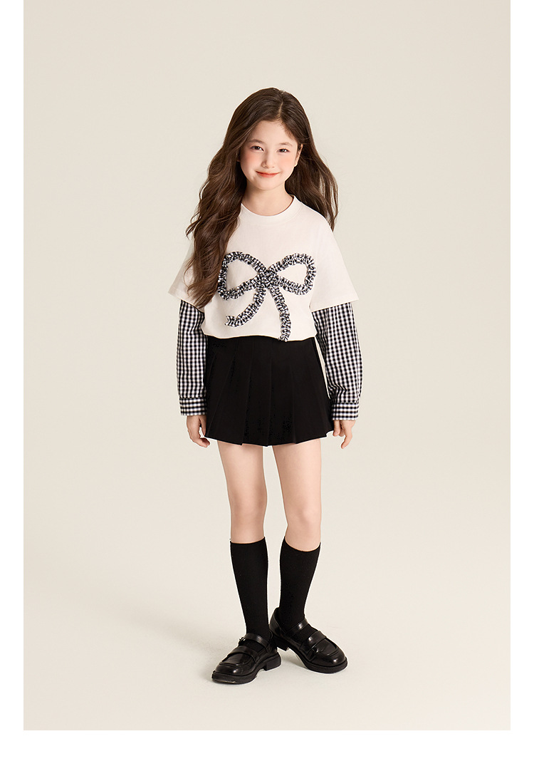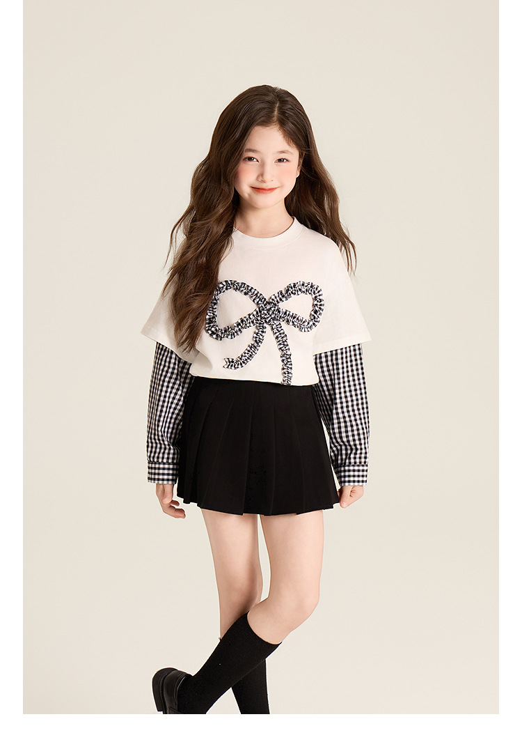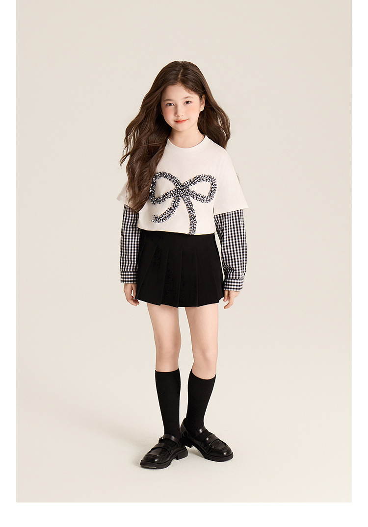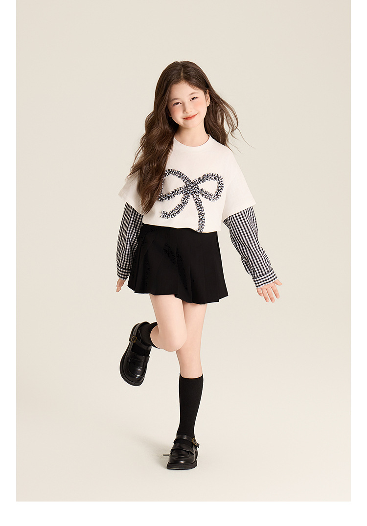 Amybaby Girls 'Top Spring 2025 새로운 디자인 활 격자 무늬 바느질 가짜 투피스 긴팔 T스토어 가기