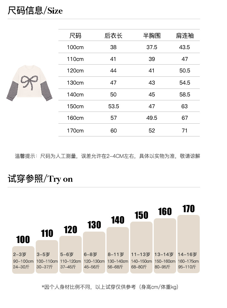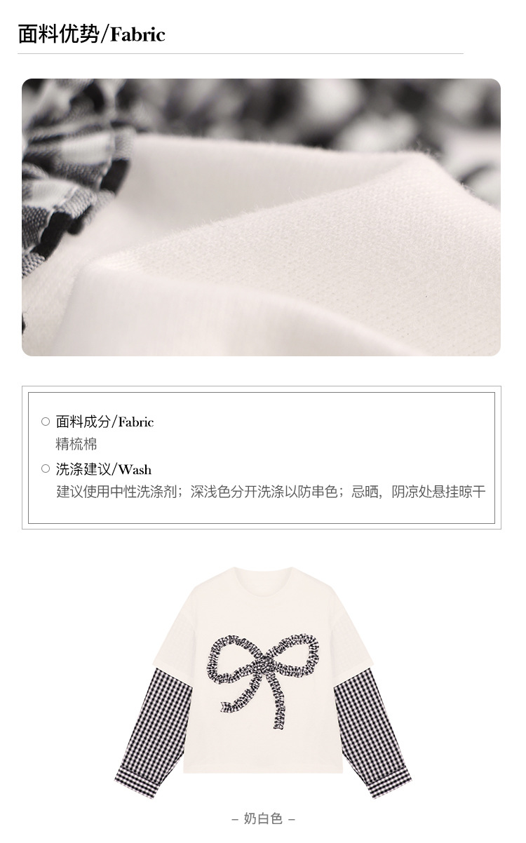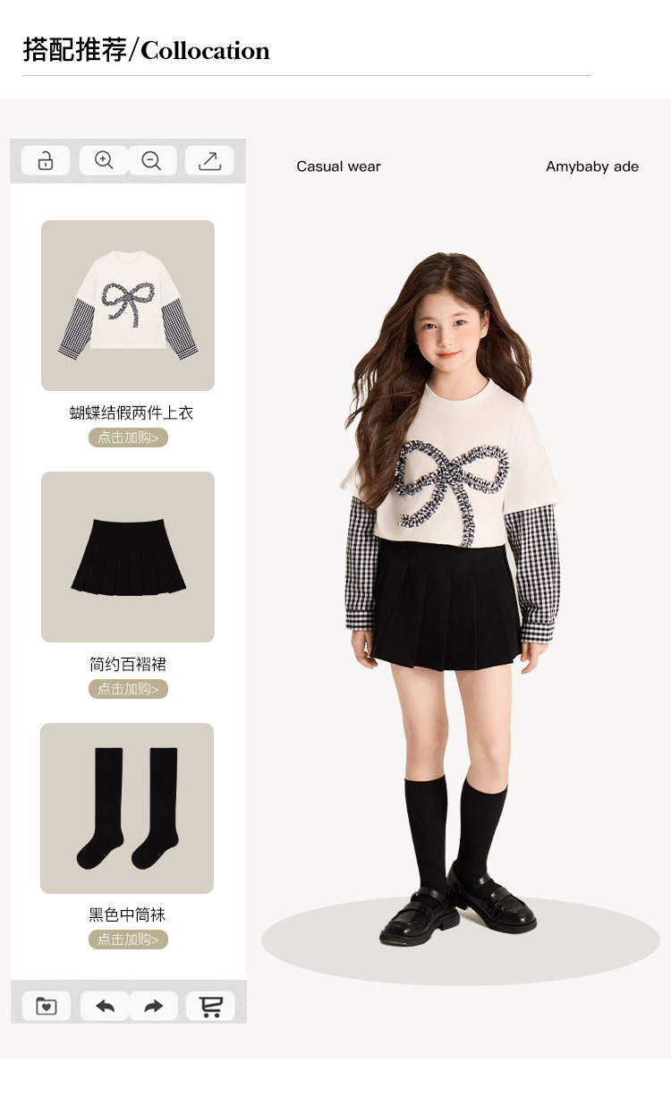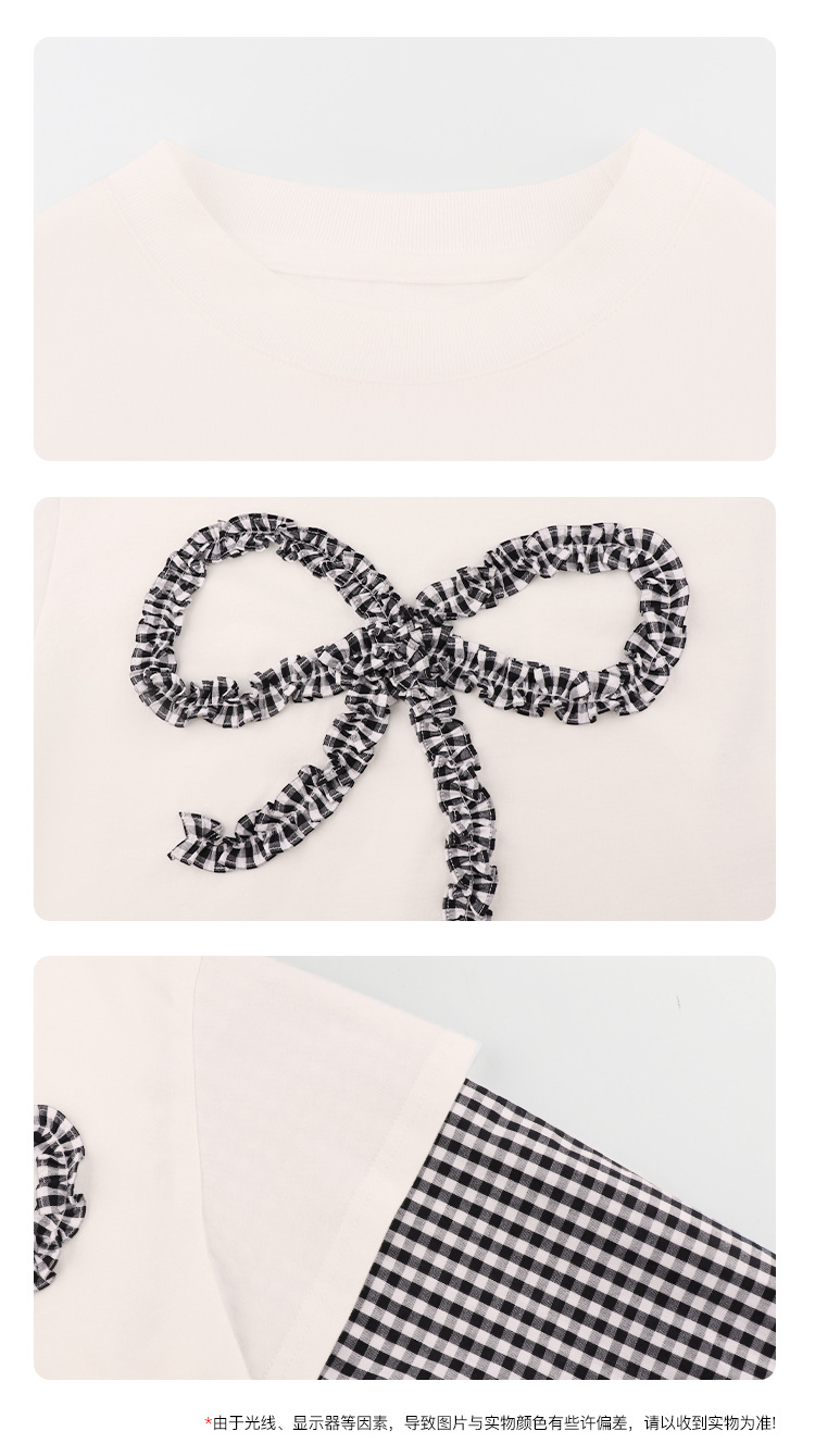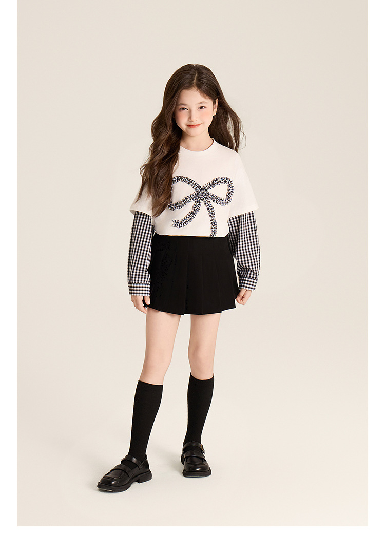 Amybaby Girls 'Top Spring 2025 새로운 디자인 활 격자 무늬 바느질 가짜 투피스 긴팔 T스토어 가기