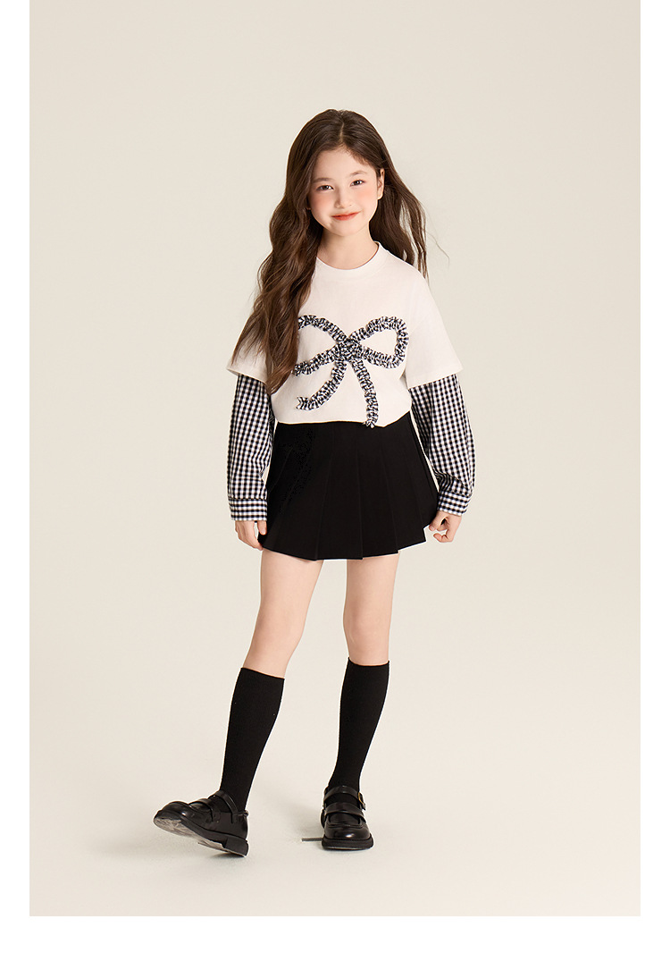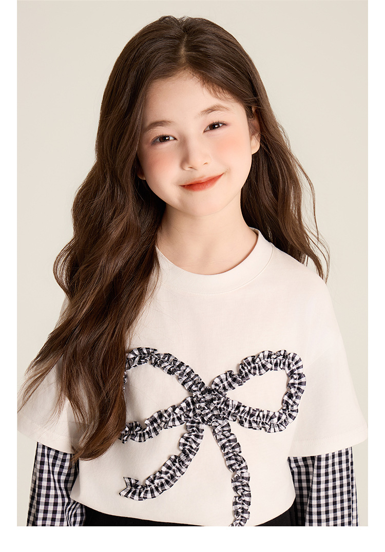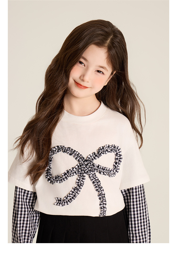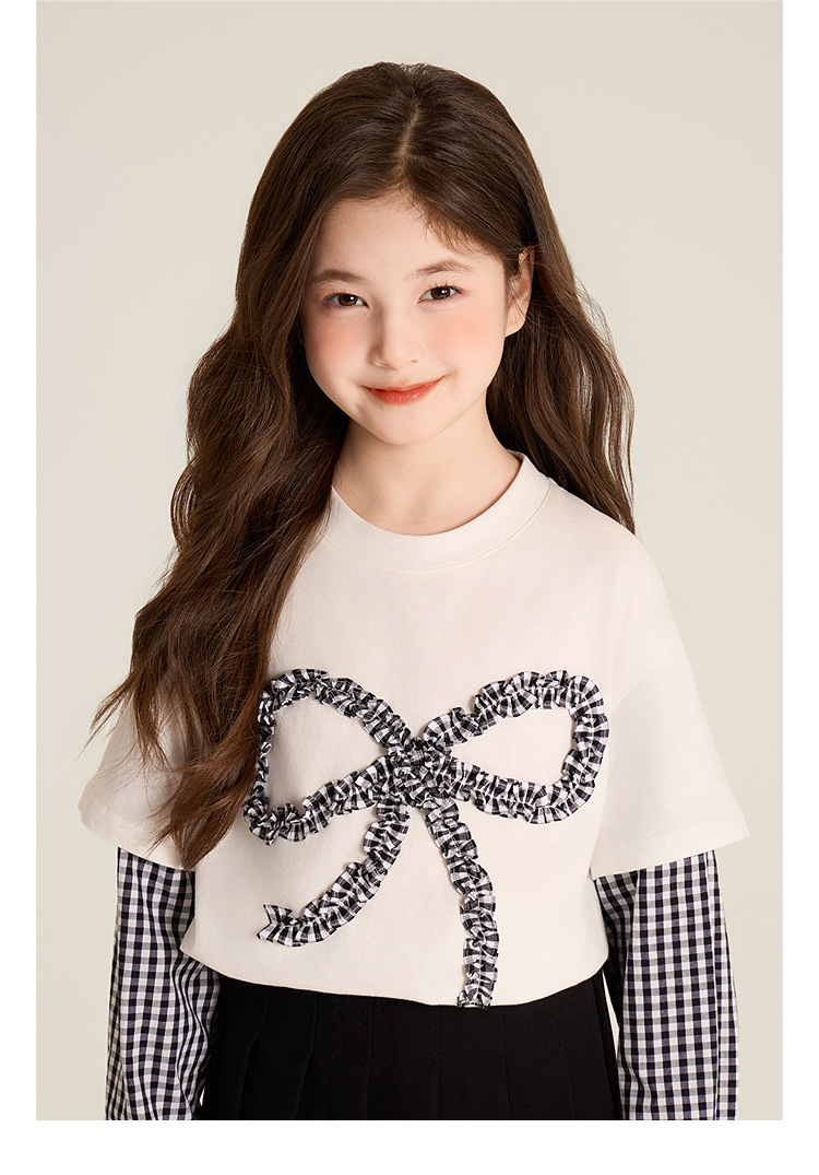 Amybaby Girls 'Top Spring 2025 새로운 디자인 활 격자 무늬 바느질 가짜 투피스 긴팔 T