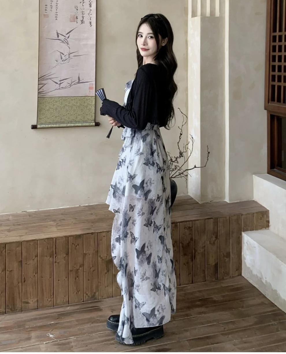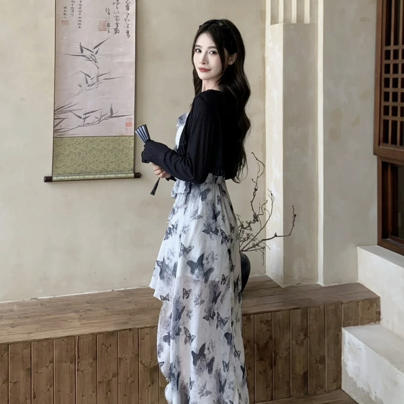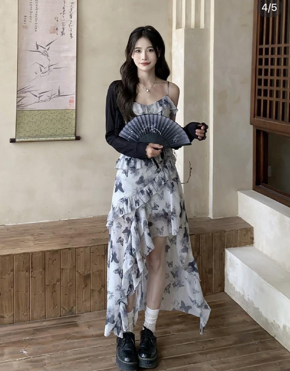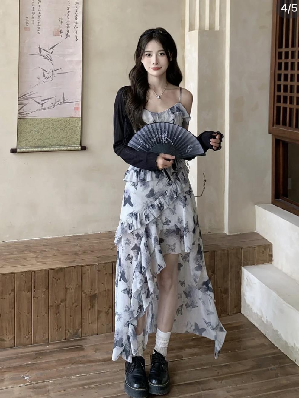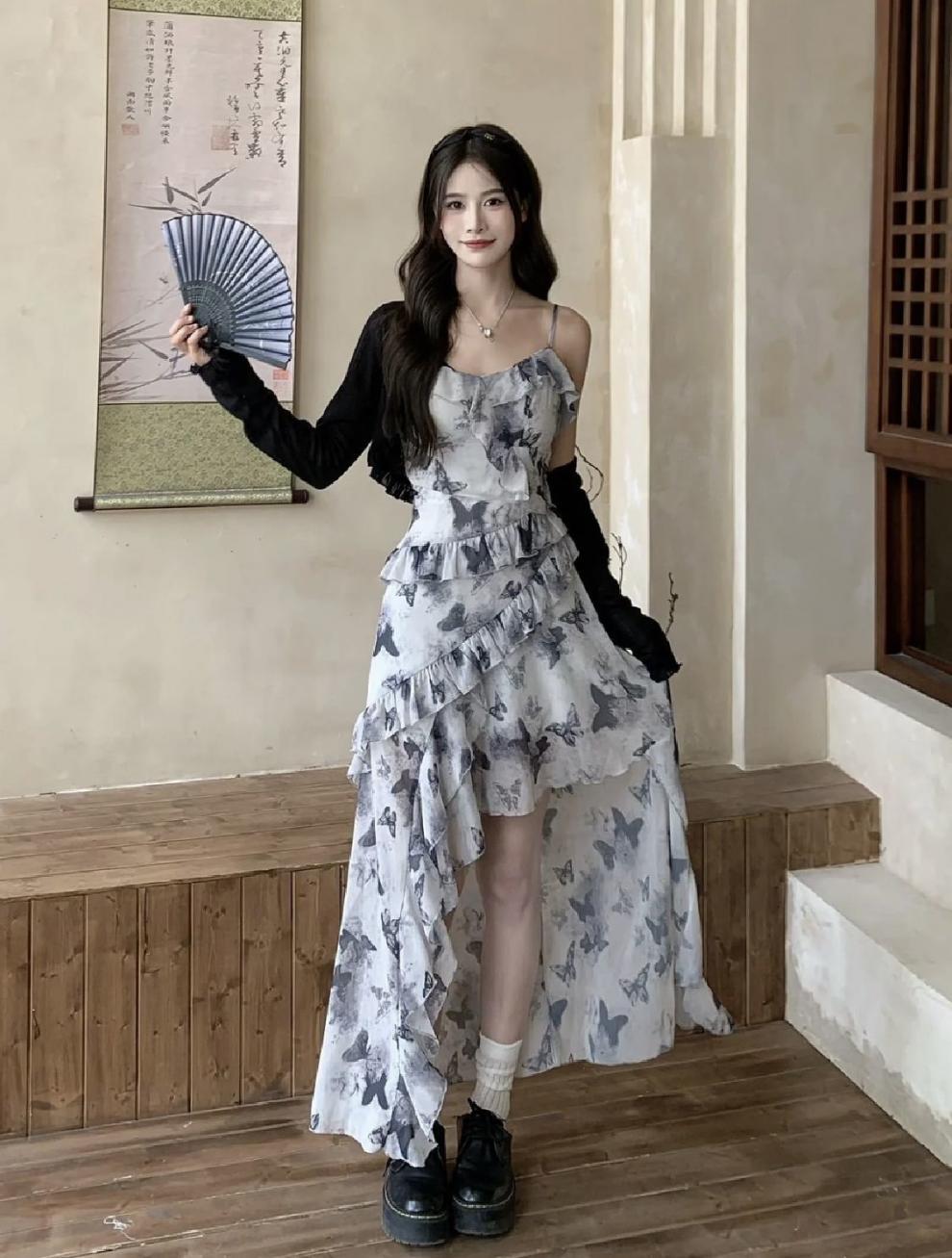 나비 치마 꽃 불규칙한 슬립 스커트 2025 봄과 여름 원피스 러플 스커트 태양 보호 카디건 투피스 세트스토어 가기