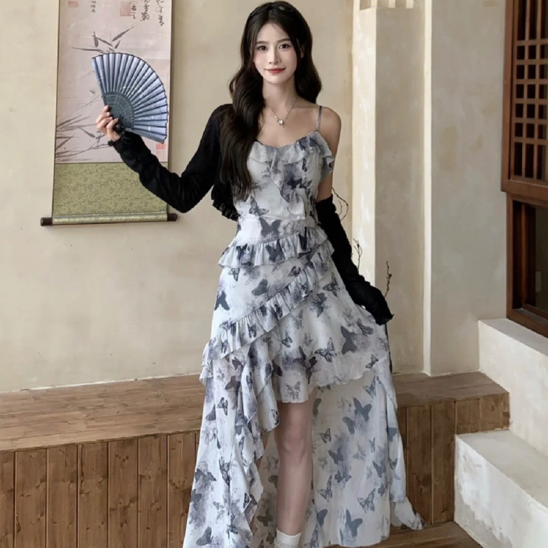 나비 치마 꽃 불규칙한 슬립 스커트 2025 봄과 여름 원피스 러플 스커트 태양 보호 카디건 투피스 세트