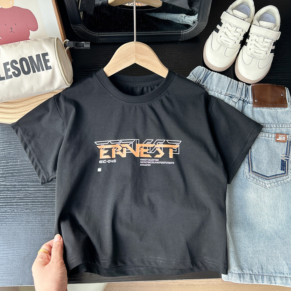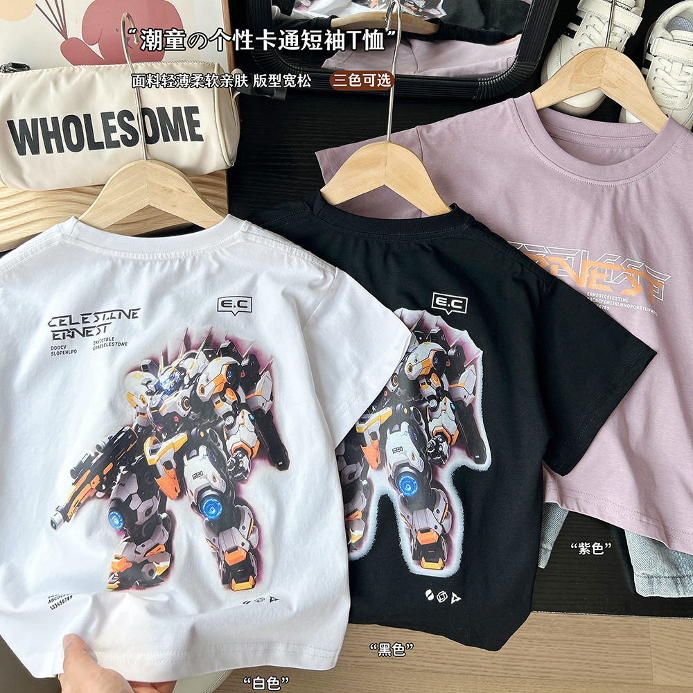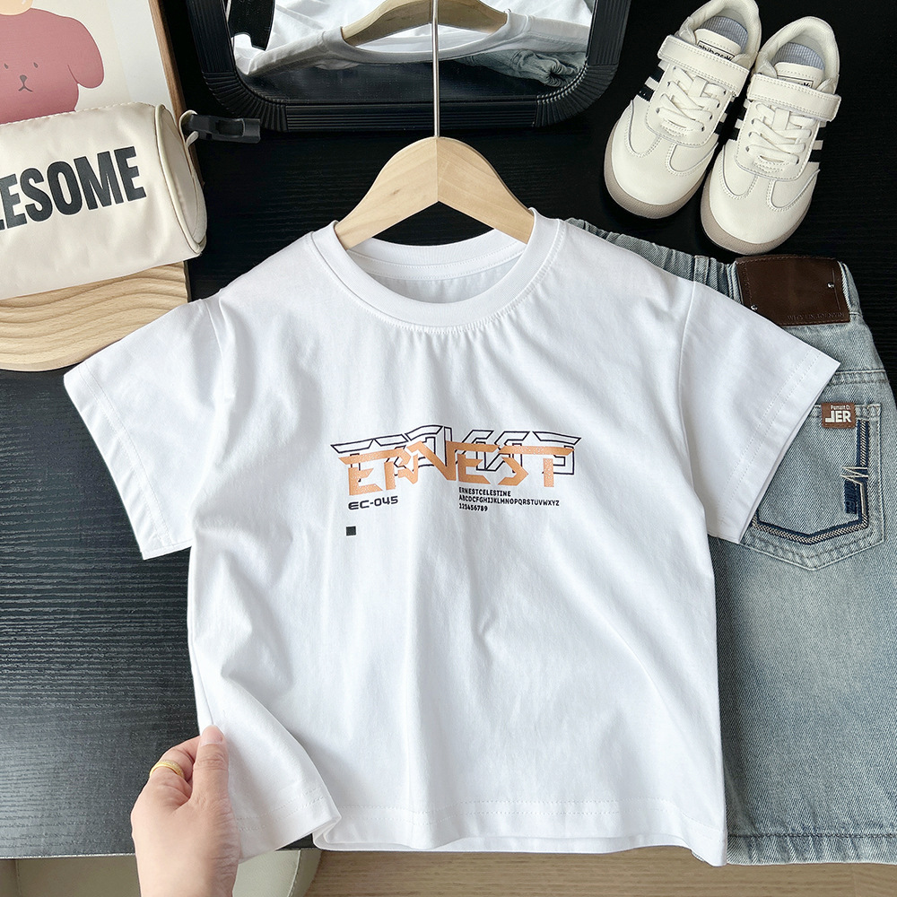 2025 새로운 여름 아동복 소년 어린이 인쇄 만화 소년 짧은 소매 티셔츠 흰색 T 짧은 소매 도매 세대 헤어스토어 가기