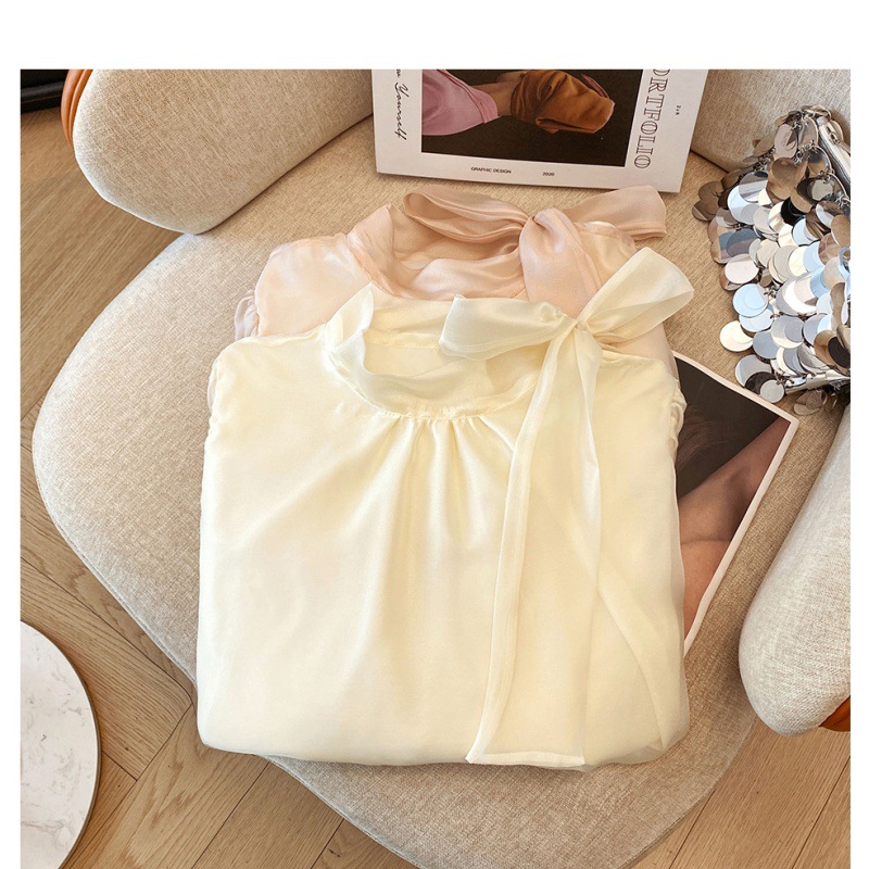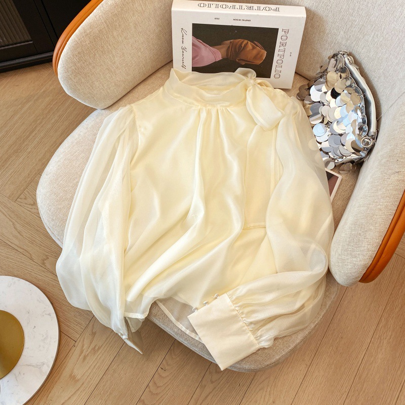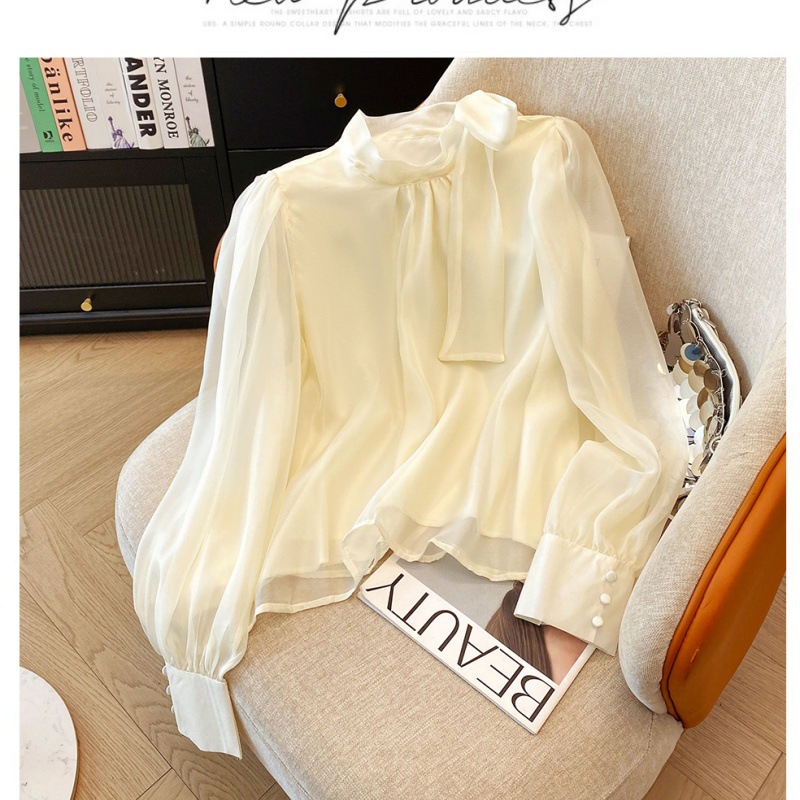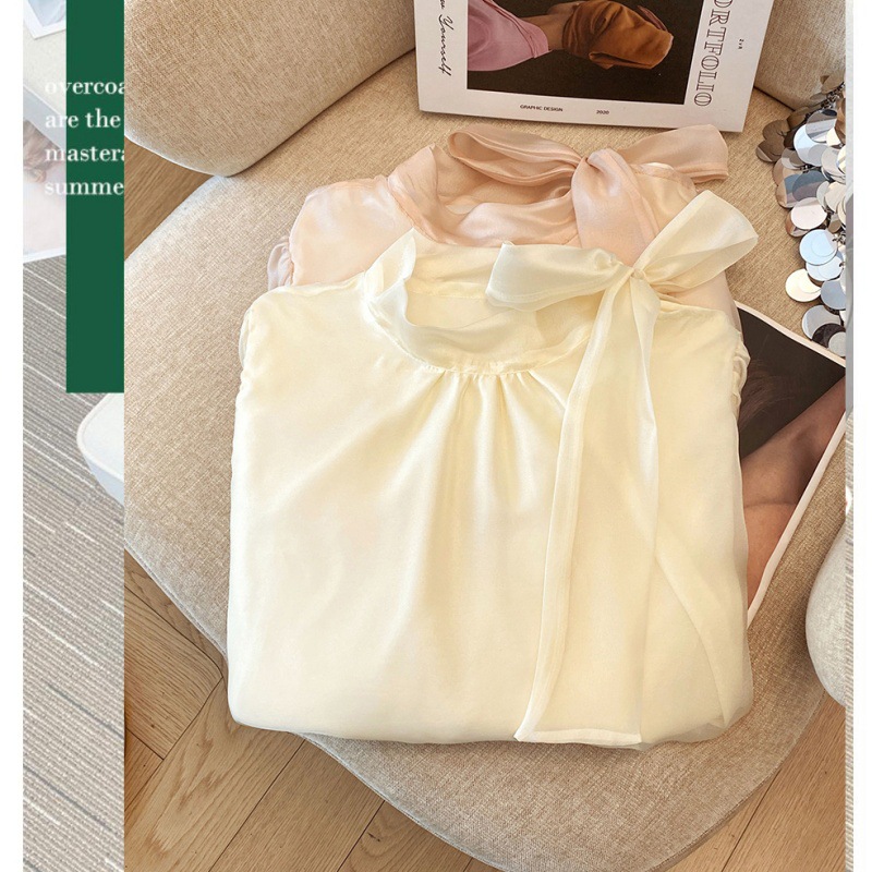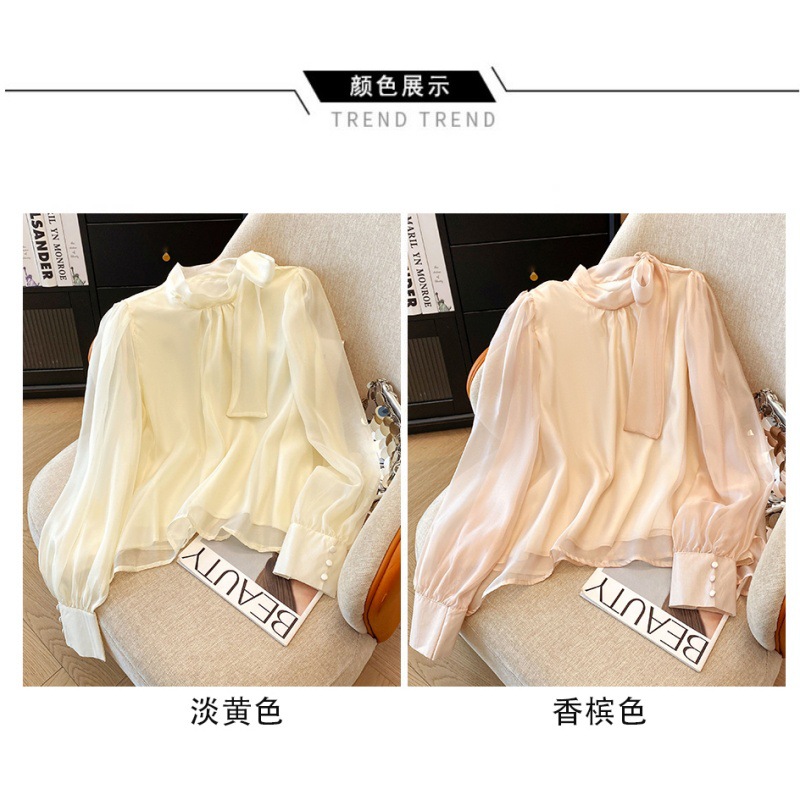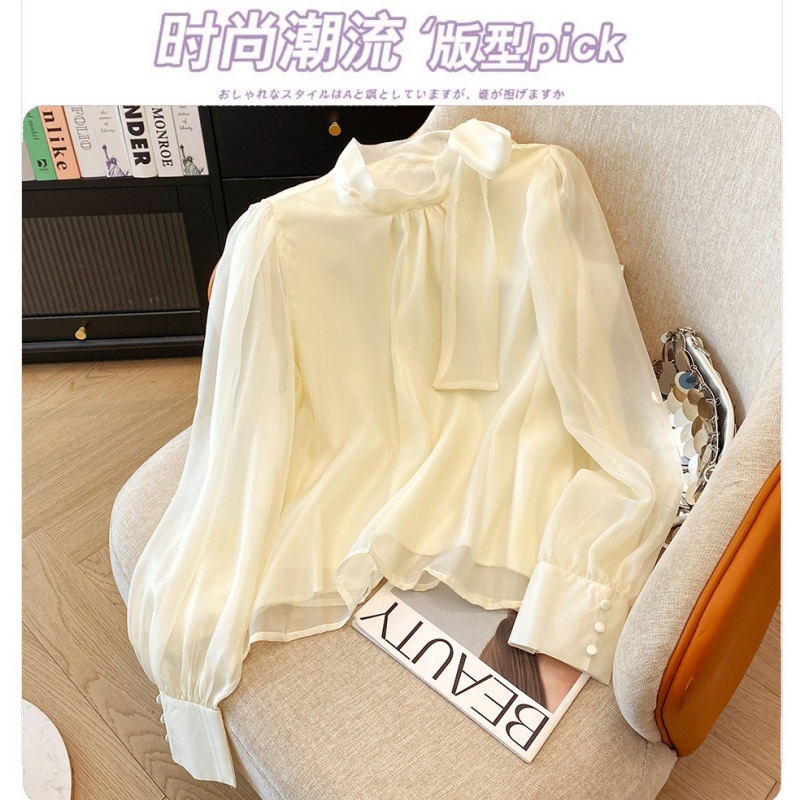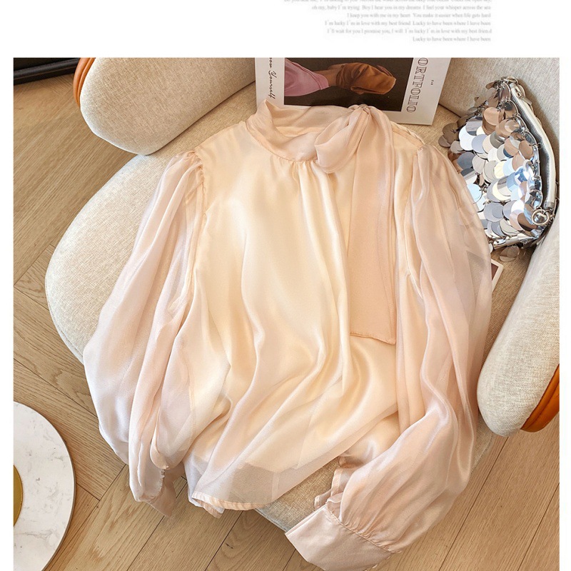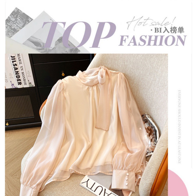 핑크 달콤한 활 스트랩 쉬폰 셔츠 여성의 봄과 가을 빛 성숙한 바람 아름다운 작은 셔츠 느슨한 우아한 탑스토어 가기