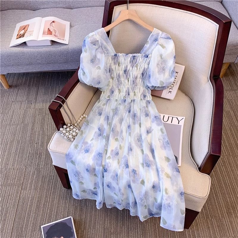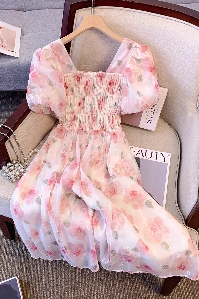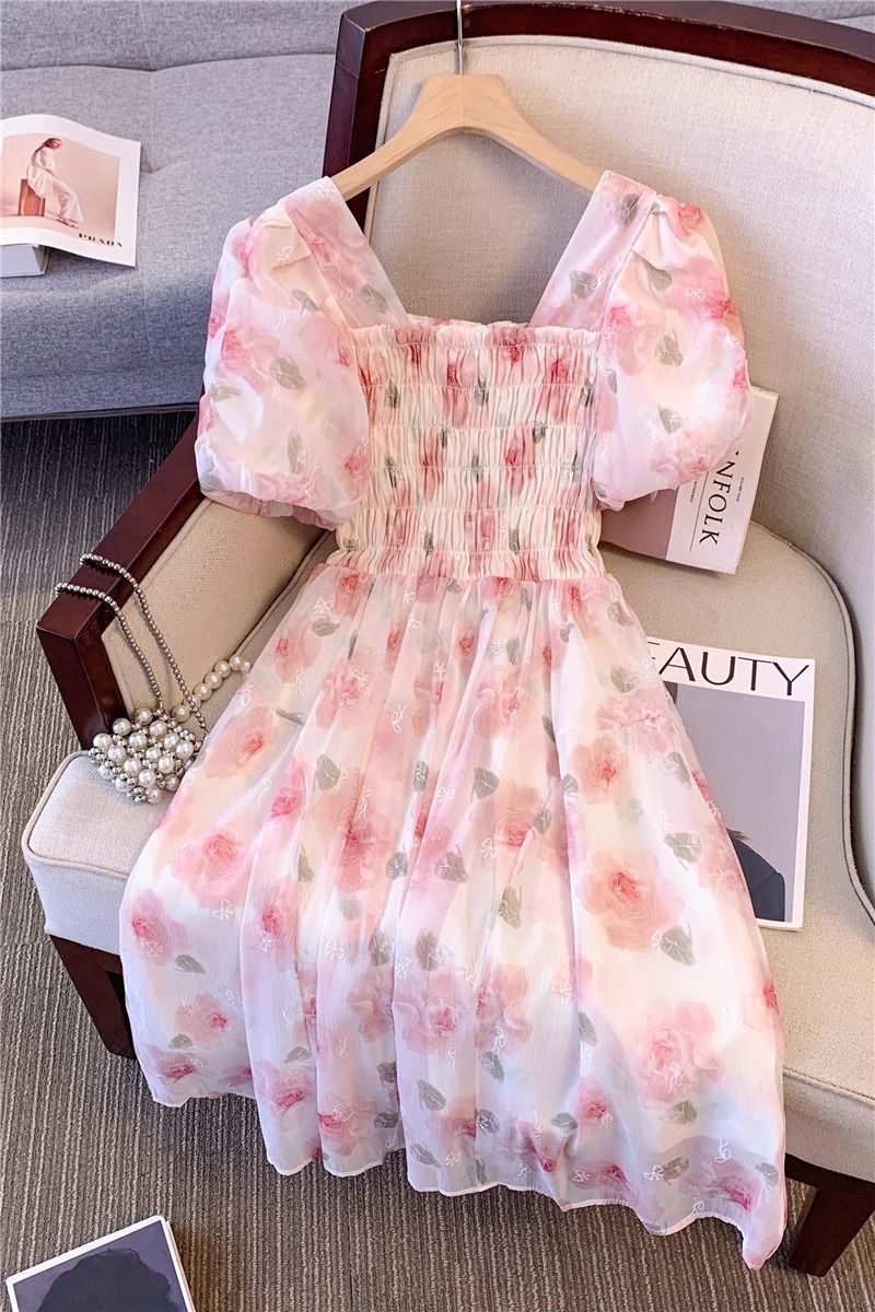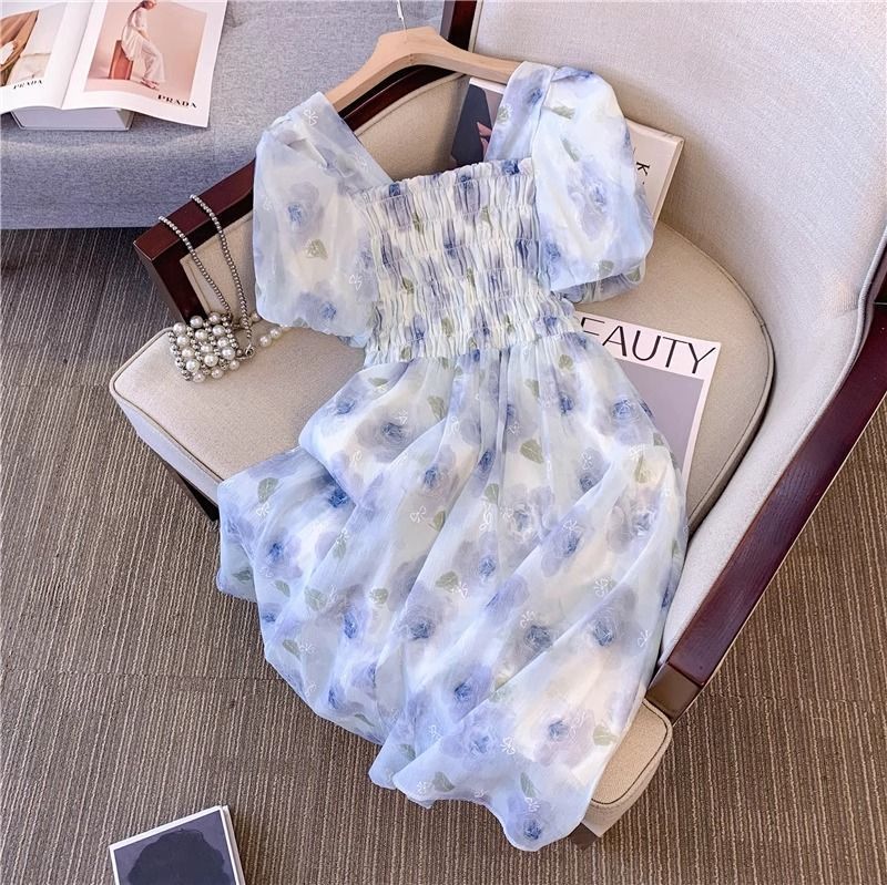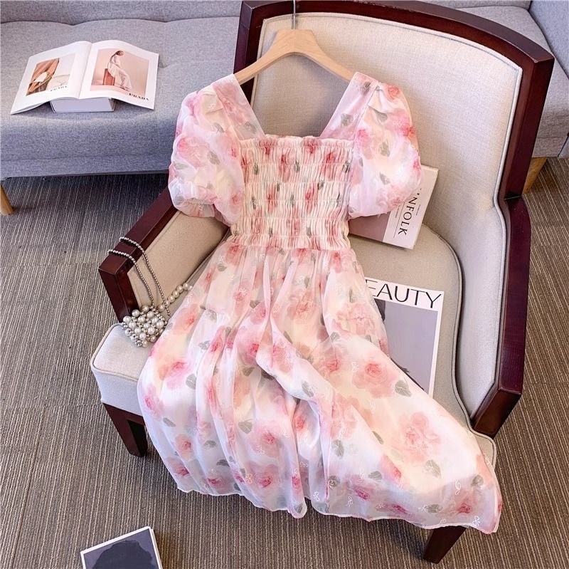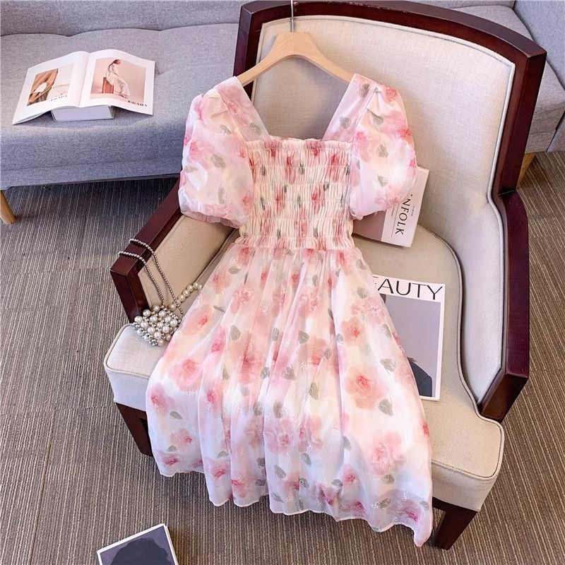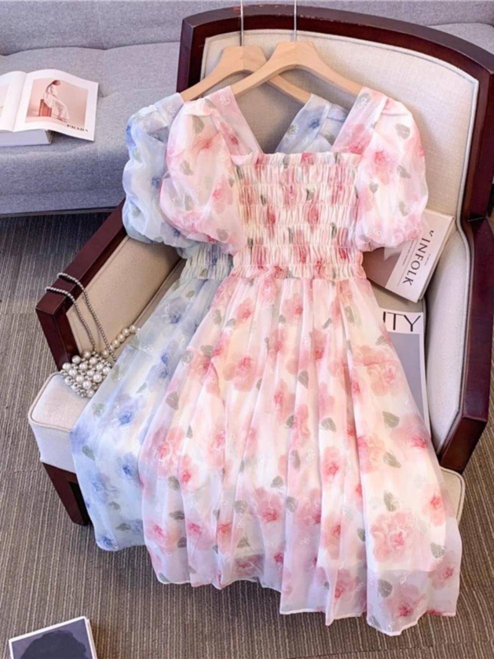 플러스 사이즈 퍼프 슬리브 스퀘어 칼라 플리츠 꽃 원피스 여성 여름 새로운 약간의 통통한 높은 허리 슬리밍 짧은 소매 스커트스토어 가기