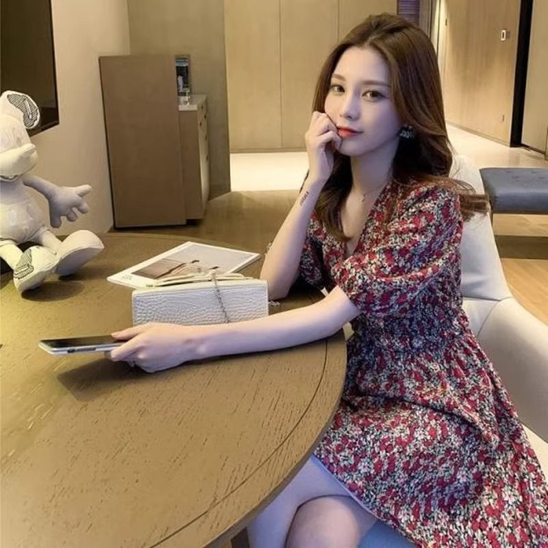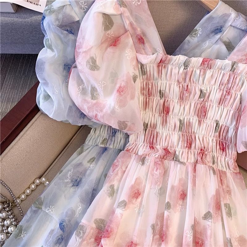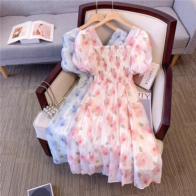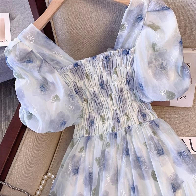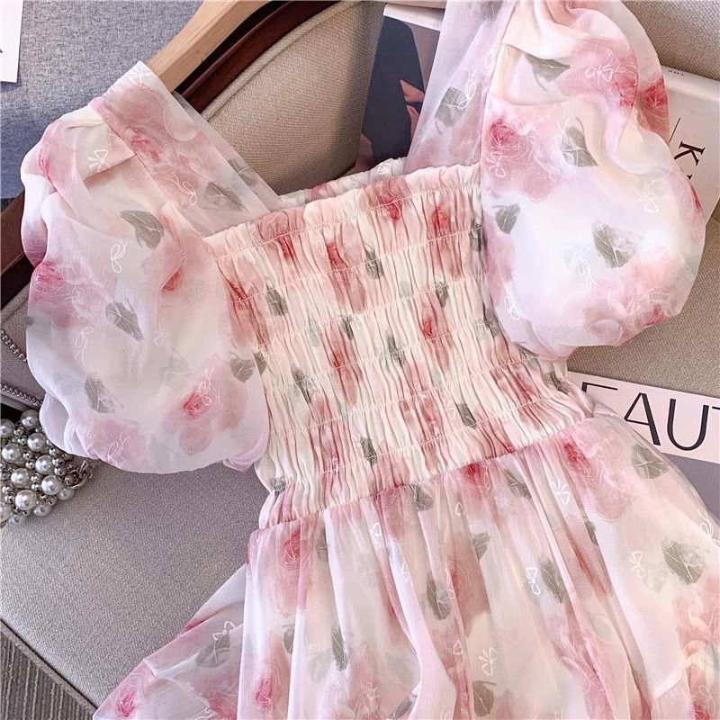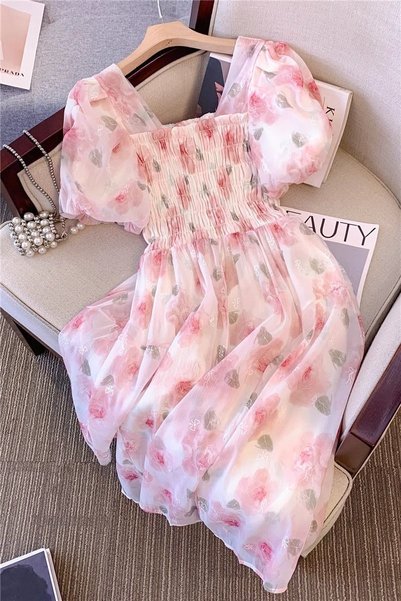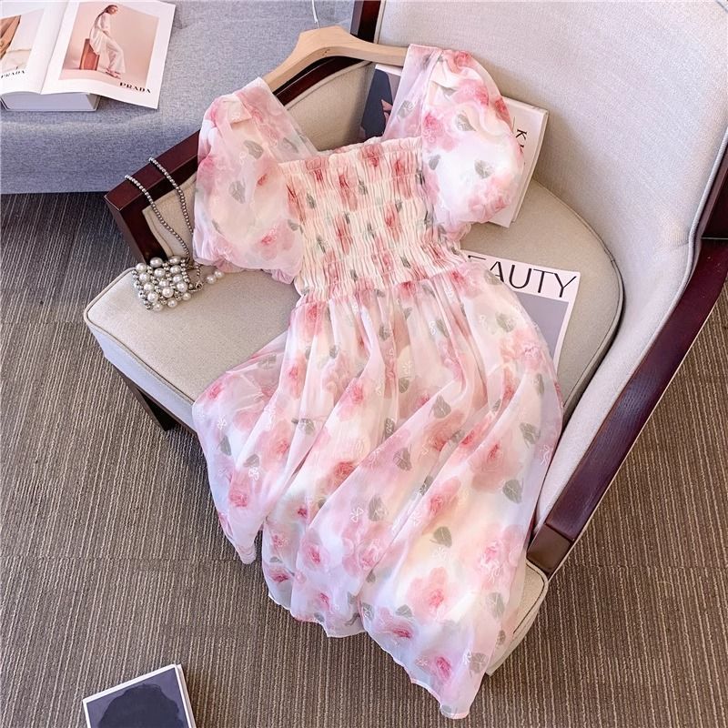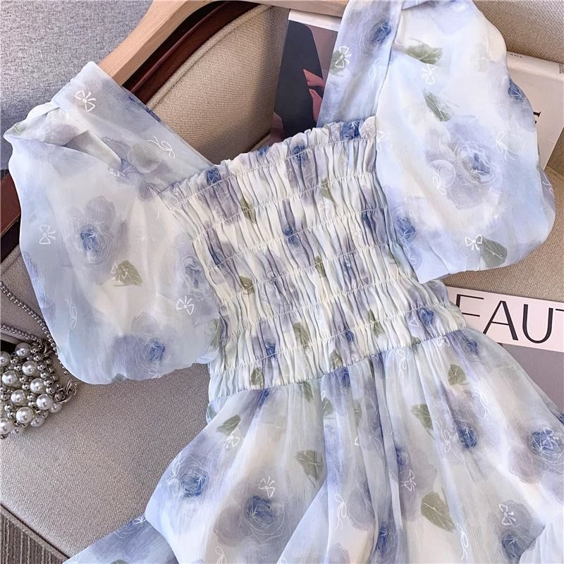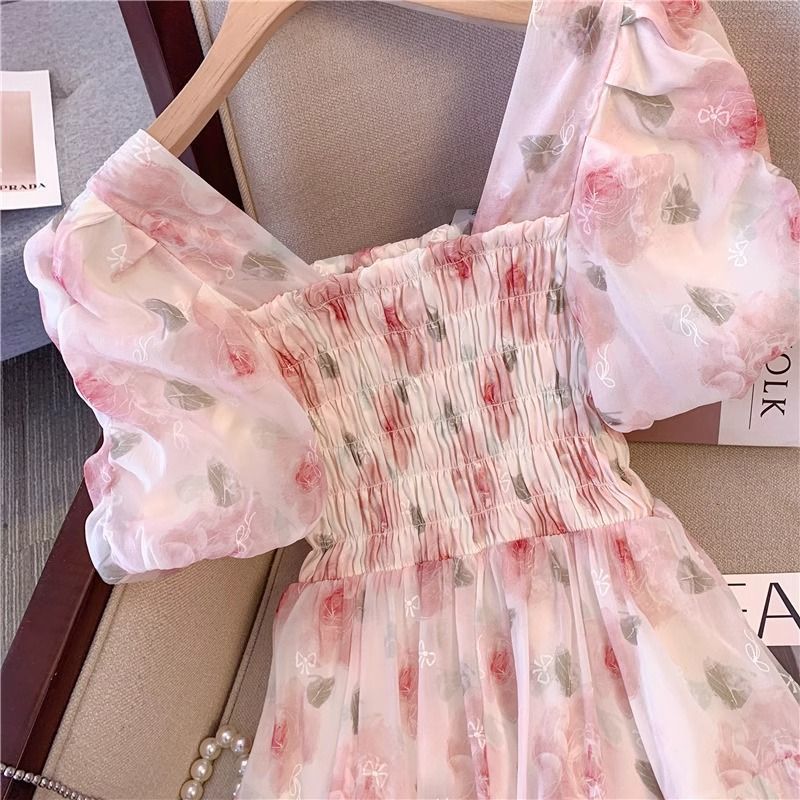 플러스 사이즈 퍼프 슬리브 스퀘어 칼라 플리츠 꽃 원피스 여성 여름 새로운 약간의 통통한 높은 허리 슬리밍 짧은 소매 스커트스토어 가기
