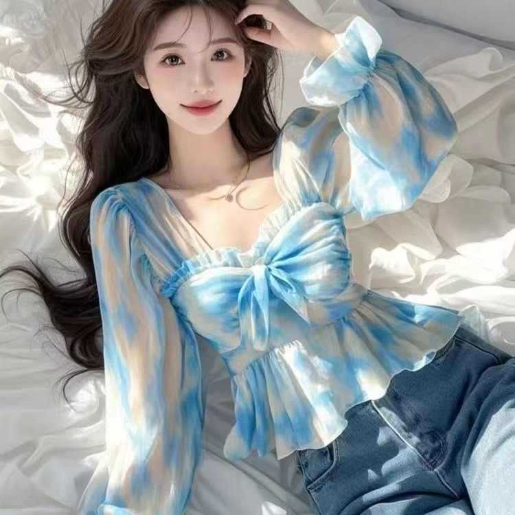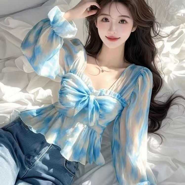프랑스 레트로 스퀘어 칼라 긴팔 쉬폰 셔츠 여자 2025 년 이른 봄 새 발견 된 대조 허리 짧은 긴팔 탑스토어 가기