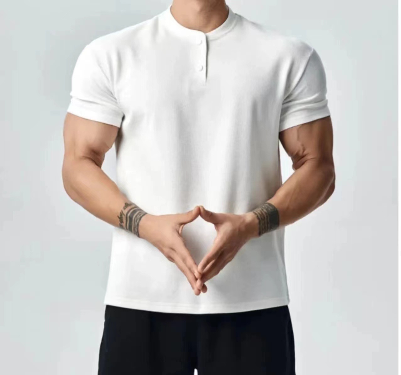 미국 헨리 칼라 반팔 남성 티셔츠 여름 새로운 느슨한 솔리드 컬러 레트로 트렌디 브랜드 올 매치 캐주얼 티셔츠 남성 트렌디