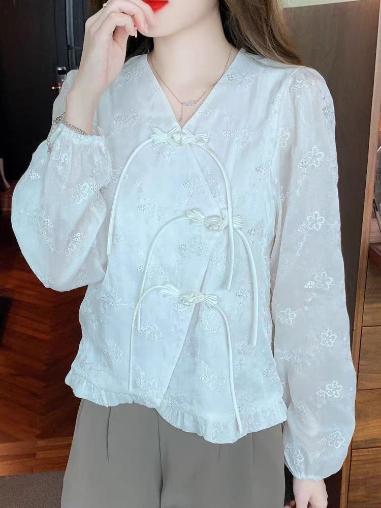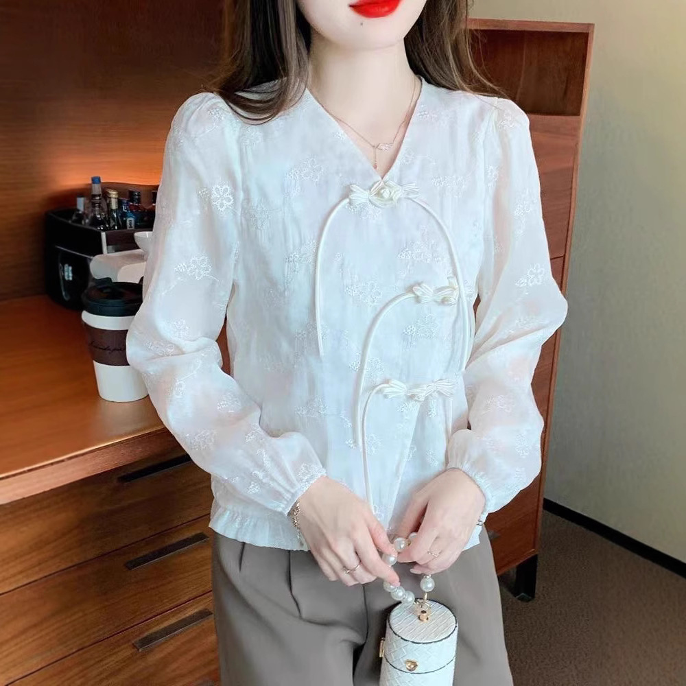 새로운 중국 긴 소매 셔츠 프랑스 쉬폰 2025 봄 새로운 우아한 서양 스타일 작은 셔츠 국가 스타일 버클 짧은 탑스토어 가기