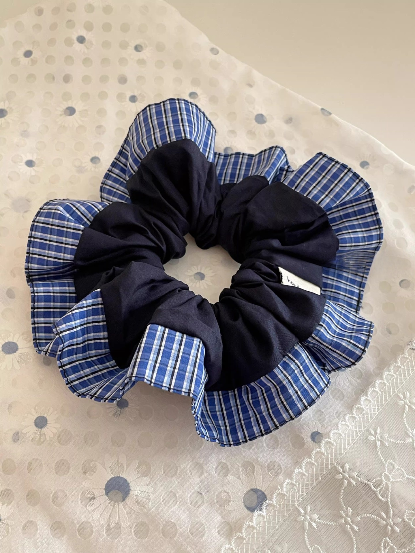 블루 체크 무늬 하이 엔드 레트로 대학 스타일 대형 직분 헤어 링 틈새 볼 헤드 로프 초기 가을 새 헤어 로프 헤어 액세서리