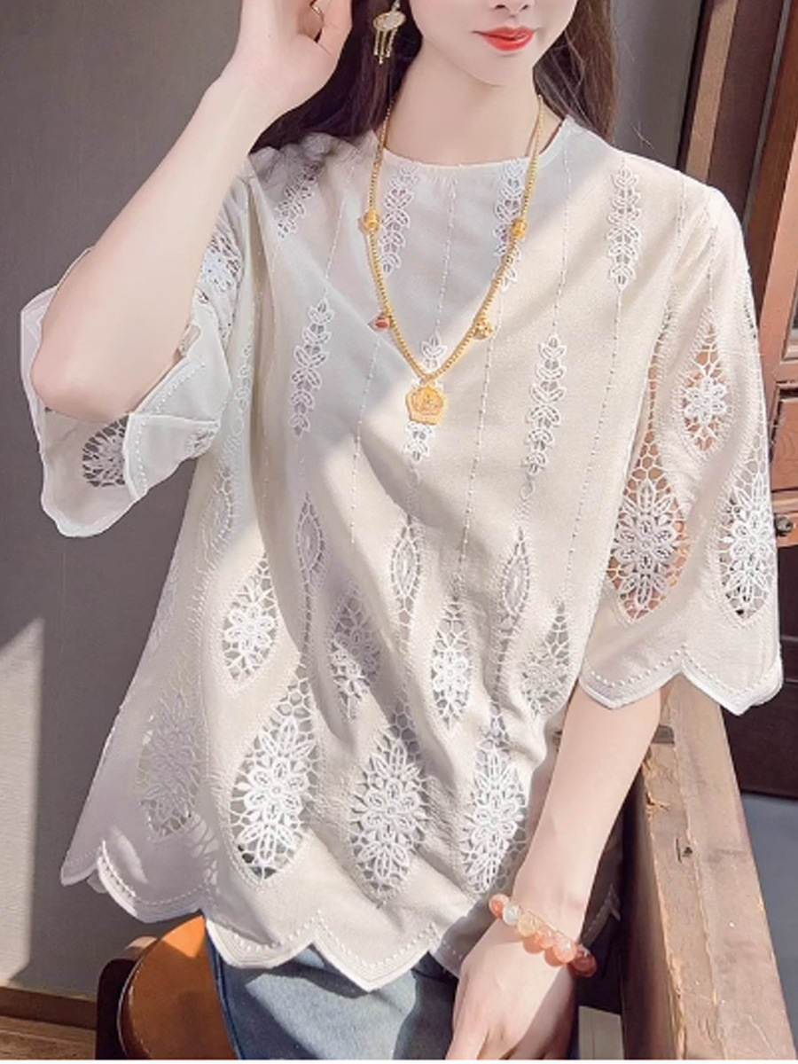 무거운 자수 레이스 반팔베이스 탑 여자 여름 얇은 Lyocell 새로운 중국 티셔츠 빈 셔츠