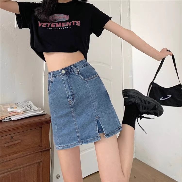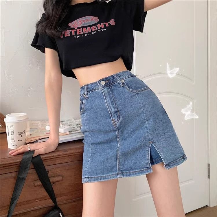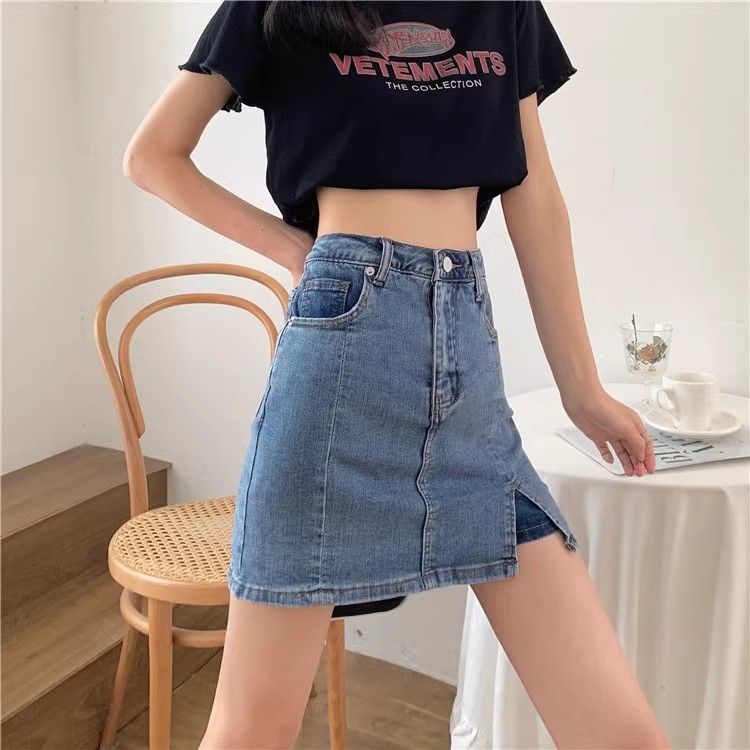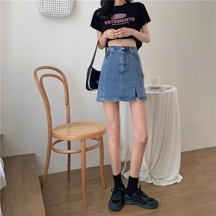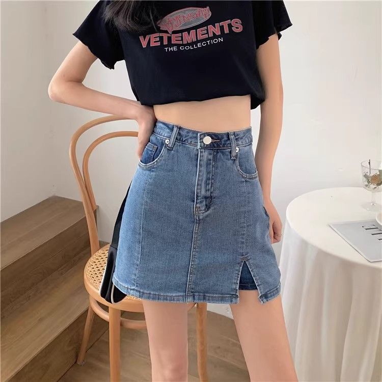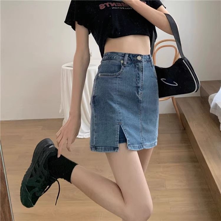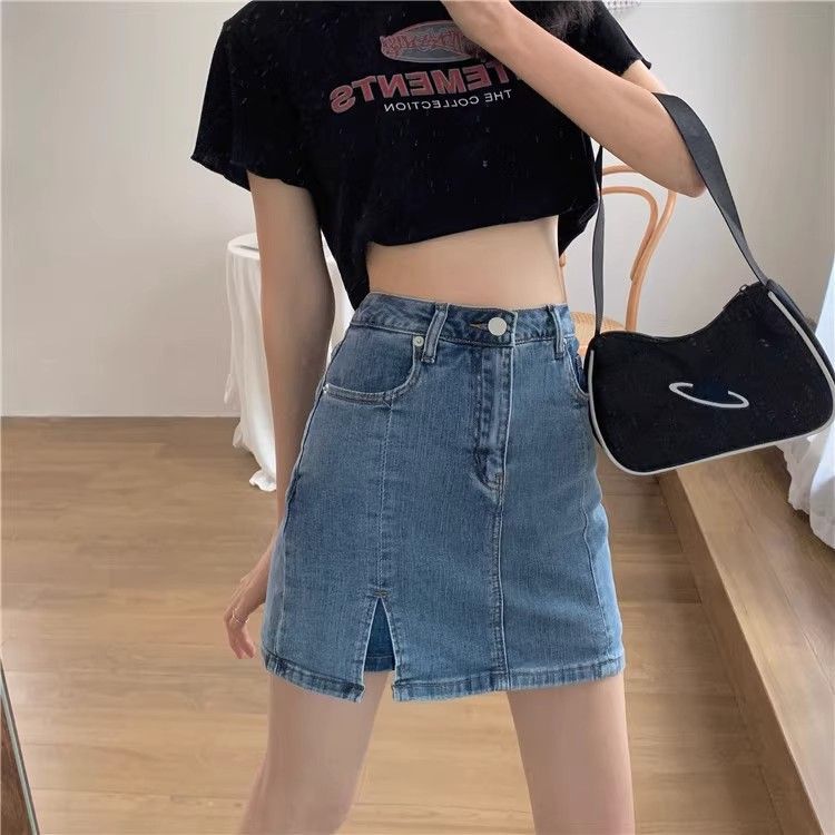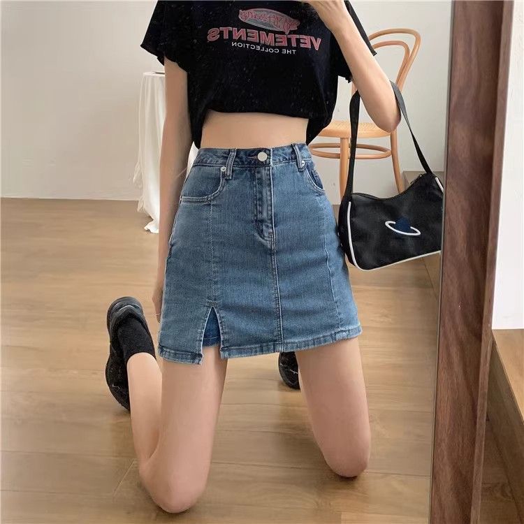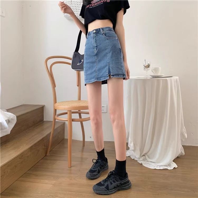 2025 여름 얇은 데님 스커트 여성 탄성 높은 허리 스플릿 힙 랩 스커트 A 라인 짧은 스커트 안티 눈부심 바지 스커트스토어 가기