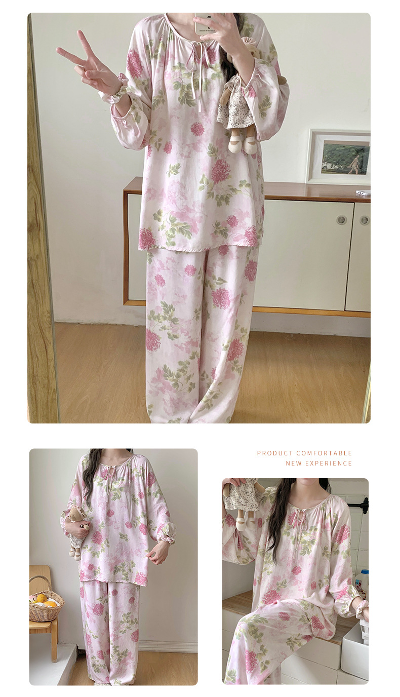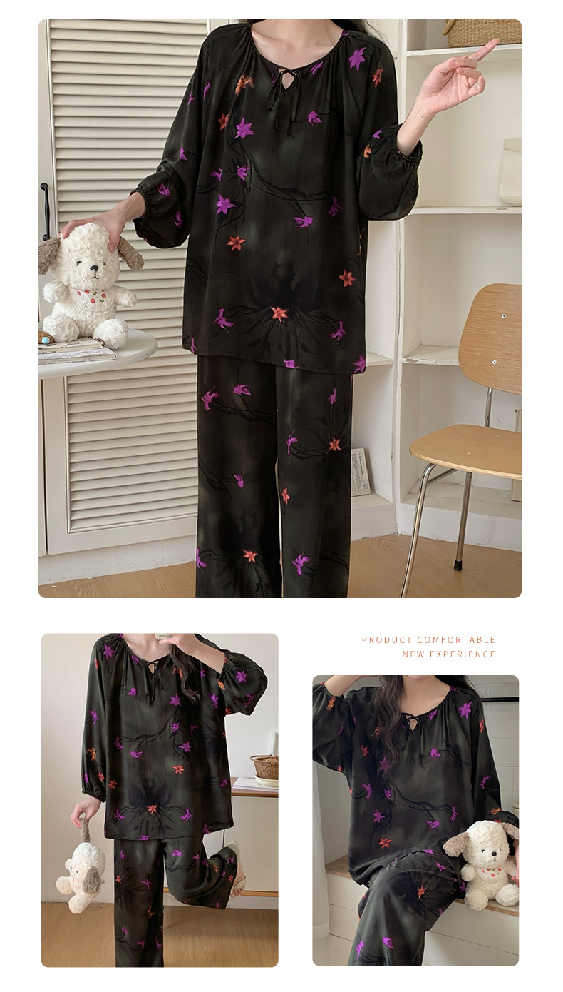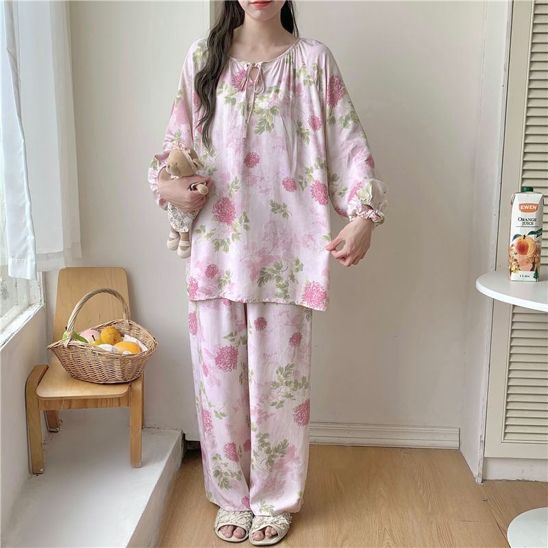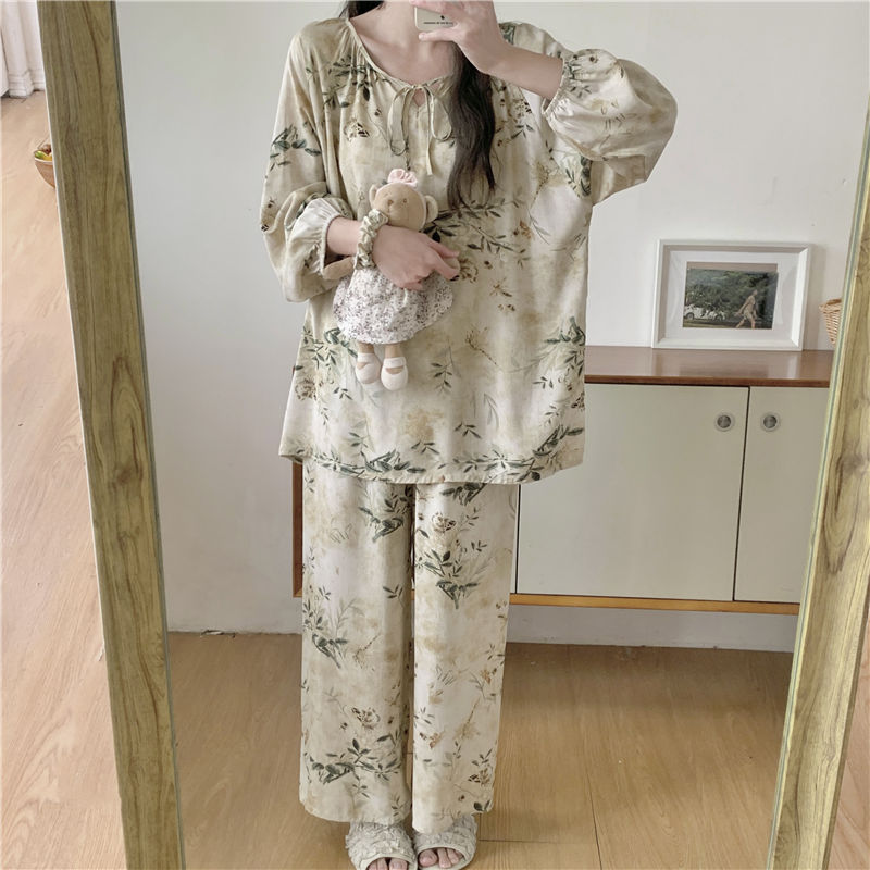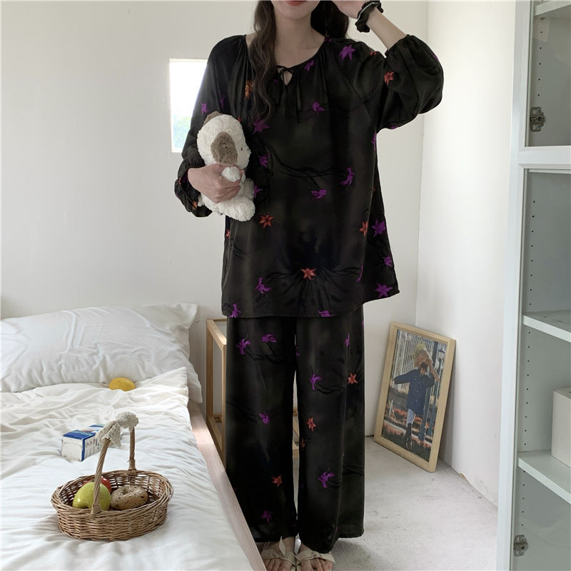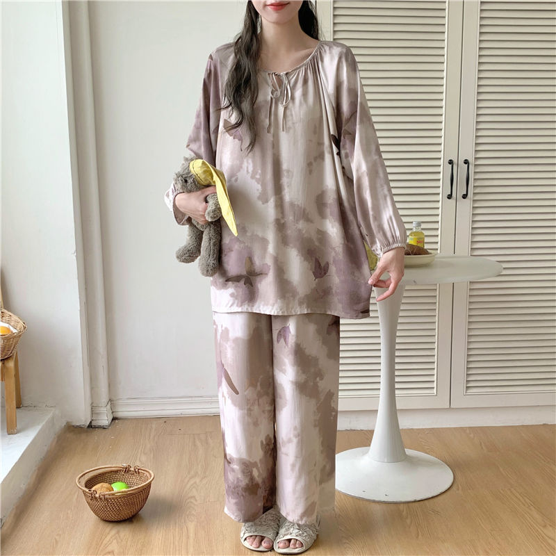 면 실크 잠옷 여성의 봄과 여름 새로운 플러스 사이즈 긴 소매 인쇄 세트 인터넷 축하 라이브 스타일 레이온 홈 옷 가을