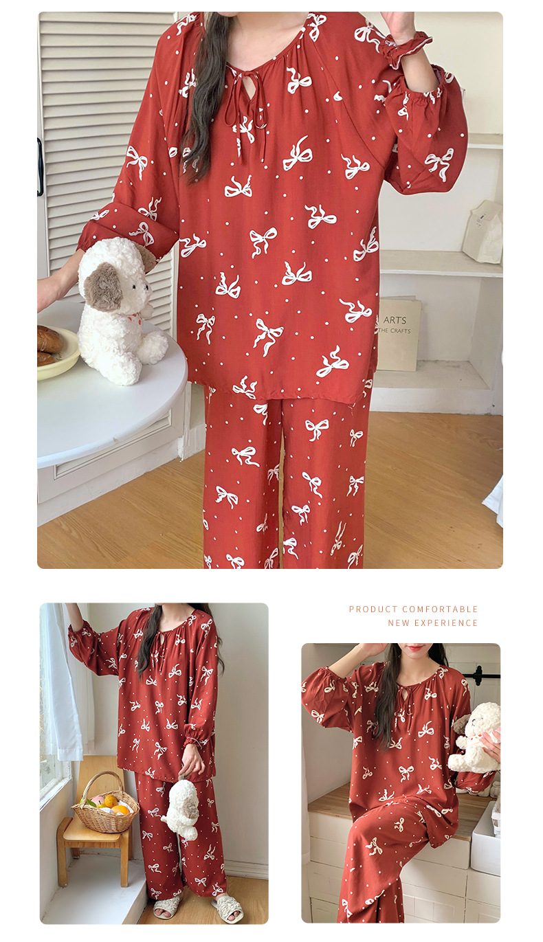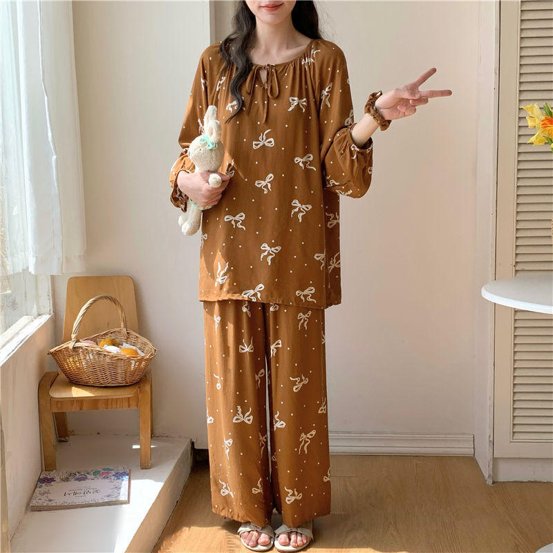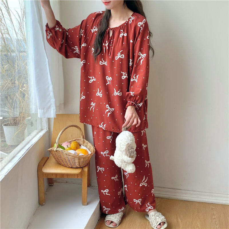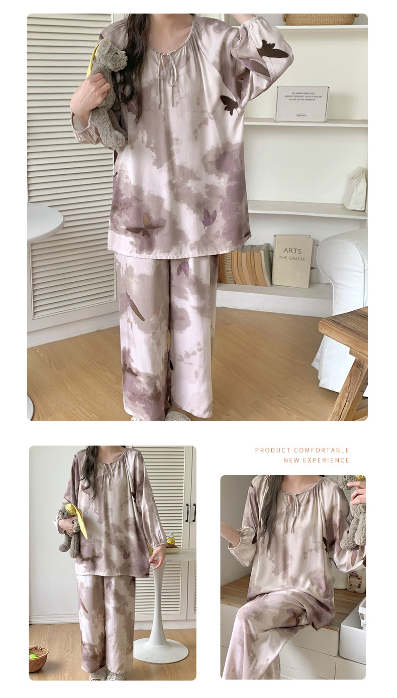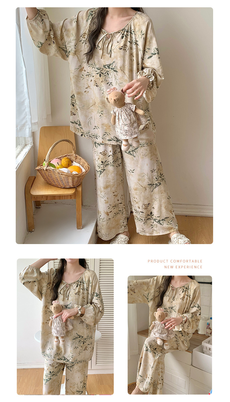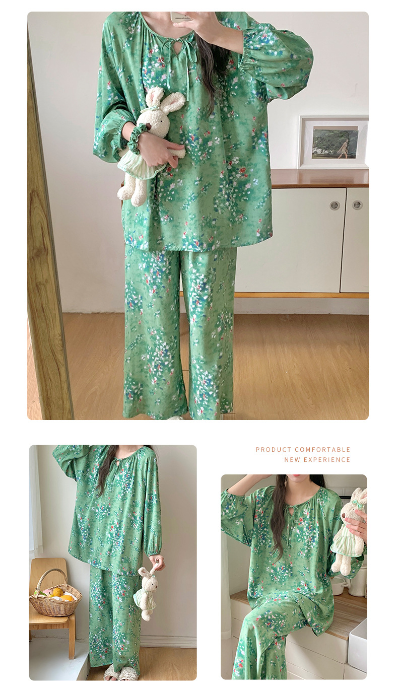 면 실크 잠옷 여성의 봄과 여름 새로운 플러스 사이즈 긴 소매 인쇄 세트 인터넷 축하 라이브 스타일 레이온 홈 옷 가을