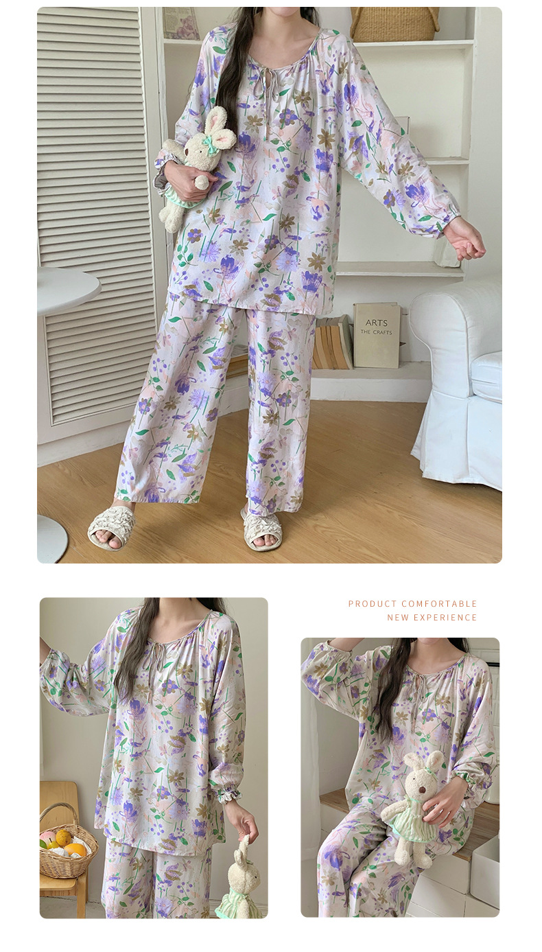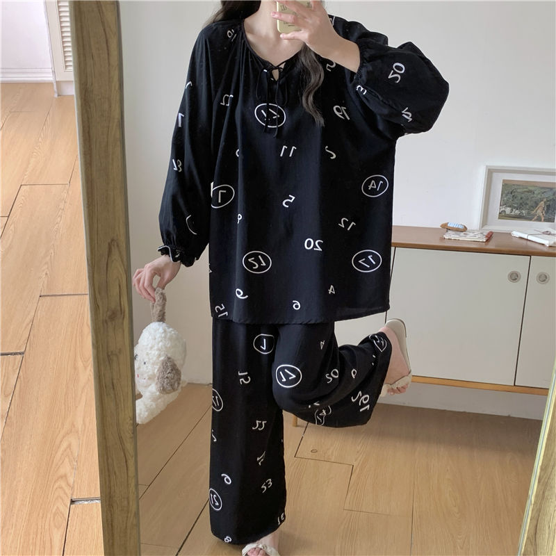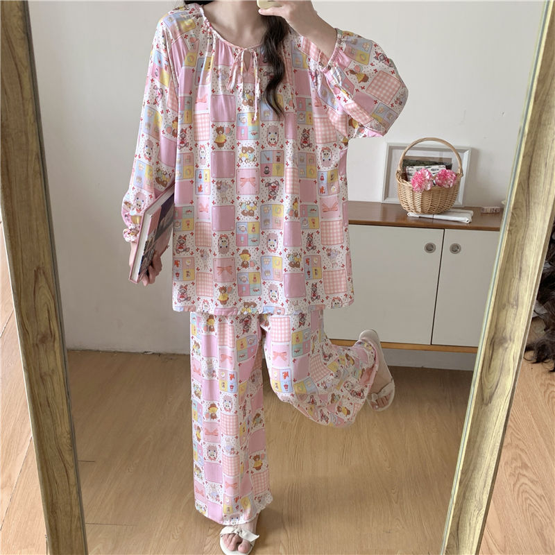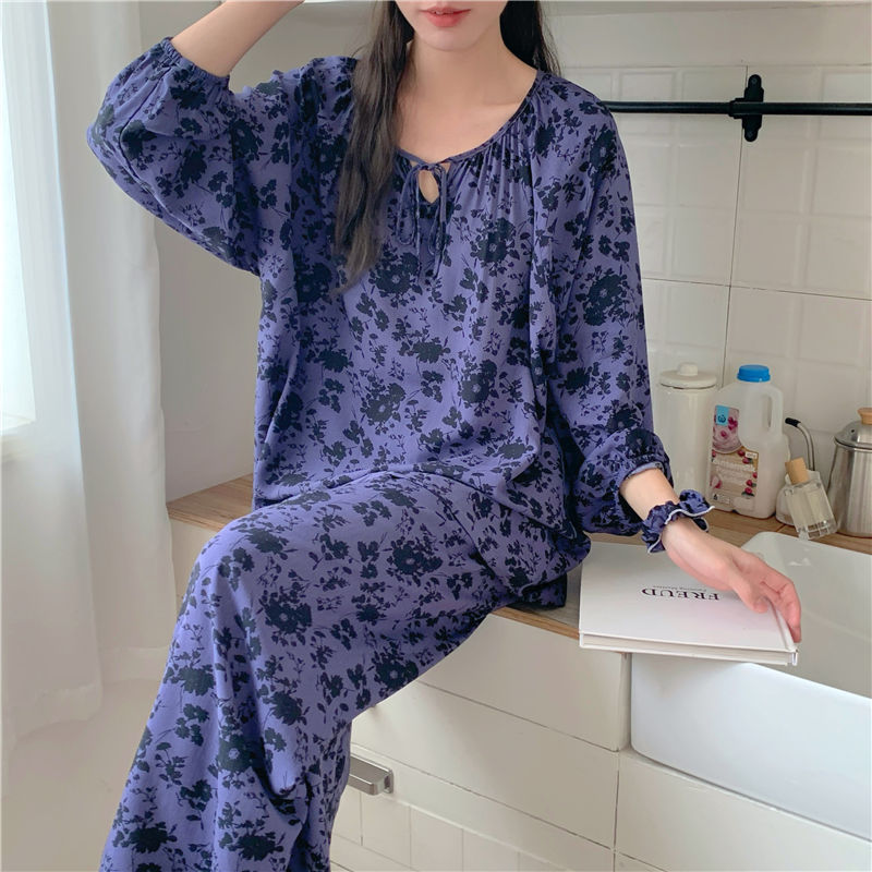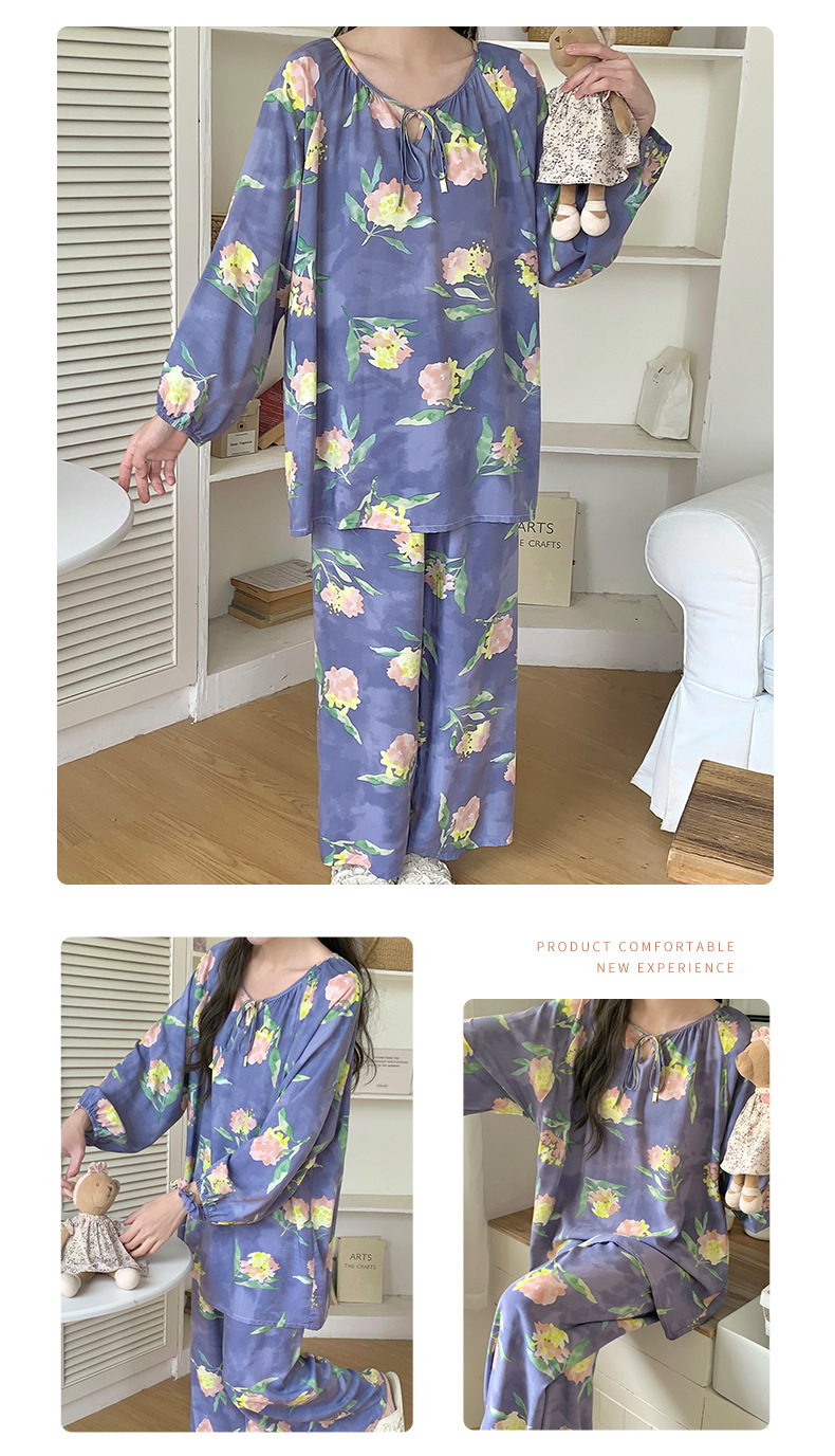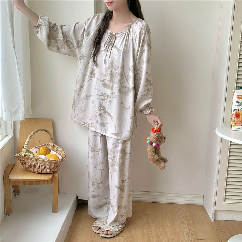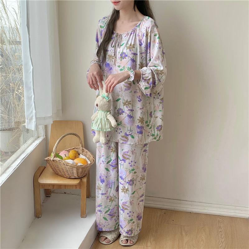 면 실크 잠옷 여성의 봄과 여름 새로운 플러스 사이즈 긴 소매 인쇄 세트 인터넷 축하 라이브 스타일 레이온 홈 옷 가을스토어 가기