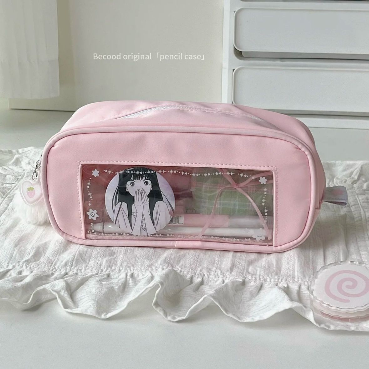 새로운 딸기 분말 통증 가방 작은 그룹 펜 가방 높은 색상 가치 소녀 공주 대용량 문구 저장 가방 학생스토어 가기