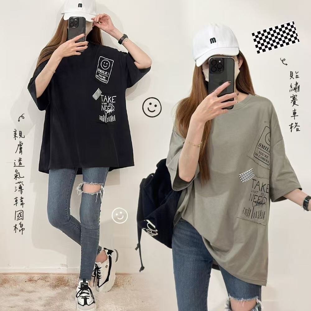 2025 중간 길이 여름 대형 반팔 라운드 넥 티셔츠 프린트 패치 연령 감소 슬리밍 다용도 여성상의스토어 가기