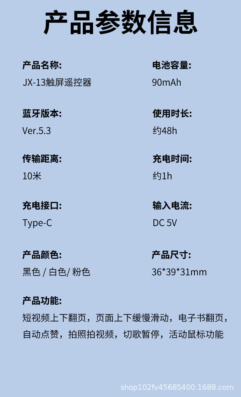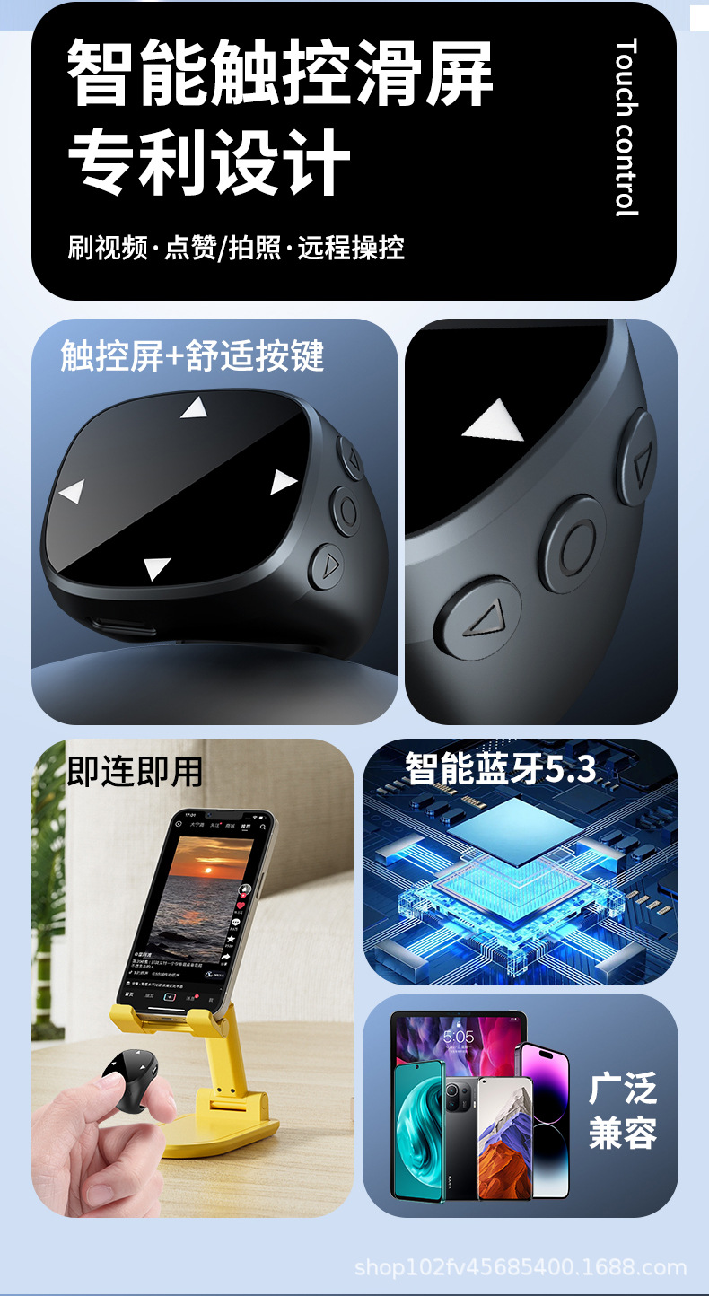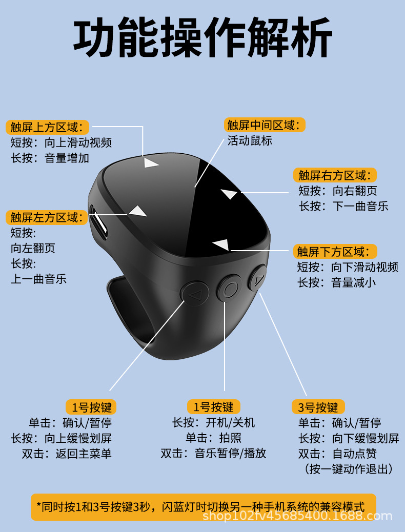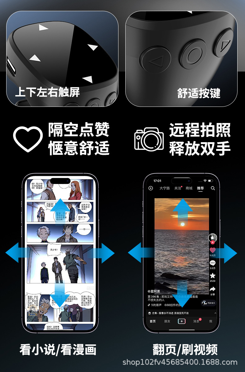 휴대폰 블루투스 터치스크린 원격 제어, 짧은 비디오 스트리밍 APP, 사진 촬영, 자동 좋아요, 전자책 페이지 넘기기, 이벤트 마우스스토어 가기