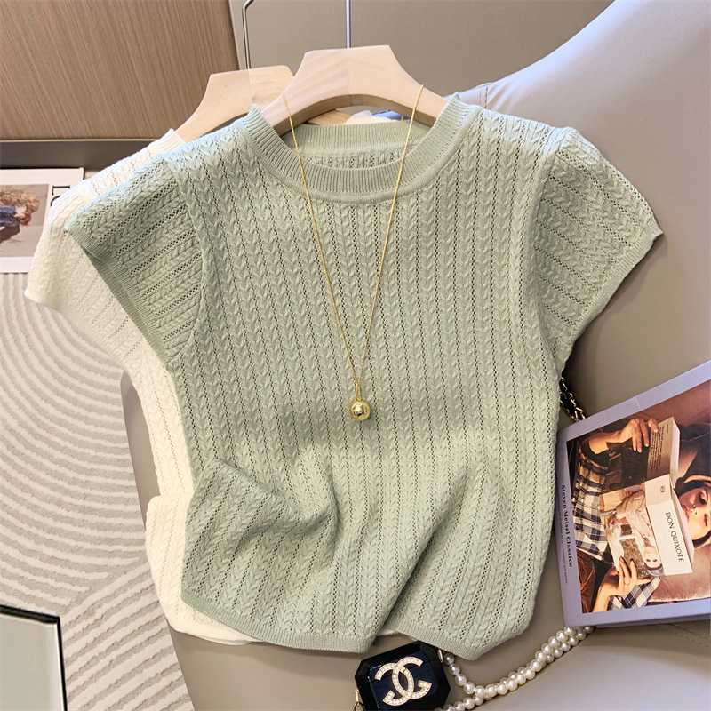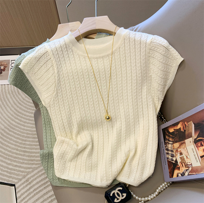 프랑스 스타일 세련된 할로우 크루 넥 스웨터 여성 반팔 2025 여름 새로운 스타일 젠틀 슈퍼 니스 라이트급 베이스 탑스토어 가기