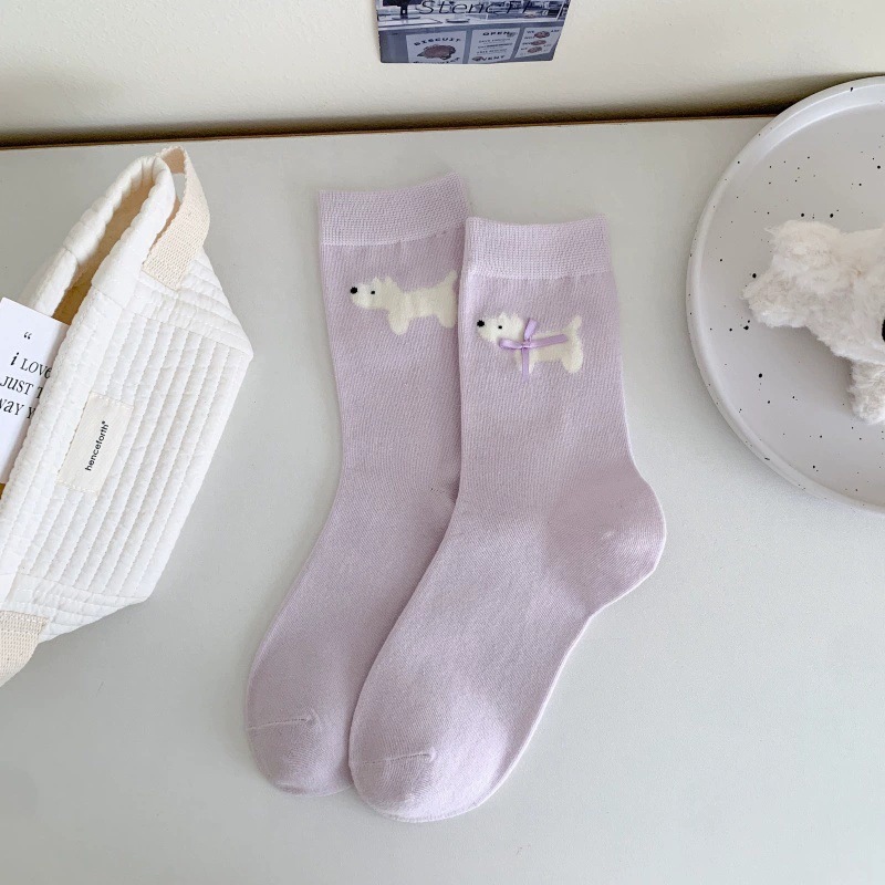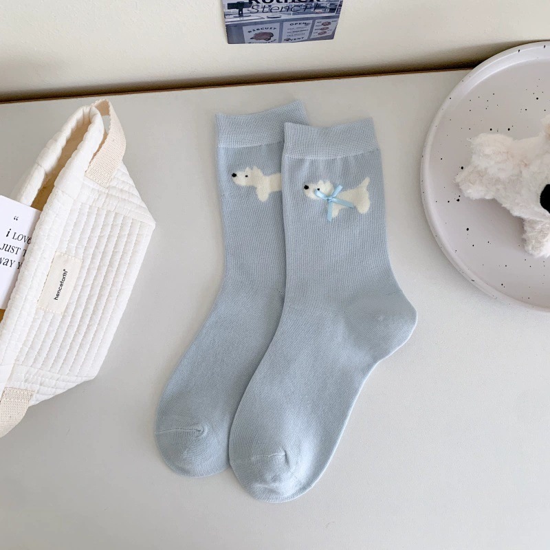 강아지 리본 양말 여성용 종아리 중간 양말 봄, 가을 면 양말 ins 한국어 버전 일본식 귀여운 소녀 스타킹스토어 가기