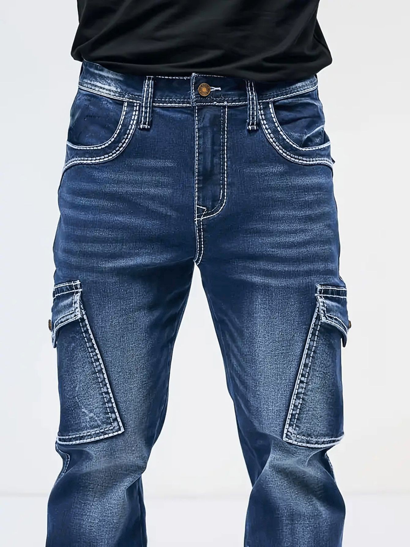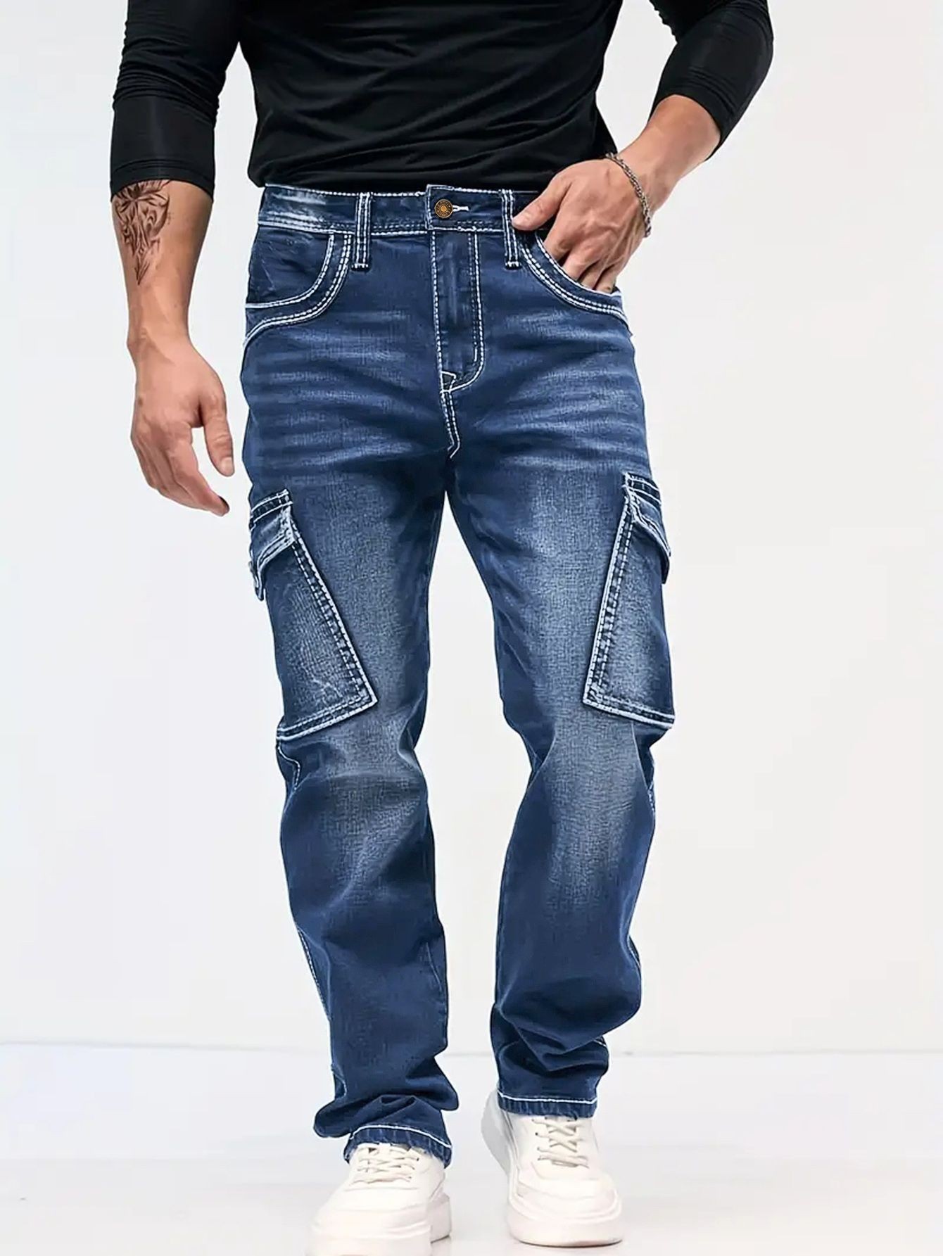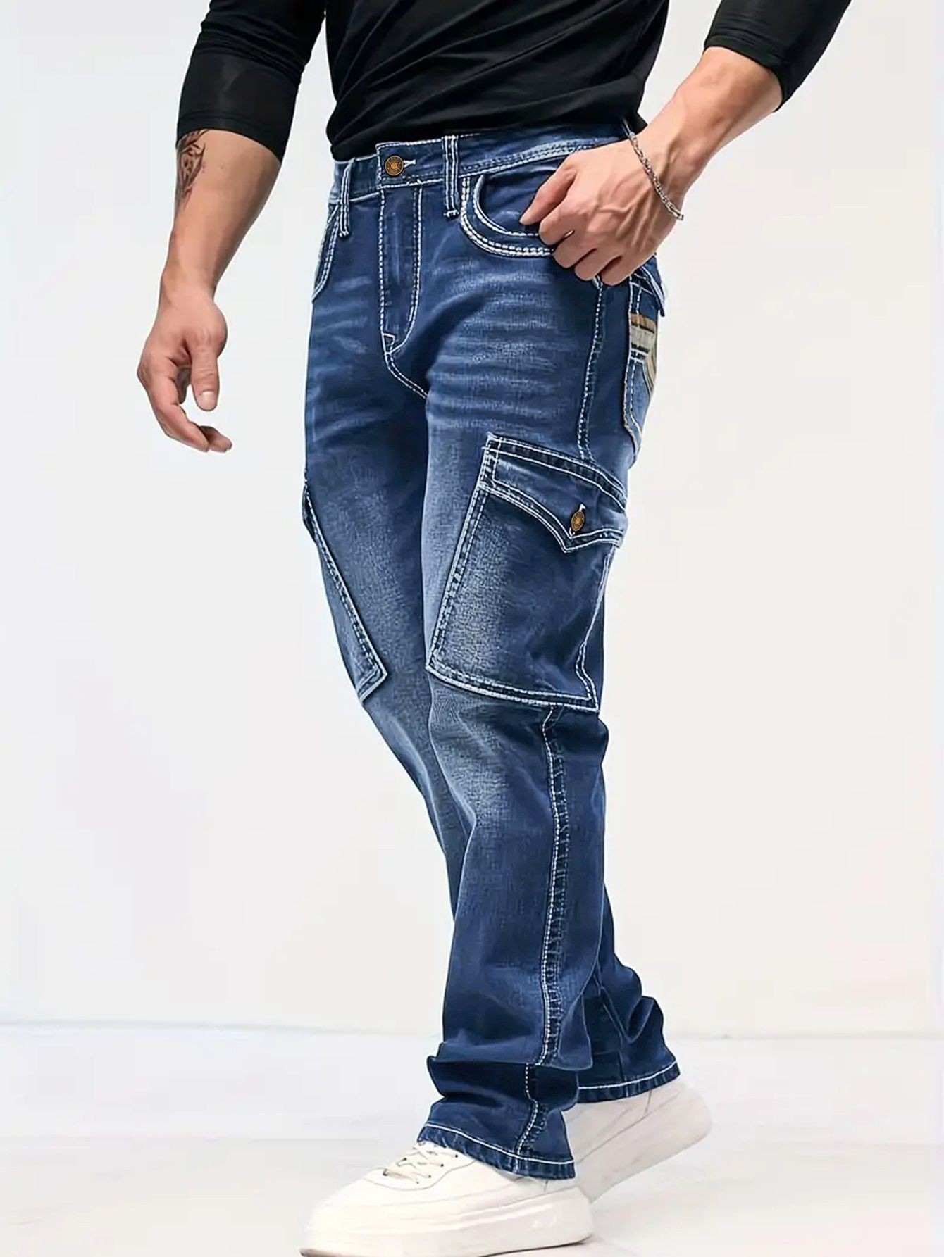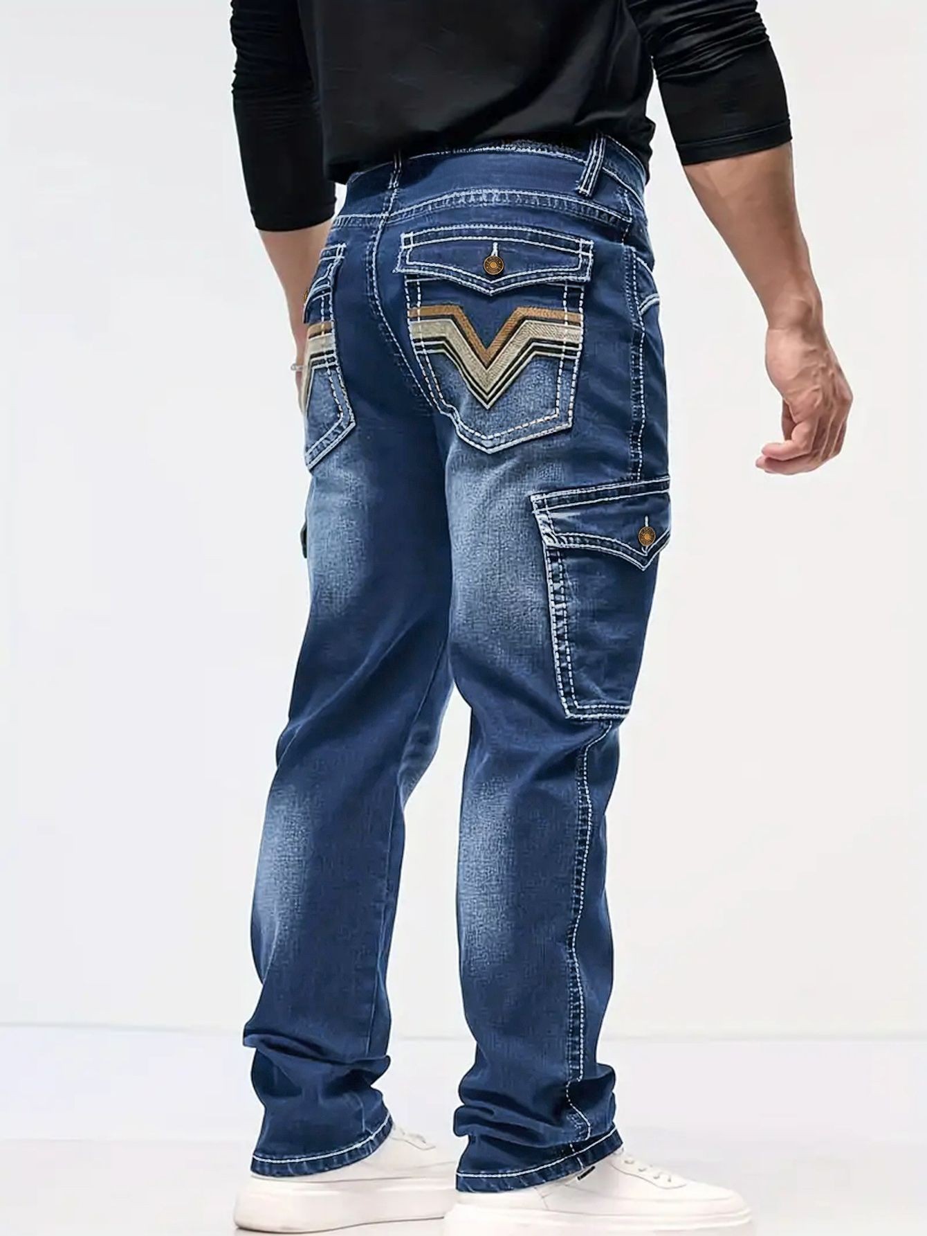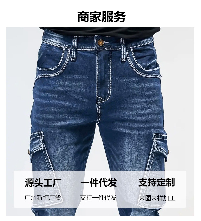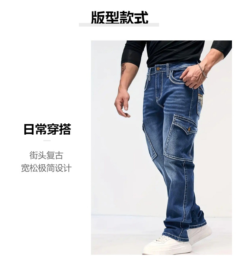 국경 간 봄과 가을 패션 레트로 멀티 포켓 와이드 청바지 코드 NZK 남자의 느슨한 스트레이트 데님 롱스토어 가기