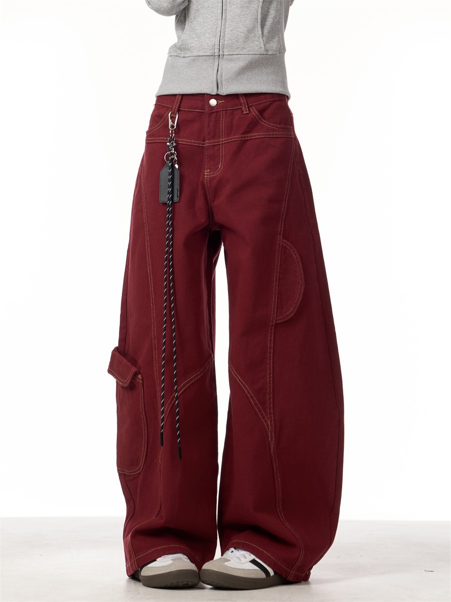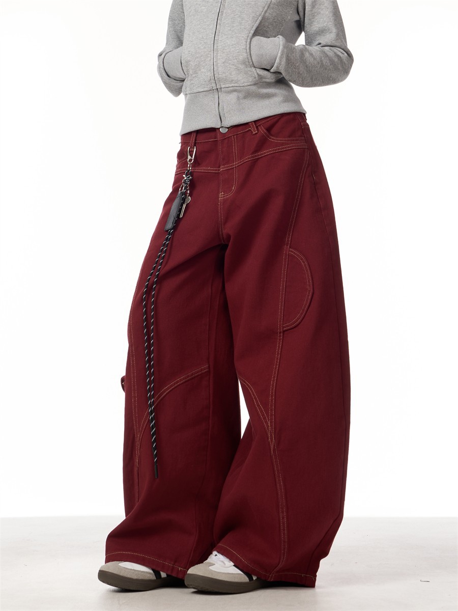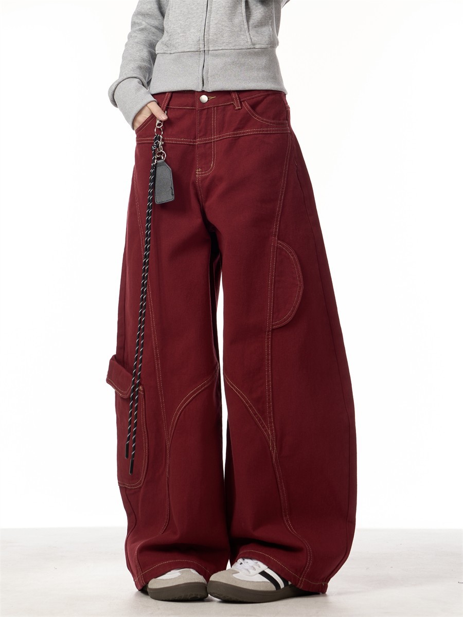 봄과 가을 2025 신년 붉은 청바지 여성 국가 유행 해체 된 마체테 디자인 느슨한 유행 유행 바지스토어 가기