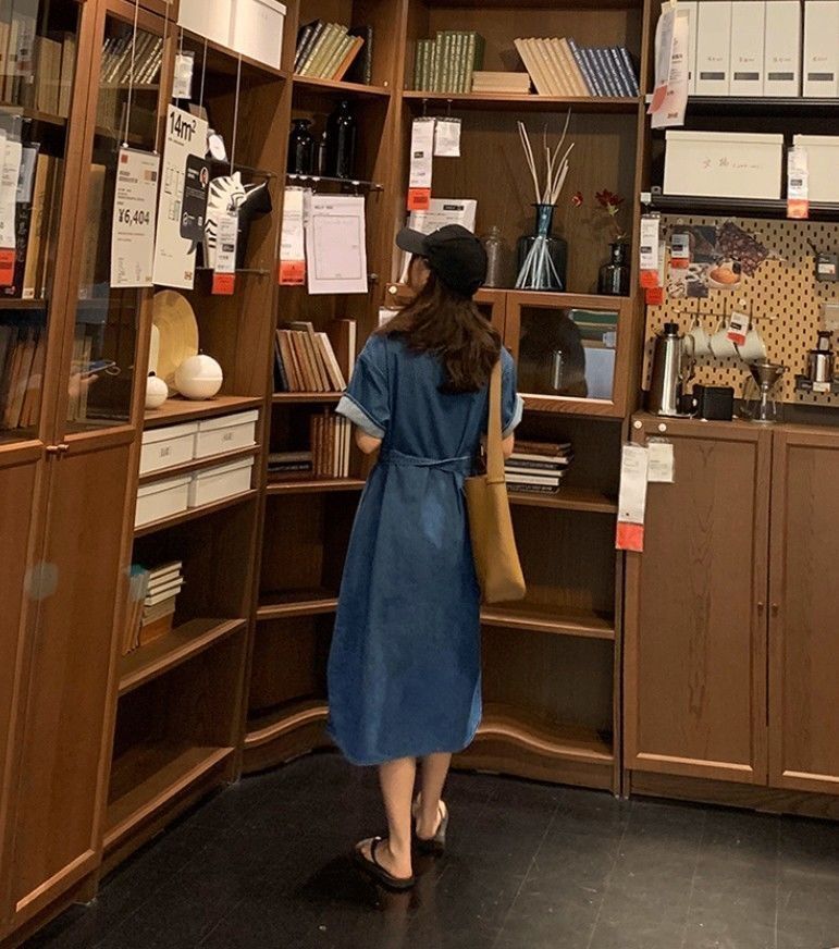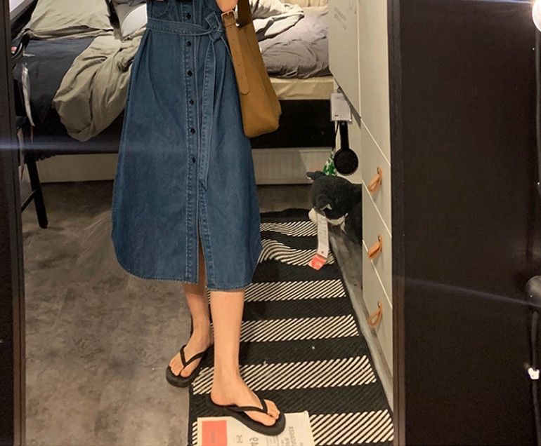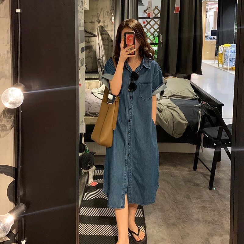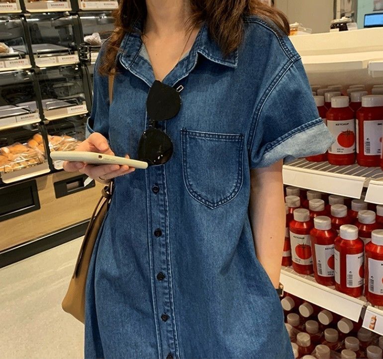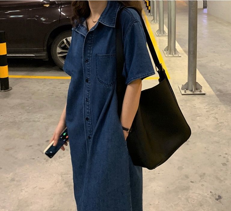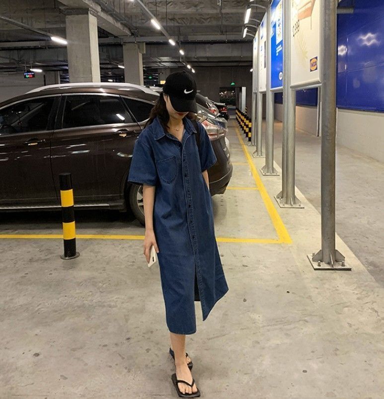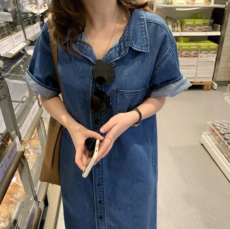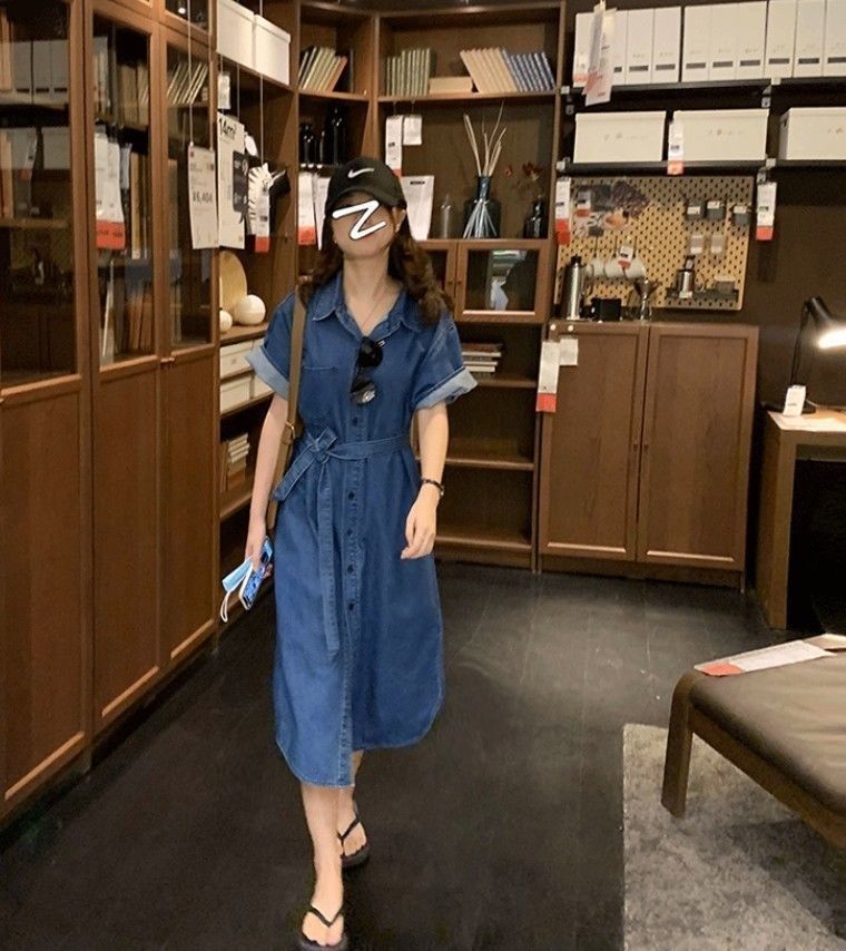 데님 원피스 여자 여름 2025 새로운 레트로 반팔 중간 길이의 타이트 허리 살로 우아한 셔츠 긴 스커트스토어 가기