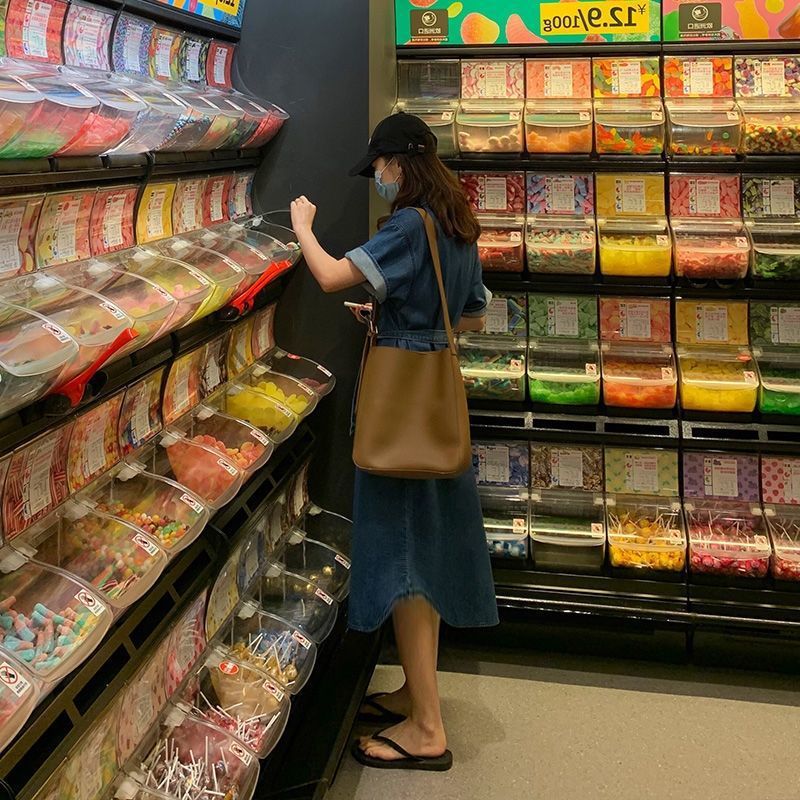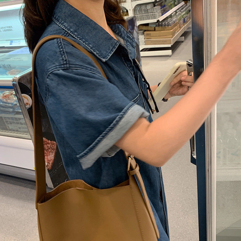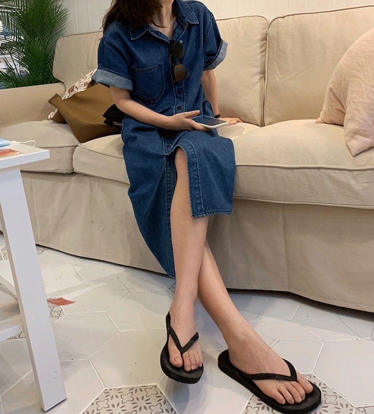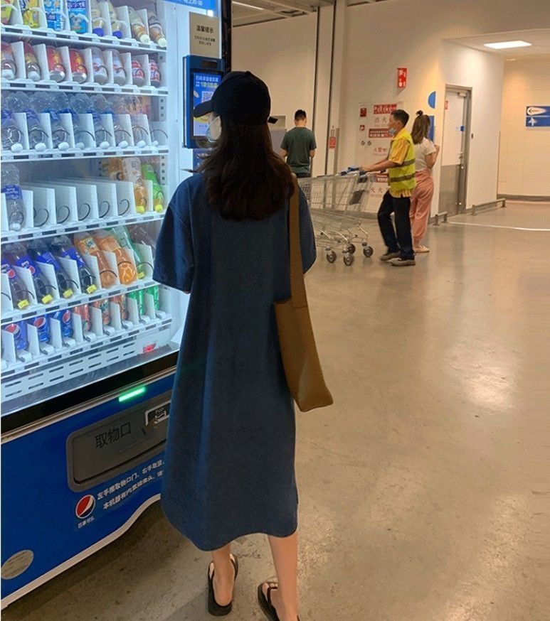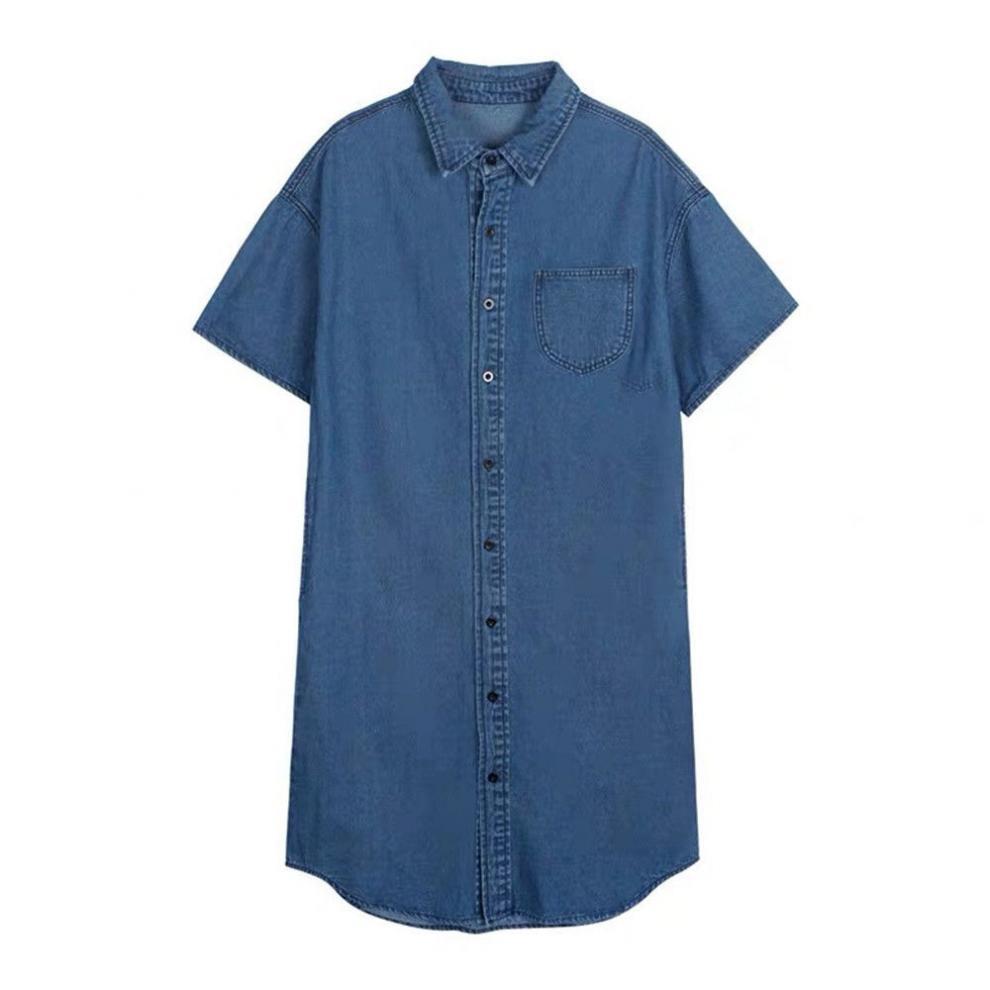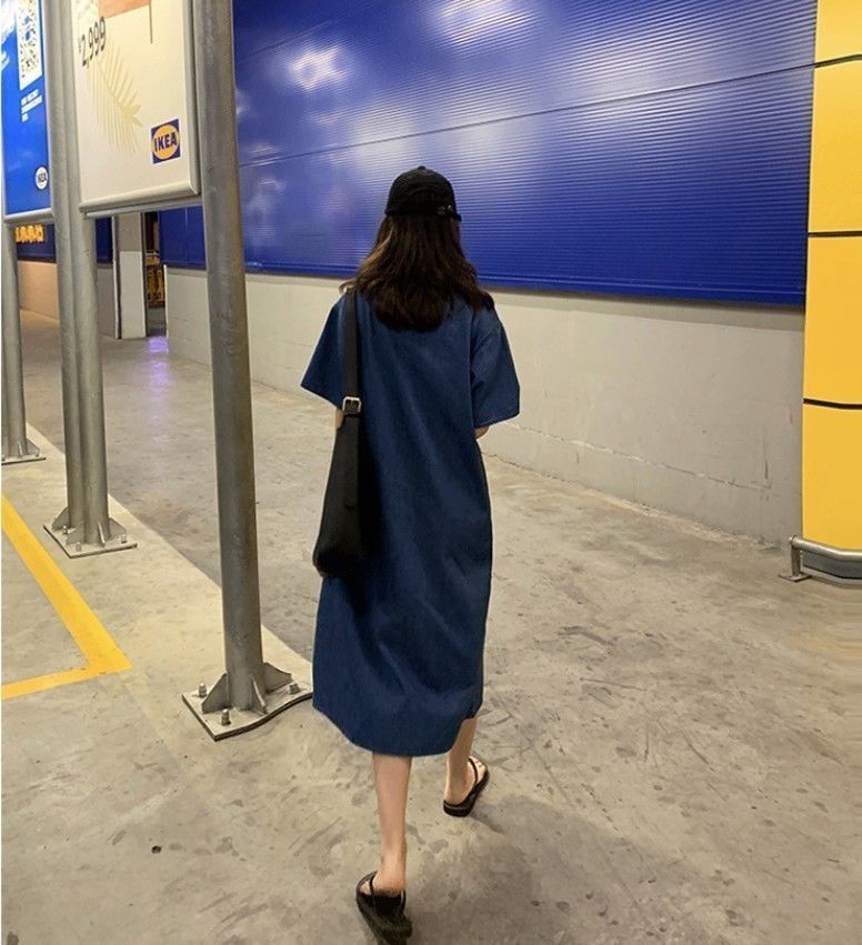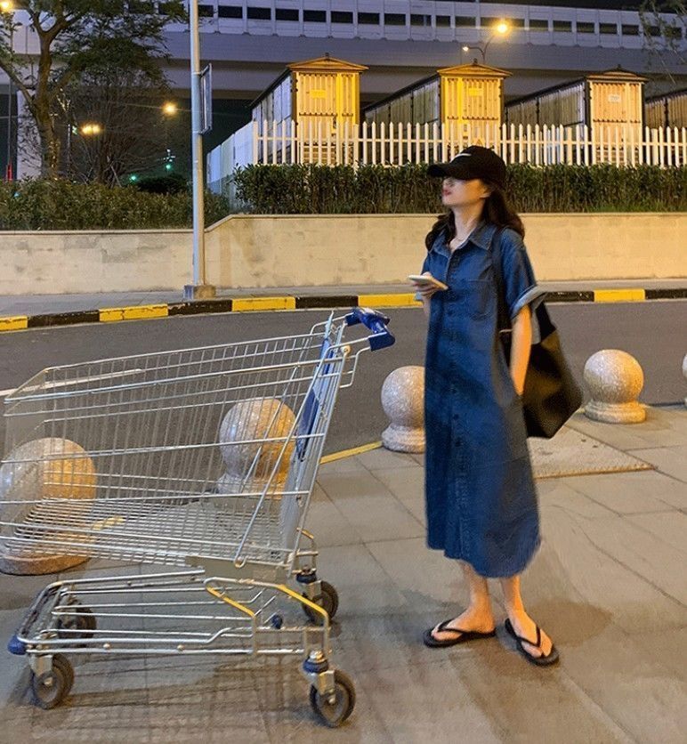 데님 원피스 여자 여름 2025 새로운 레트로 반팔 중간 길이의 타이트 허리 살로 우아한 셔츠 긴 스커트스토어 가기