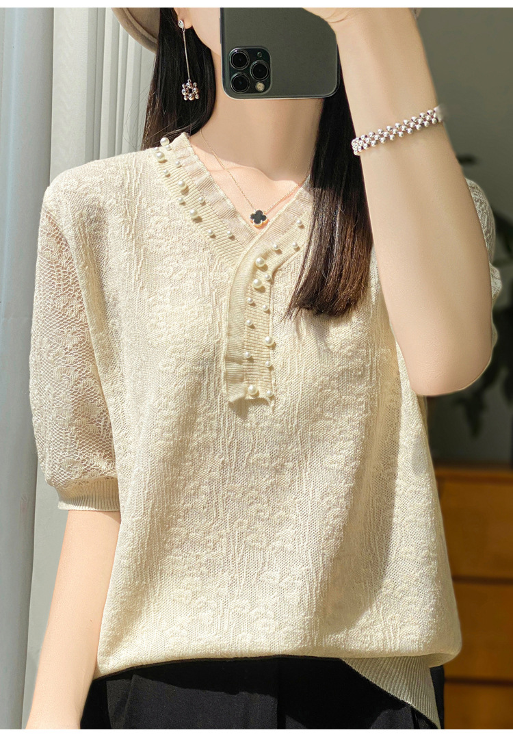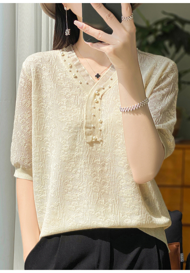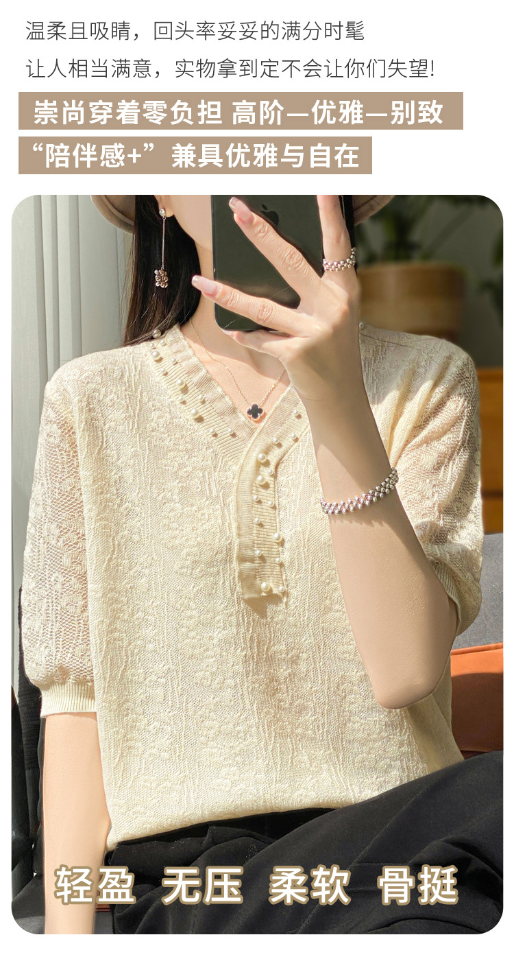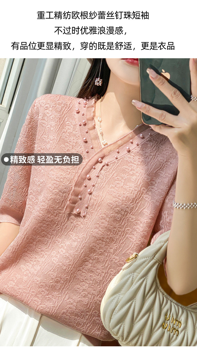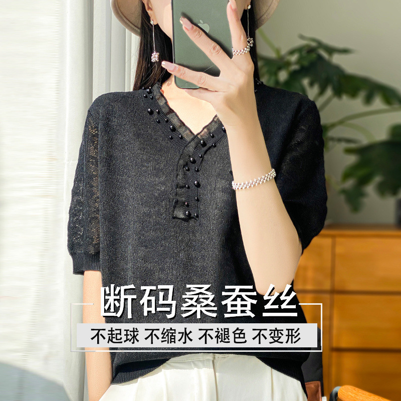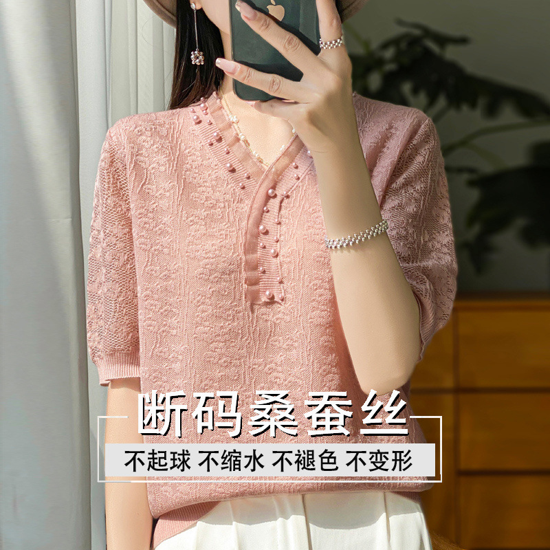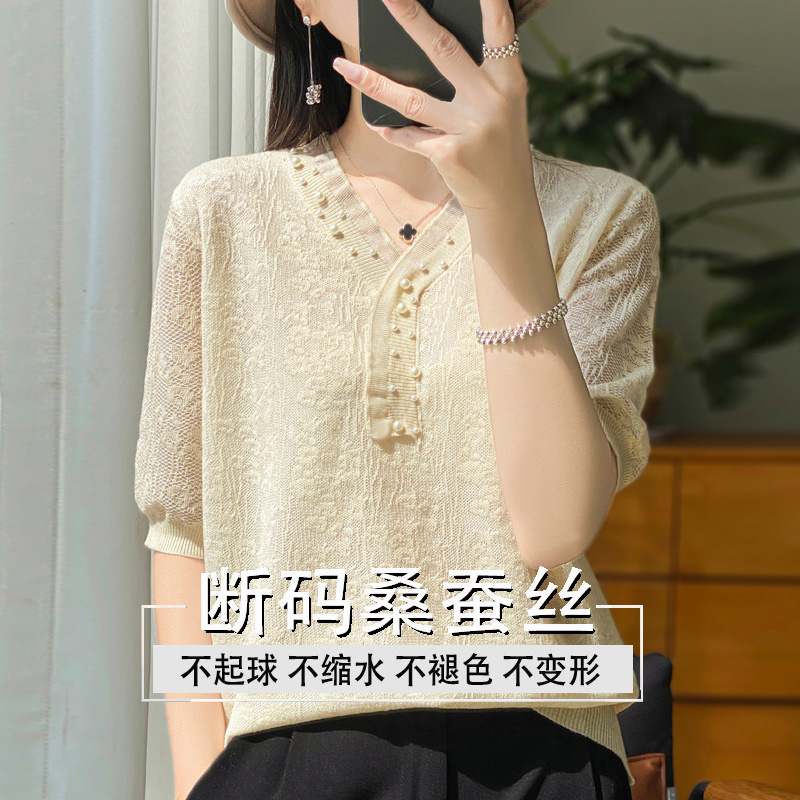 Jianzhi Wo 여름 원피스 멀 베리 실크 반팔 티셔츠 여성 탑 뉴 루즈 서양식 V 넥 얇은 레이스 엣지 니트 스웨터스토어 가기