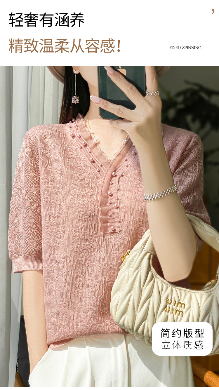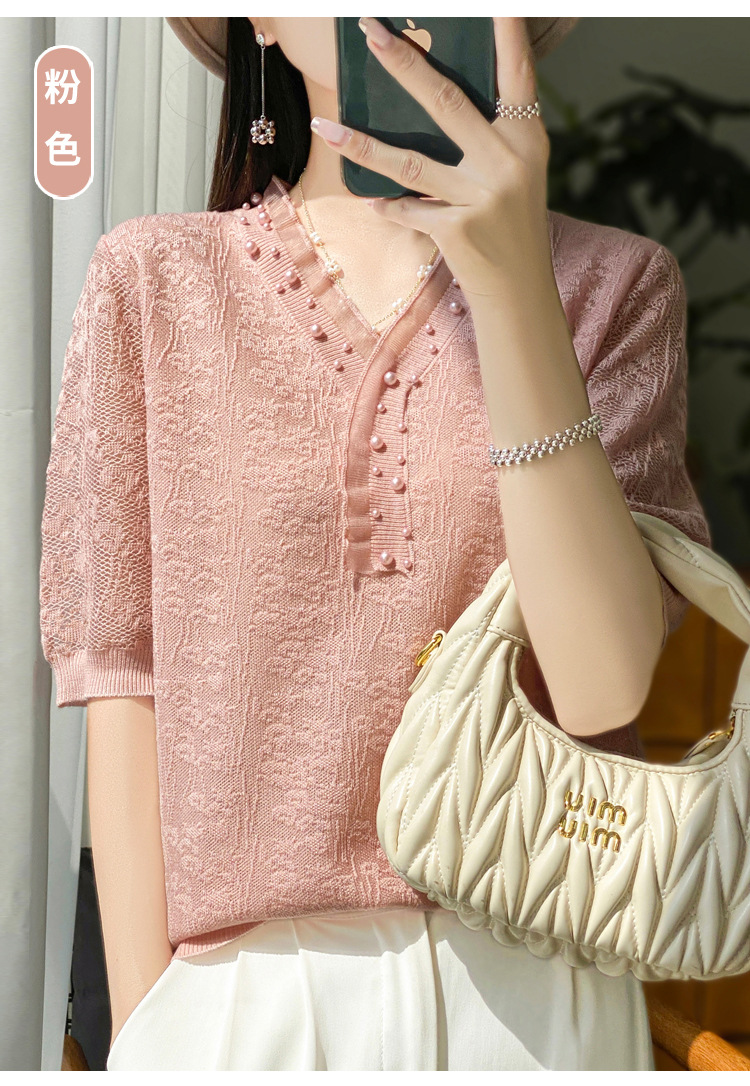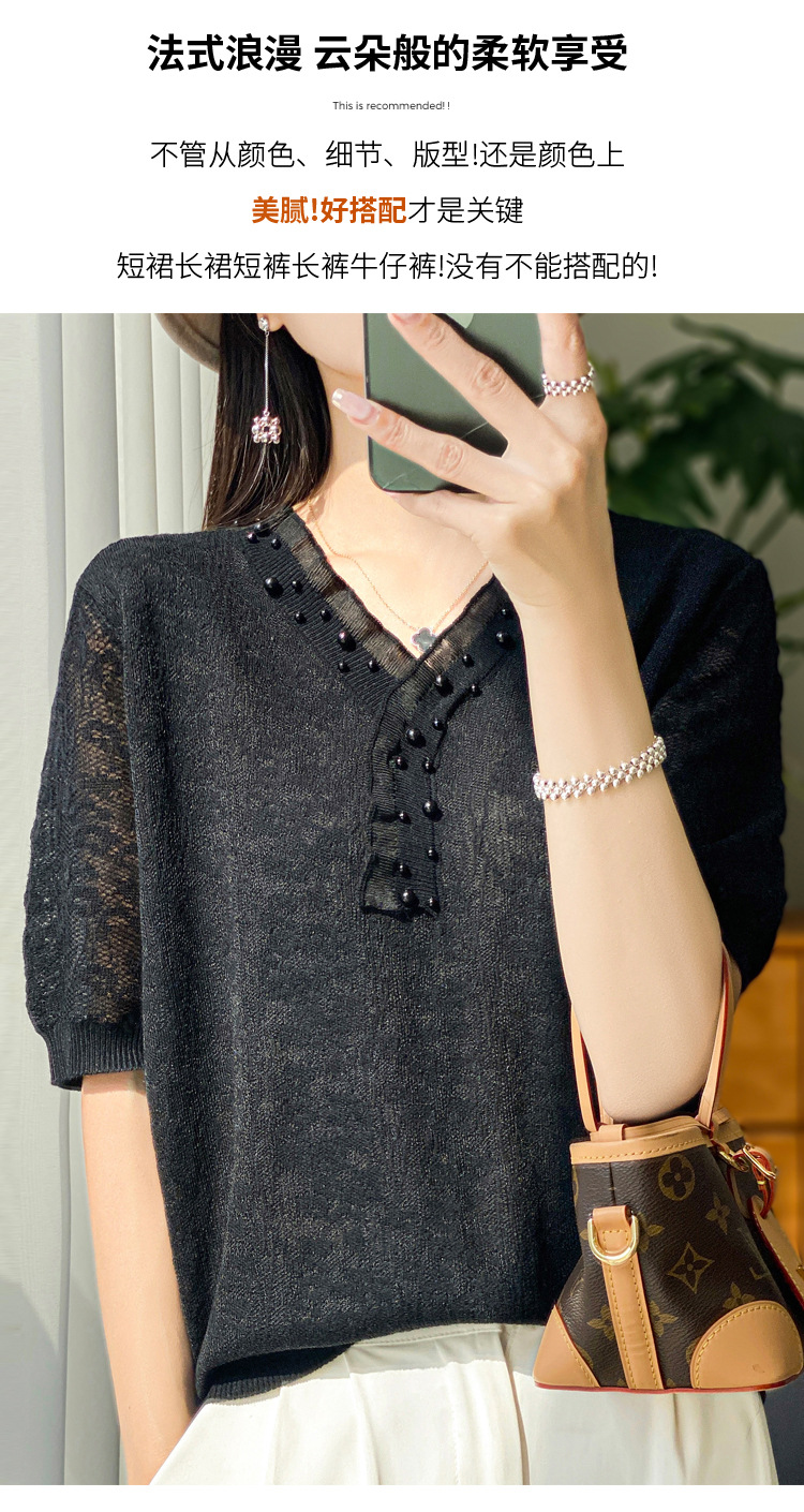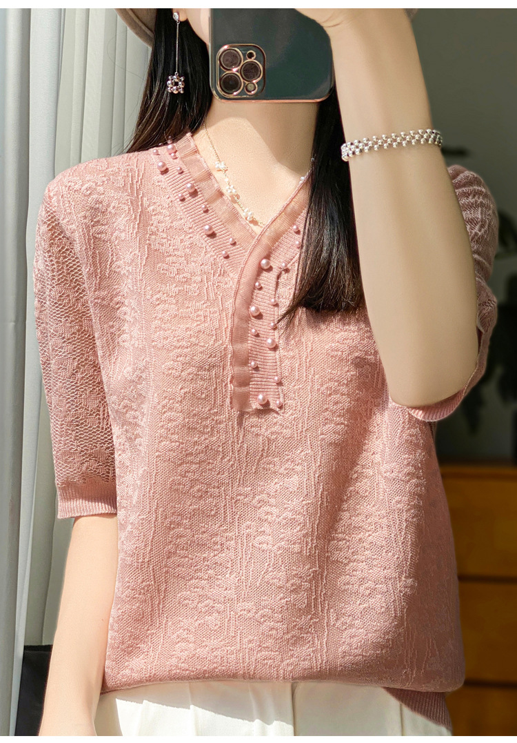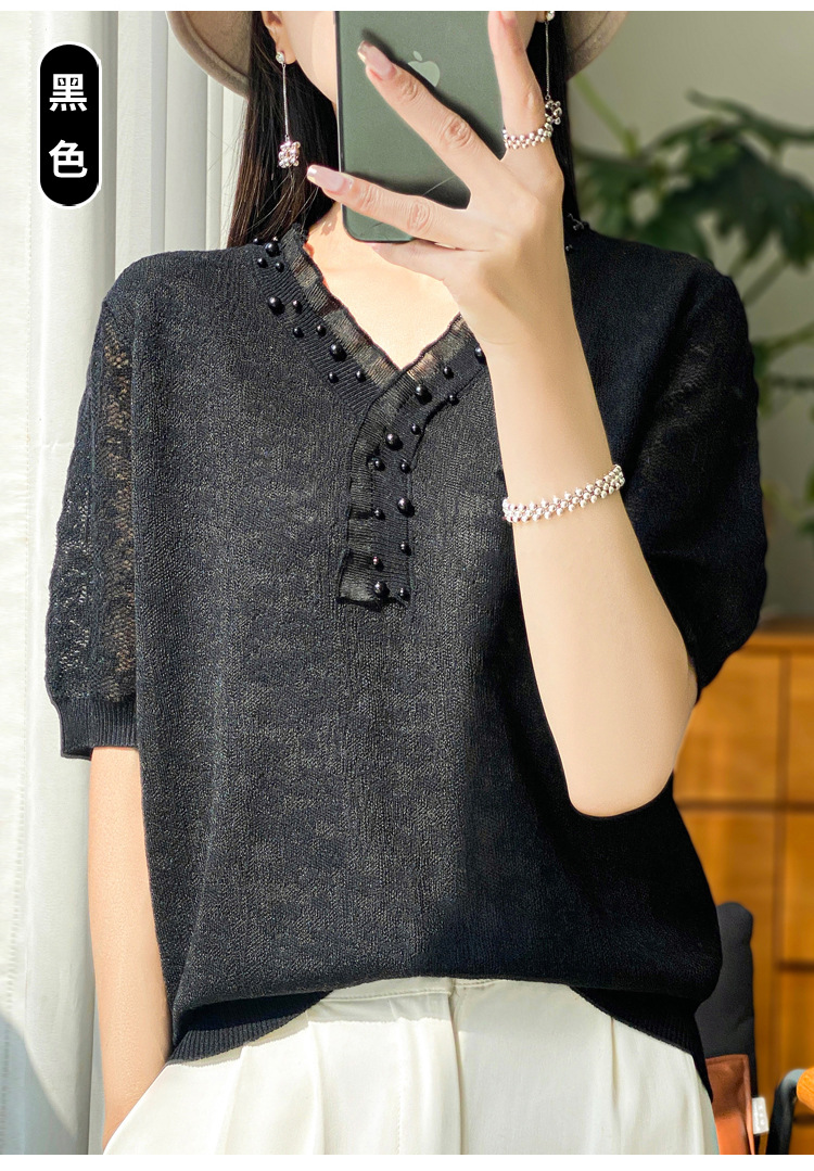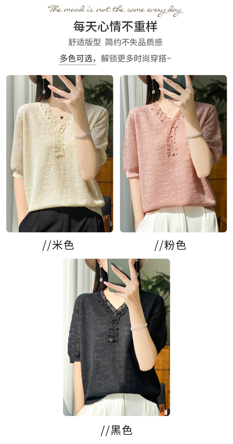 Jianzhi Wo 여름 원피스 멀 베리 실크 반팔 티셔츠 여성 탑 뉴 루즈 서양식 V 넥 얇은 레이스 엣지 니트 스웨터스토어 가기