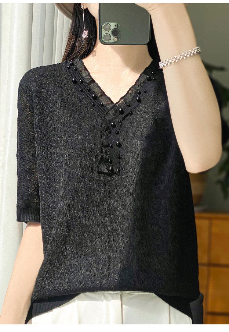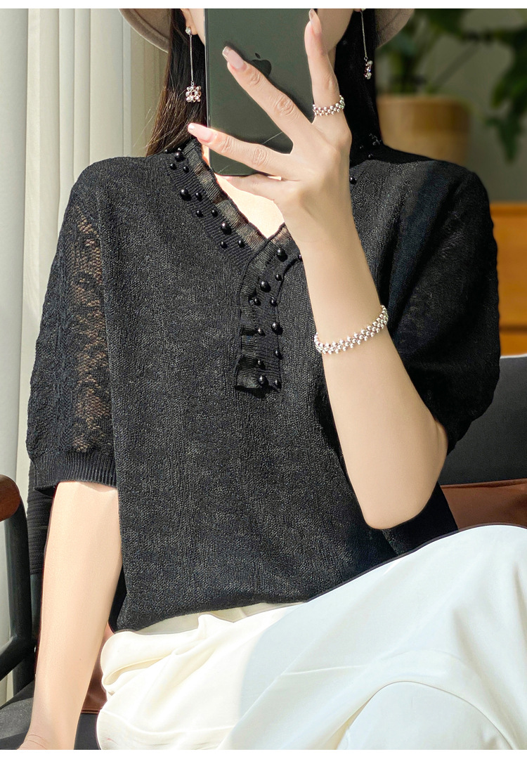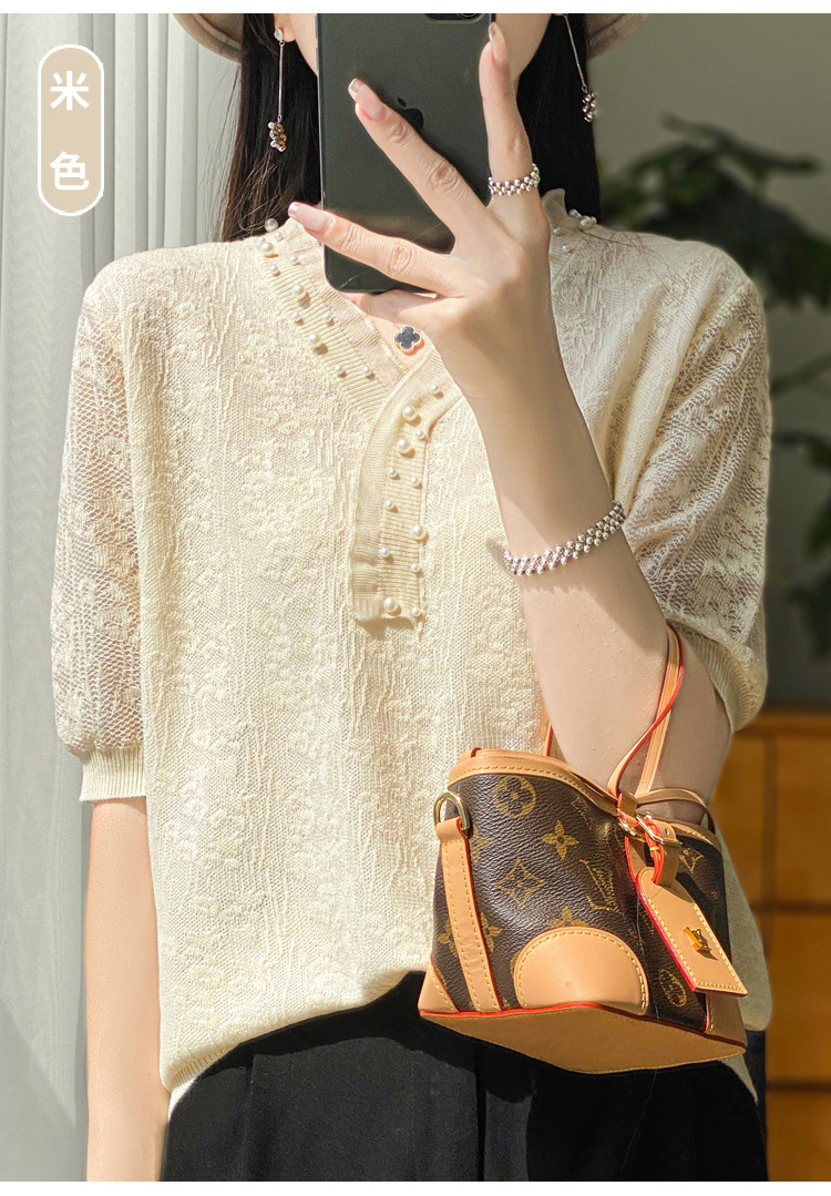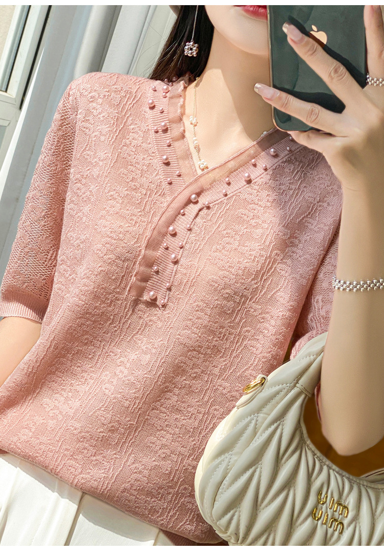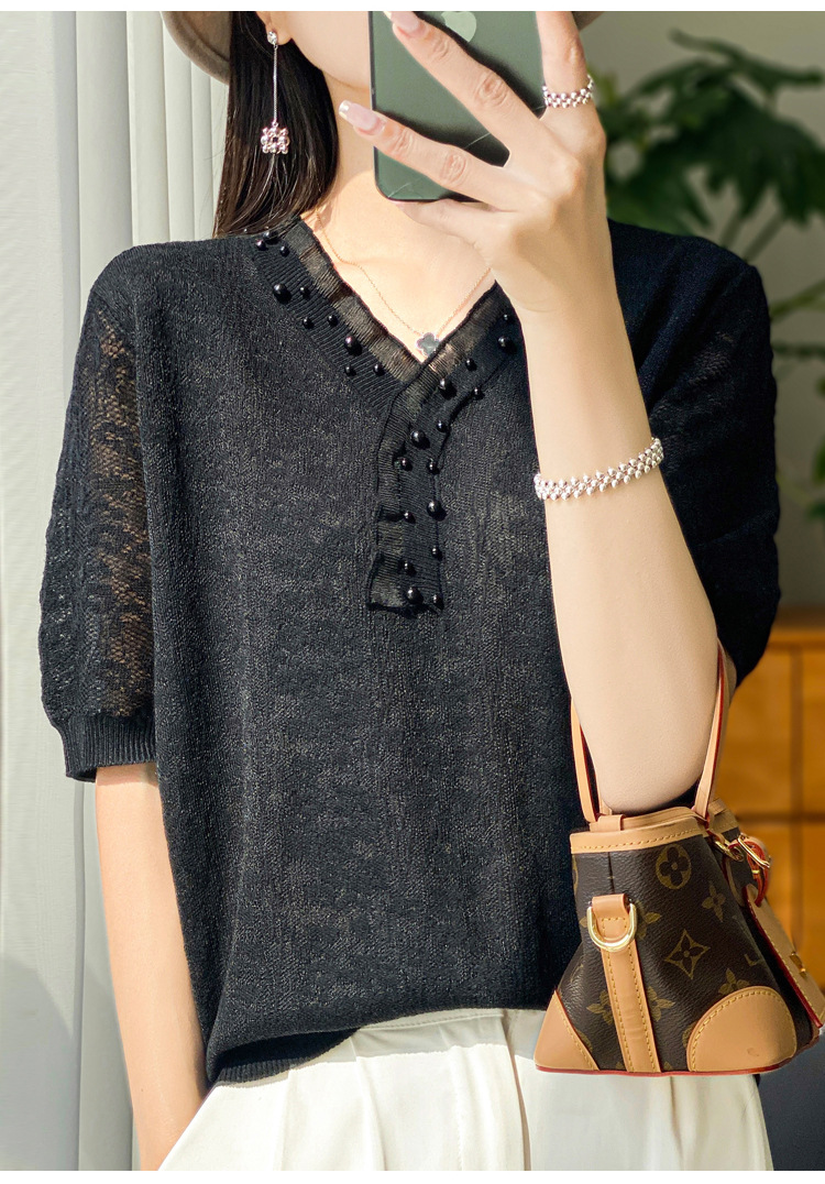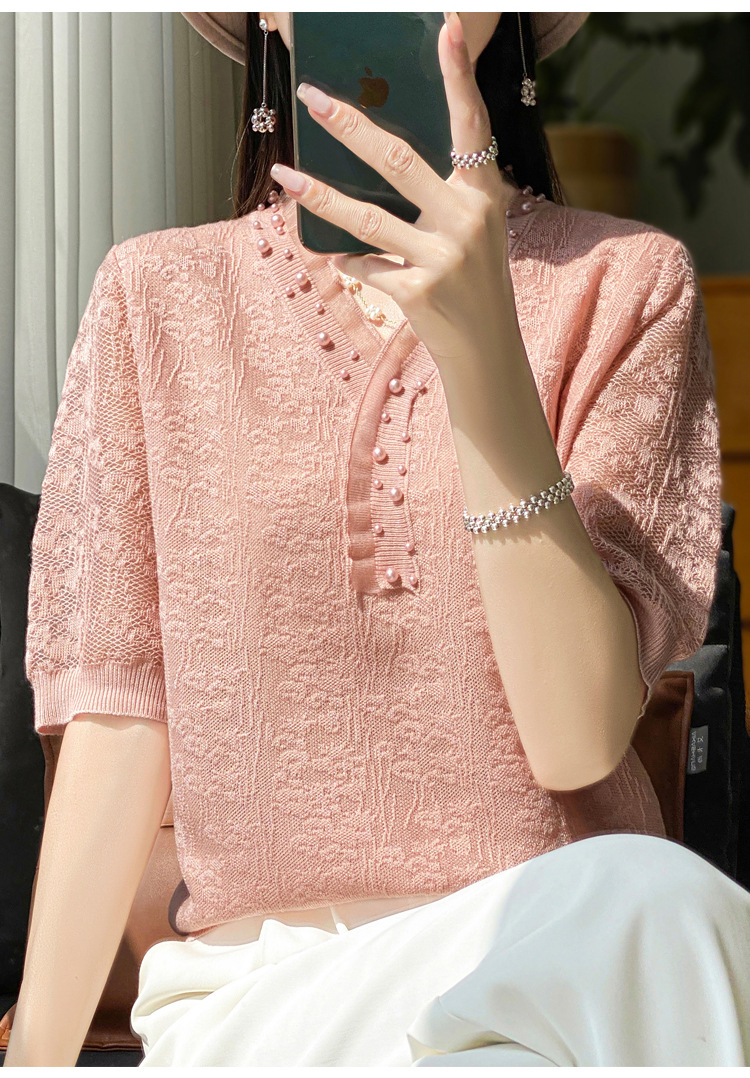 Jianzhi Wo 여름 원피스 멀 베리 실크 반팔 티셔츠 여성 탑 뉴 루즈 서양식 V 넥 얇은 레이스 엣지 니트 스웨터스토어 가기