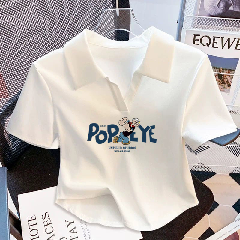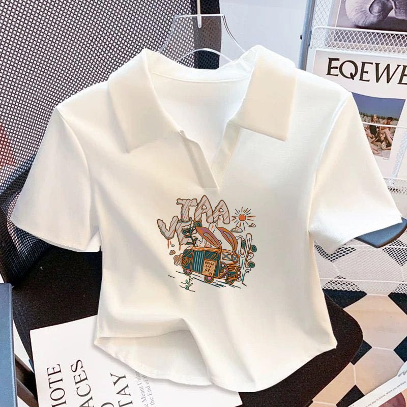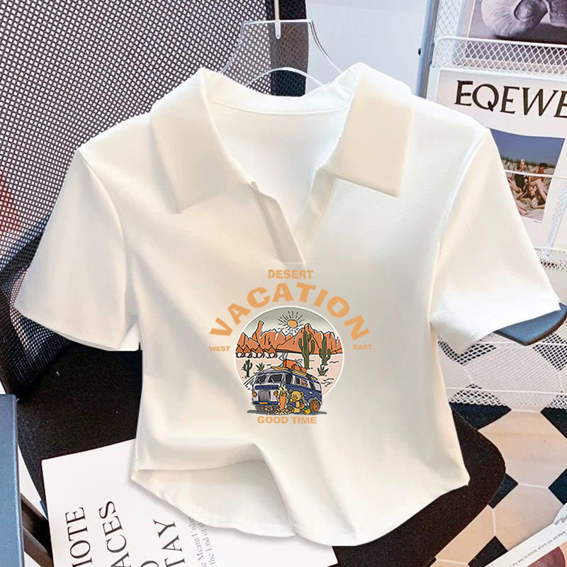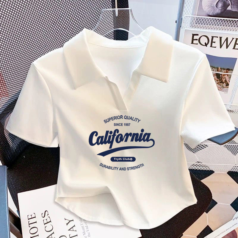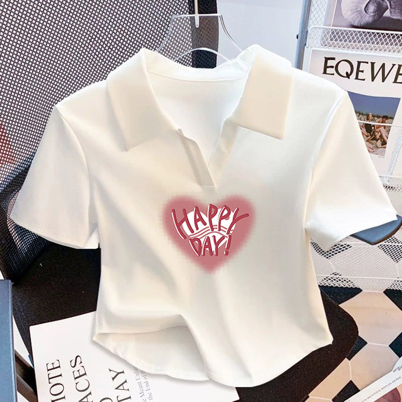 코튼 화이트 폴로 옷깃 슬림 핏 스레드 반팔 티셔츠 여자 여름 프랑스 우아한 V 넥 쇼트 올 매치 탑