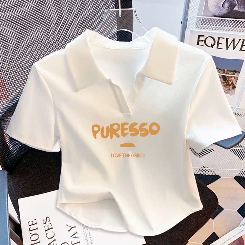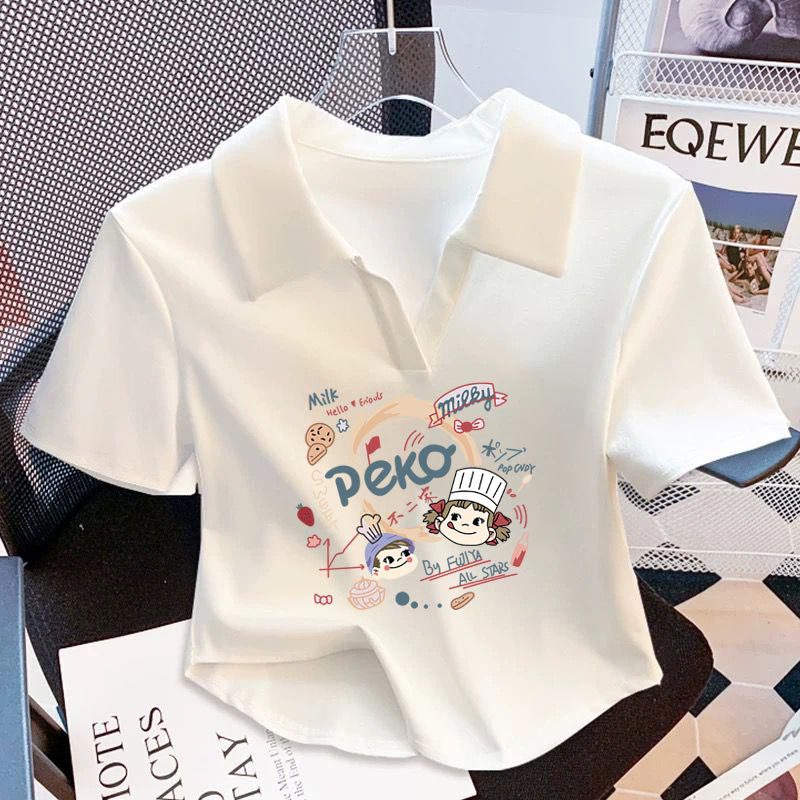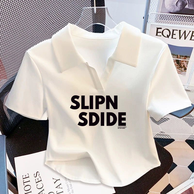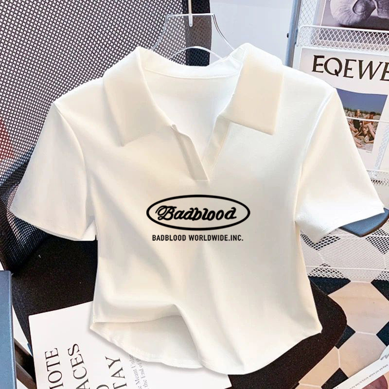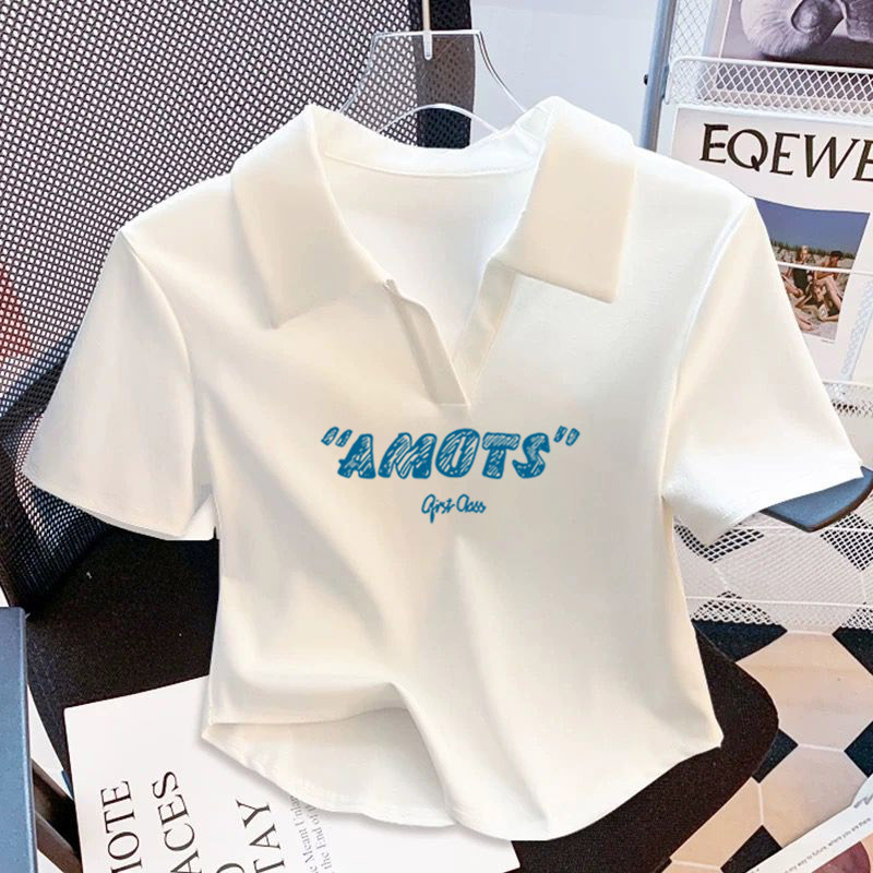코튼 화이트 폴로 옷깃 슬림 핏 스레드 반팔 티셔츠 여자 여름 프랑스 우아한 V 넥 쇼트 올 매치 탑스토어 가기